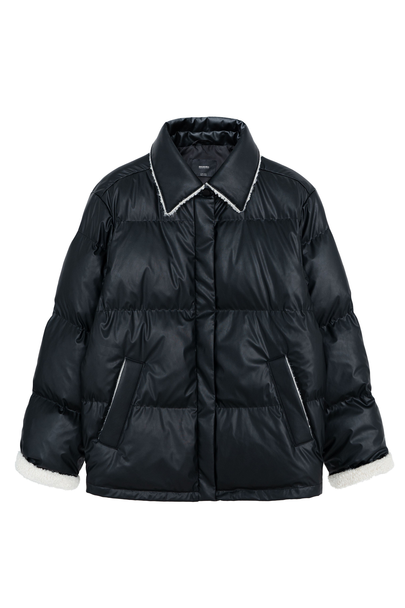 Утепленый пуховик из экокожи. Модель свободного силуэта с боковыми карманами и воротником-стойкой. Застежка на потайную молнию и кнопки. На подкладке.
