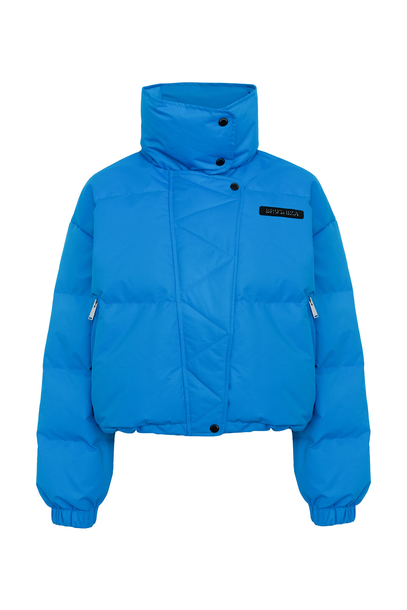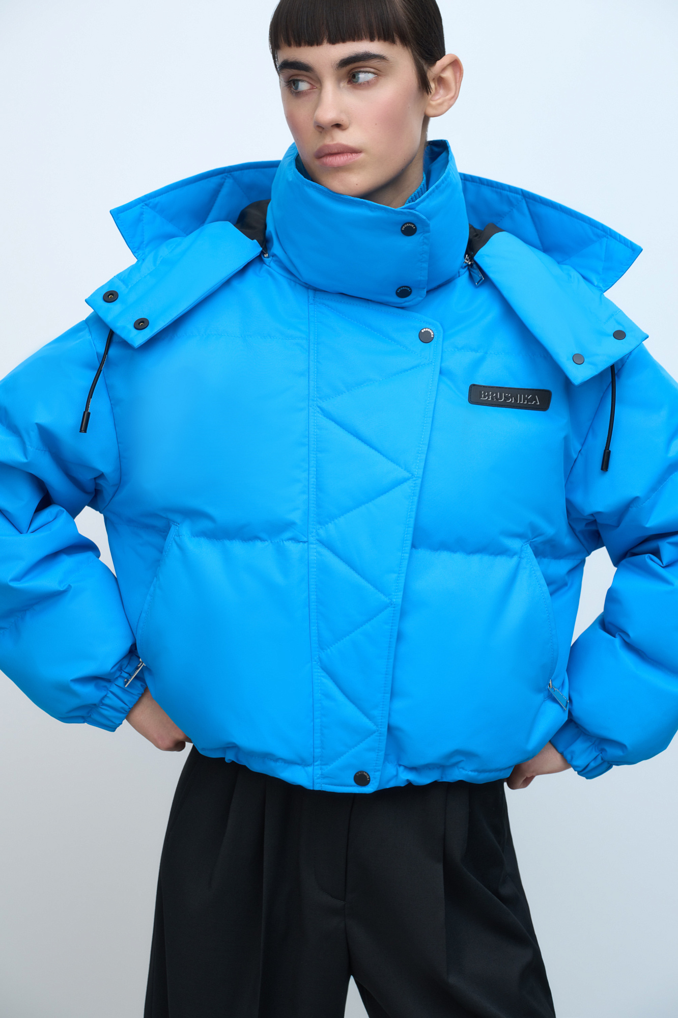 Короткий пуховик с воротником-стойкой и капюшоном на молнии. Модель свободного силуэта с боковыми карманами, спущенным плечом и брендированным ярлыком на груди. Застежка на потайную молнию и кнопки. Наполнитель натуральный пух 90% перо 10%.