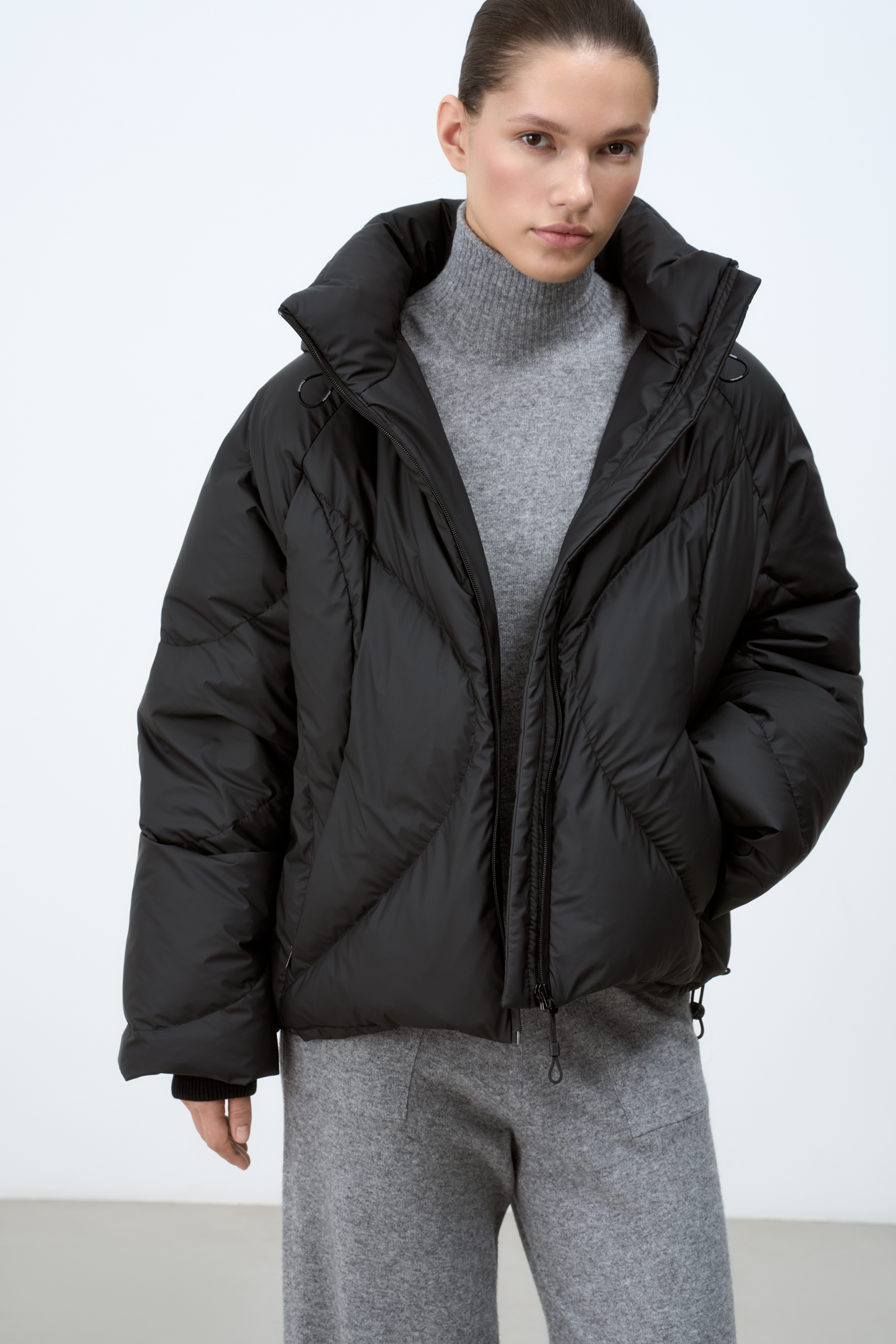 Куртка на пуху с регулируемой кулиской по краям. Модель свободного силуэта с воротником-стойкой, капюшоном и манжетами на резинке. Капюшон и низ изделия на кулиске. На подкладке. Застежка на молнию.