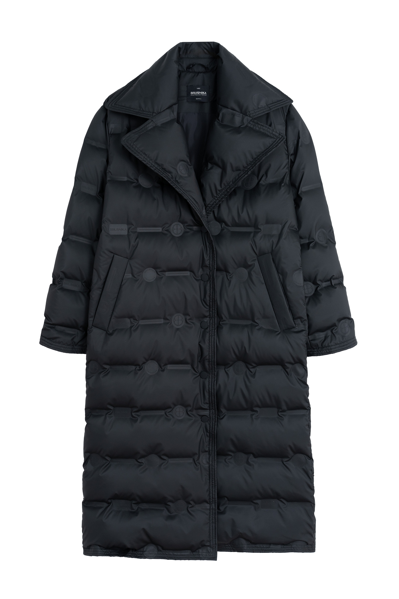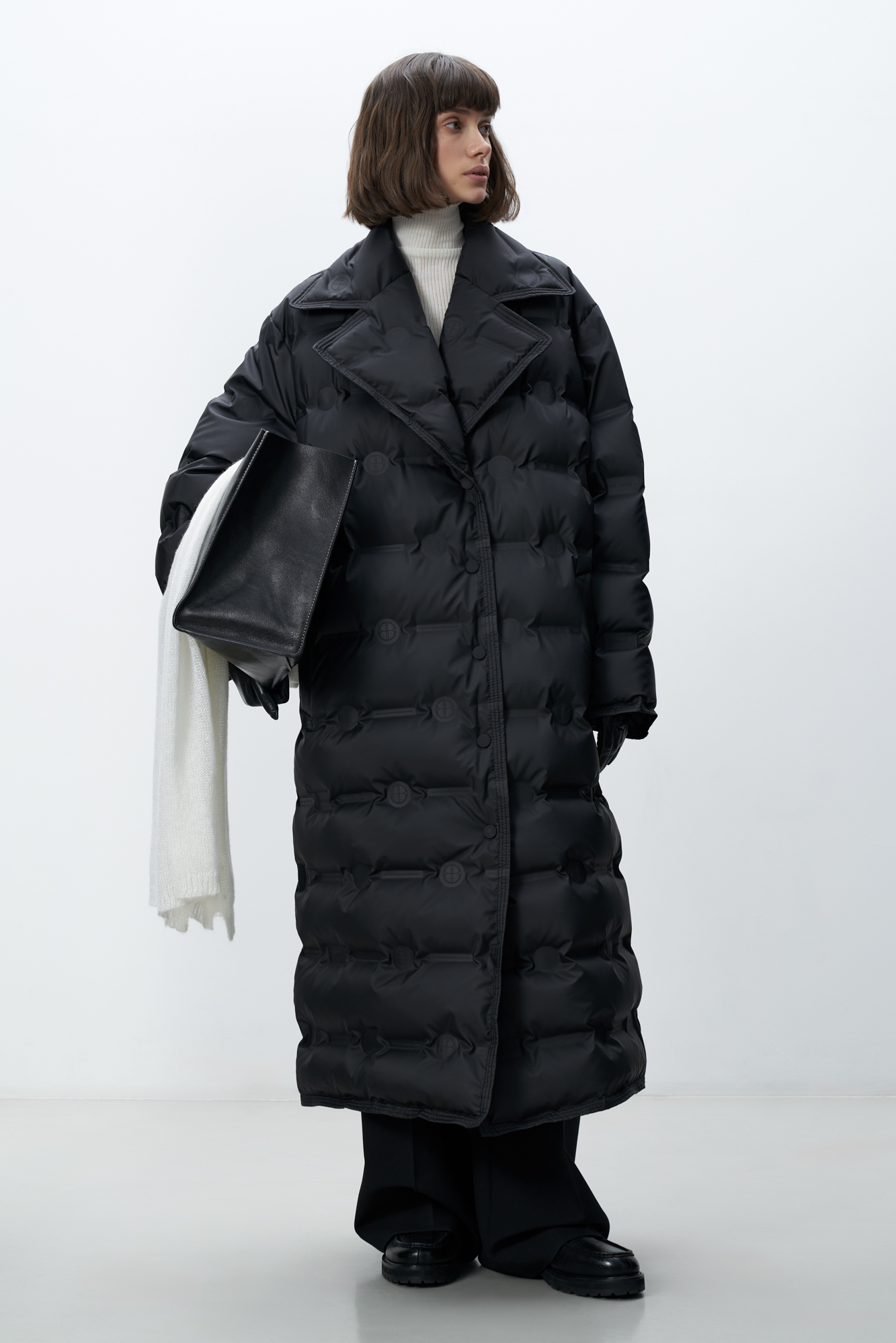 Длинный пуховик с брендированным тиснением. Модель свободного силуэта с широким отложным воротником без капюшона. Застежка на пуговицы. Изделие на подкладке.