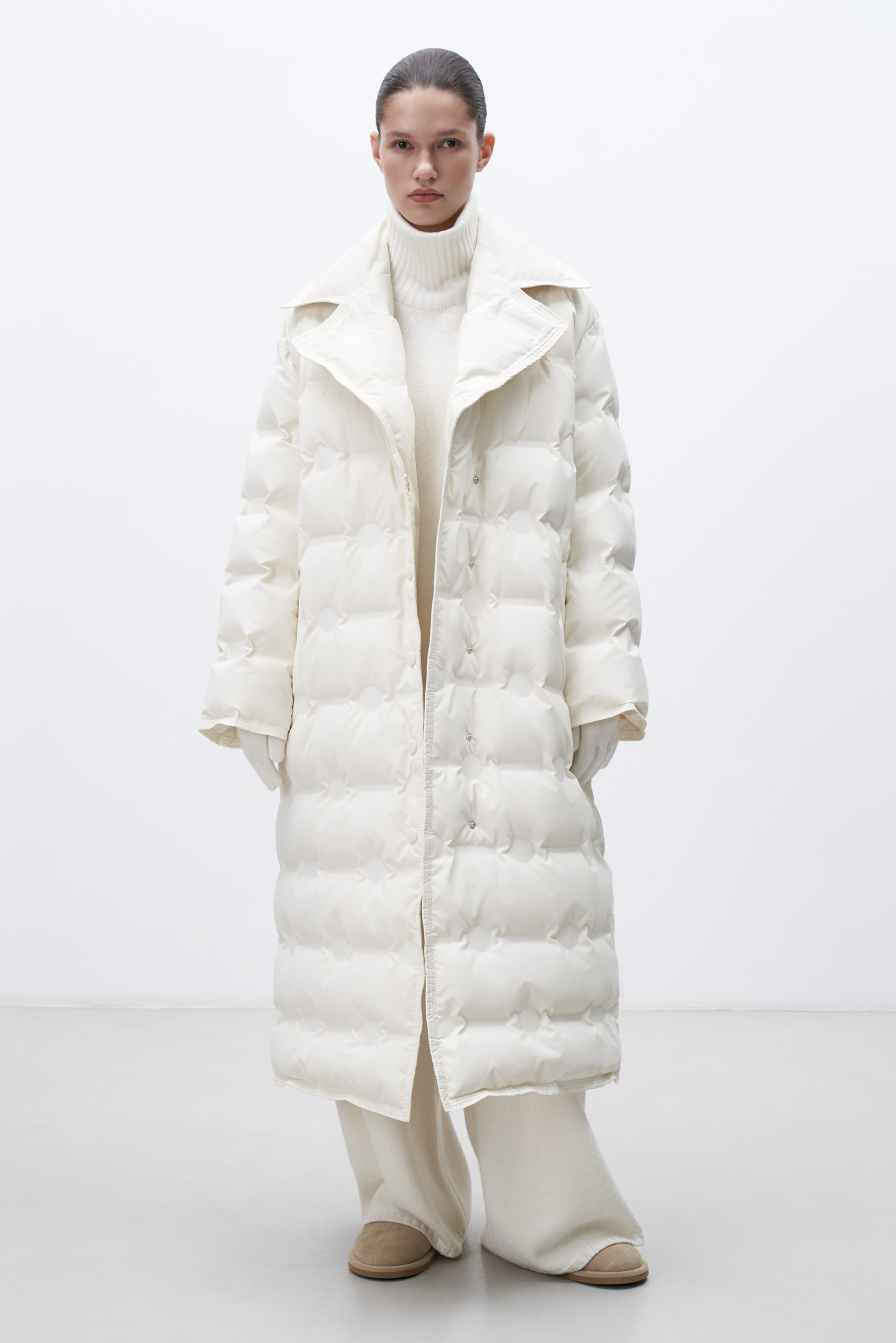 Длинный пуховик с брендированным тиснением. Модель свободного силуэта с широким отложным воротником без капюшона. Застежка на пуговицы. Изделие на подкладке.