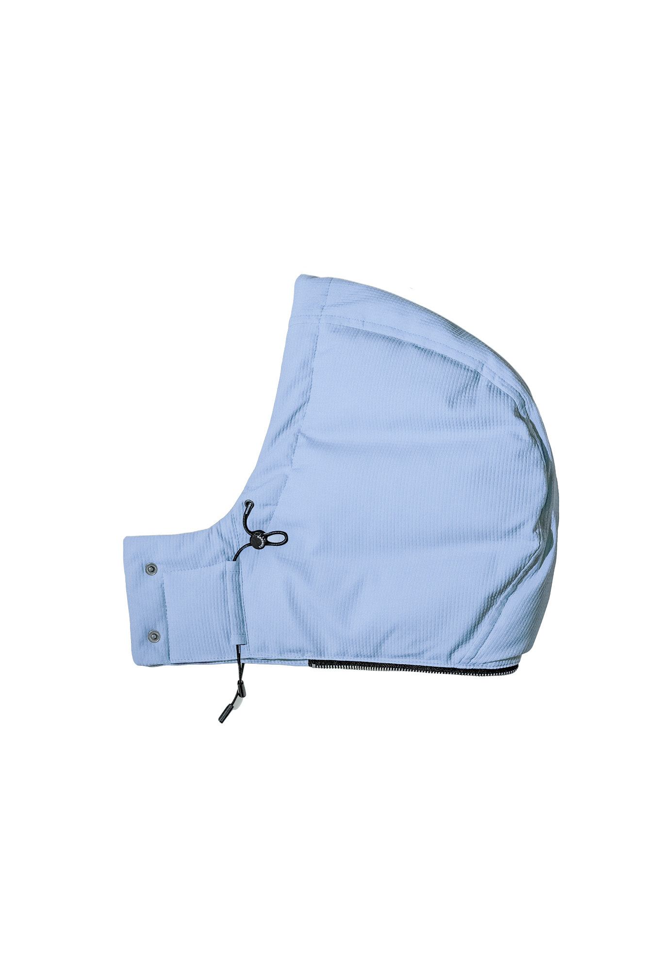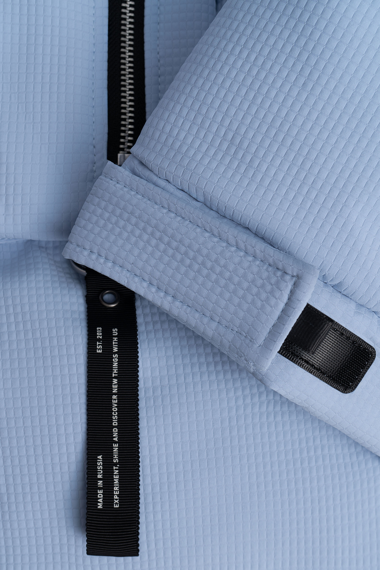 Пуховик с двумя накладными карманами, воротником-стойкой и капюшоном. Застежка на молнию под планкой. Низ изделия выполнен на регулируемой кулиске. На подкладке.