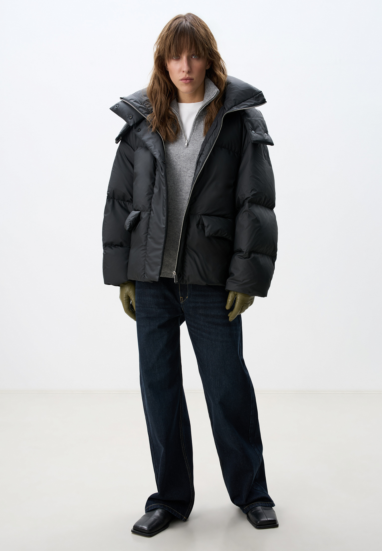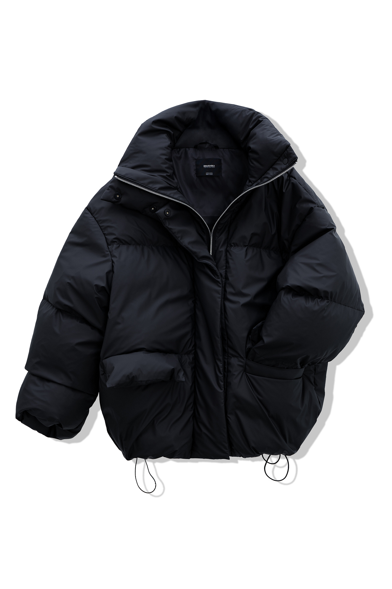 Пуховик с двумя накладными карманами, воротником-стойкой и капюшоном. Застежка на молнию под планкой. Низ изделия выполнен на регулируемой кулиске. На подкладке.