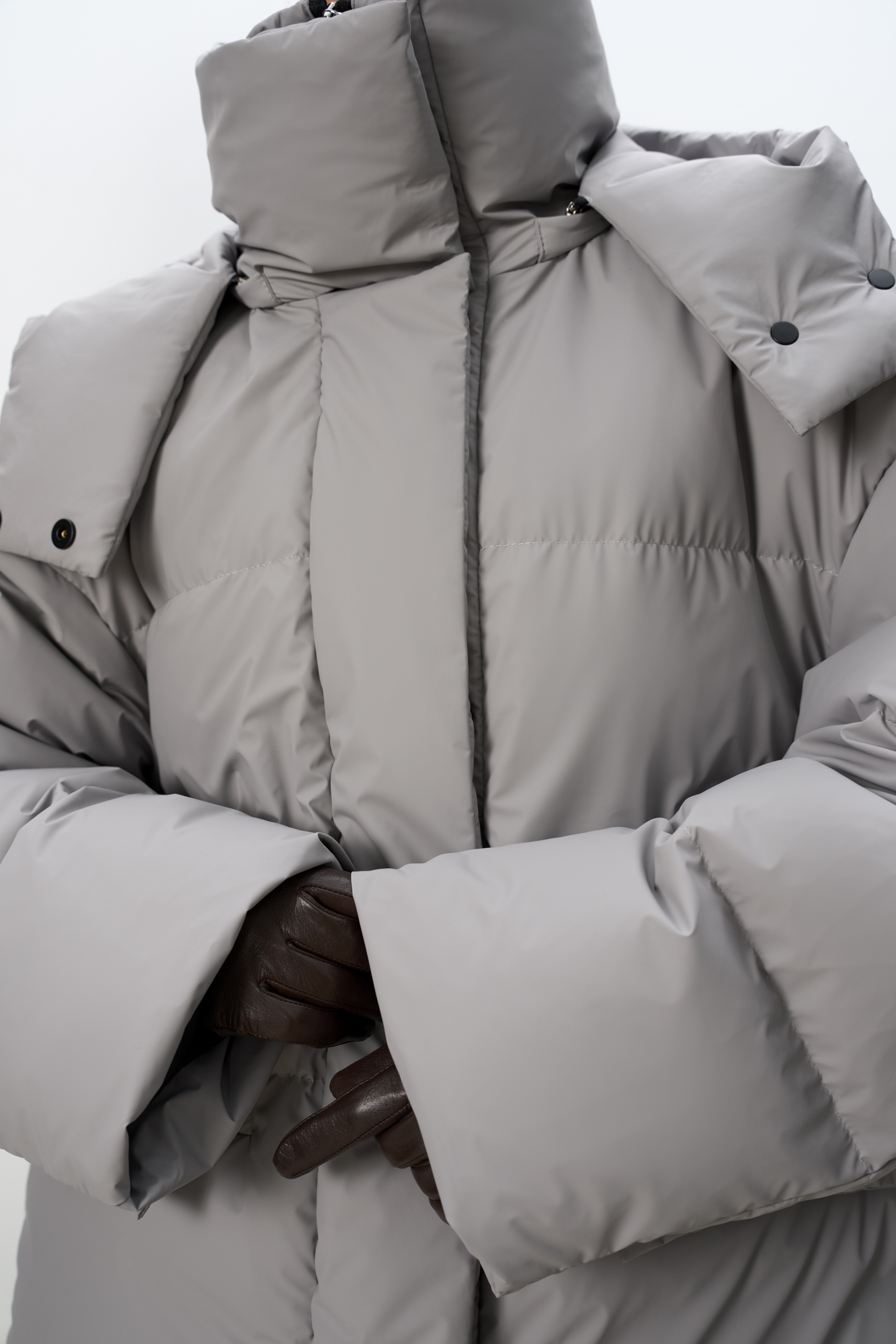 Пуховик с двумя накладными карманами, воротником-стойкой и капюшоном. Застежка на молнию под планкой. Низ изделия выполнен на регулируемой кулиске. На подкладке.