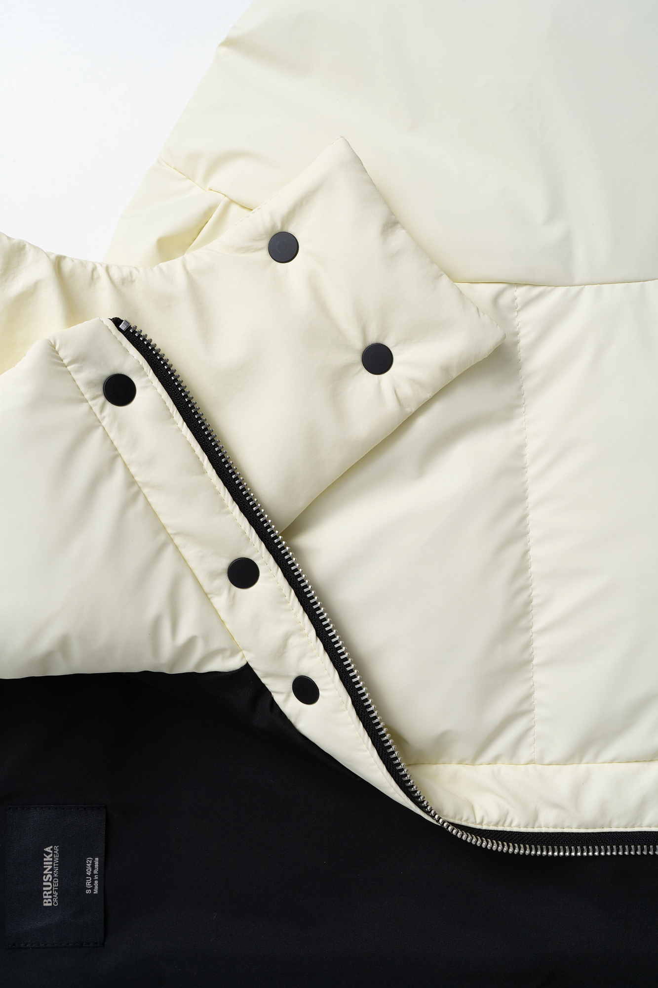 Пуховик с двумя накладными карманами, воротником-стойкой и капюшоном. Застежка на молнию под планкой. Низ изделия выполнен на регулируемой кулиске. На подкладке.