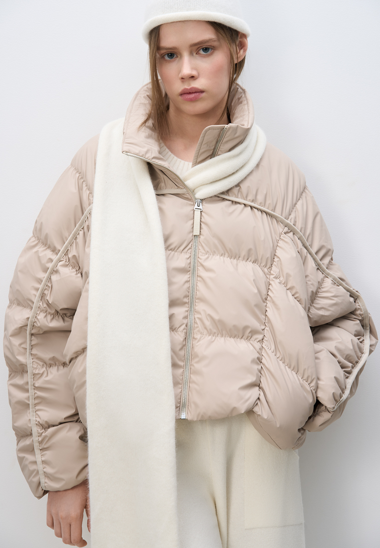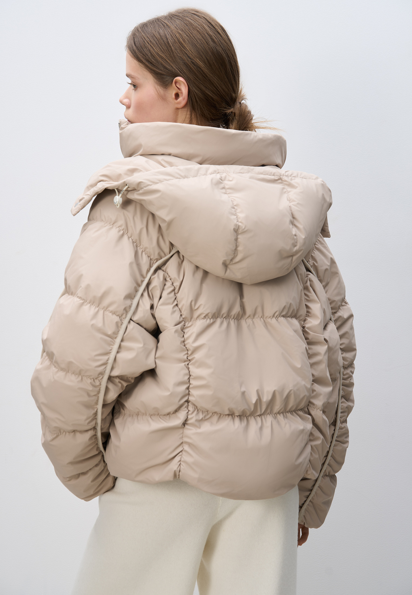 Объемный пуховик с геометрической стежкой и объемными швами. Изделие с капюшоном на кулиске и воротником-стойкой.