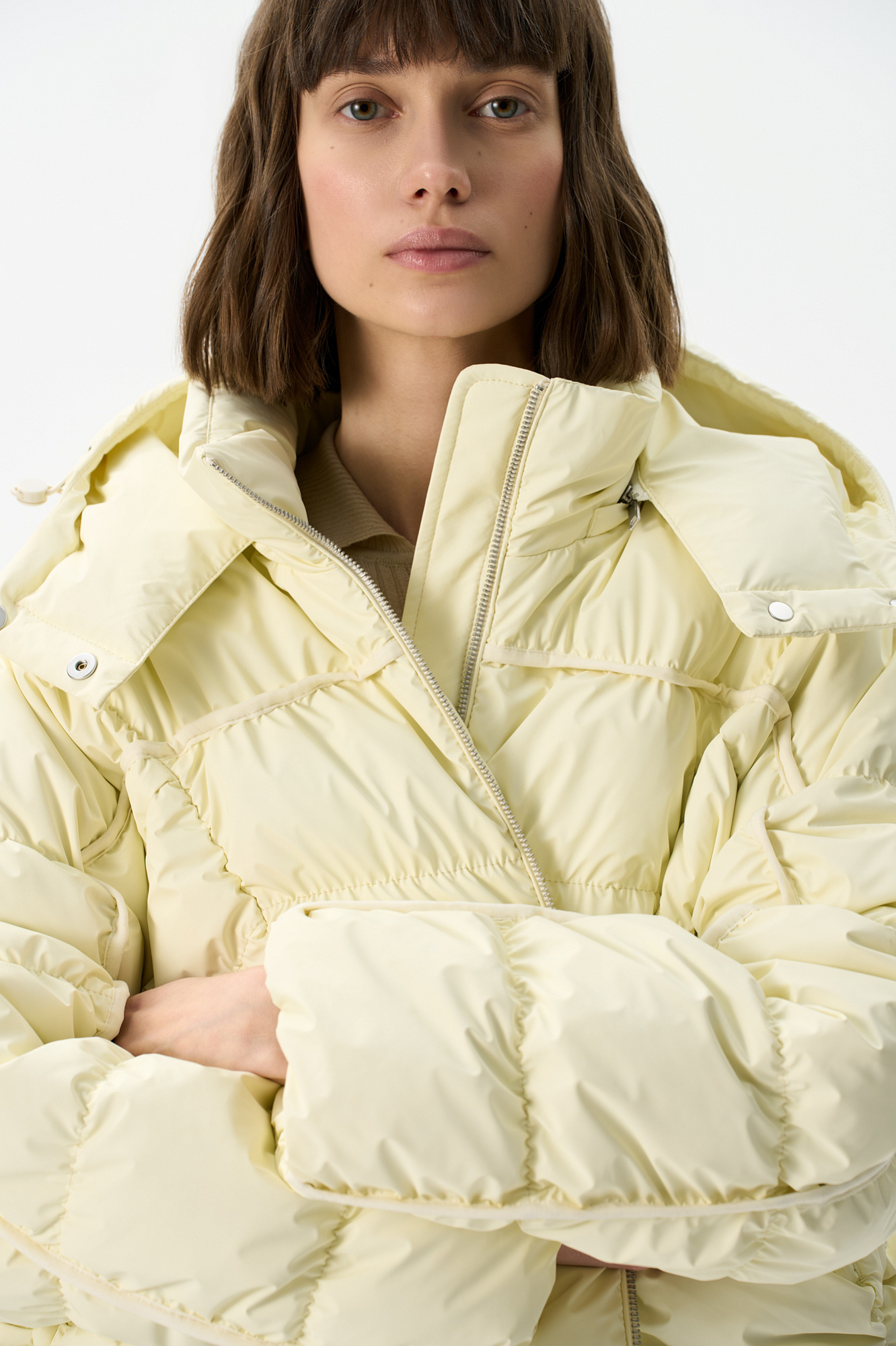 Объемный пуховик с геометрической стежкой и объемными швами. Изделие с капюшоном на кулиске и воротником-стойкой.