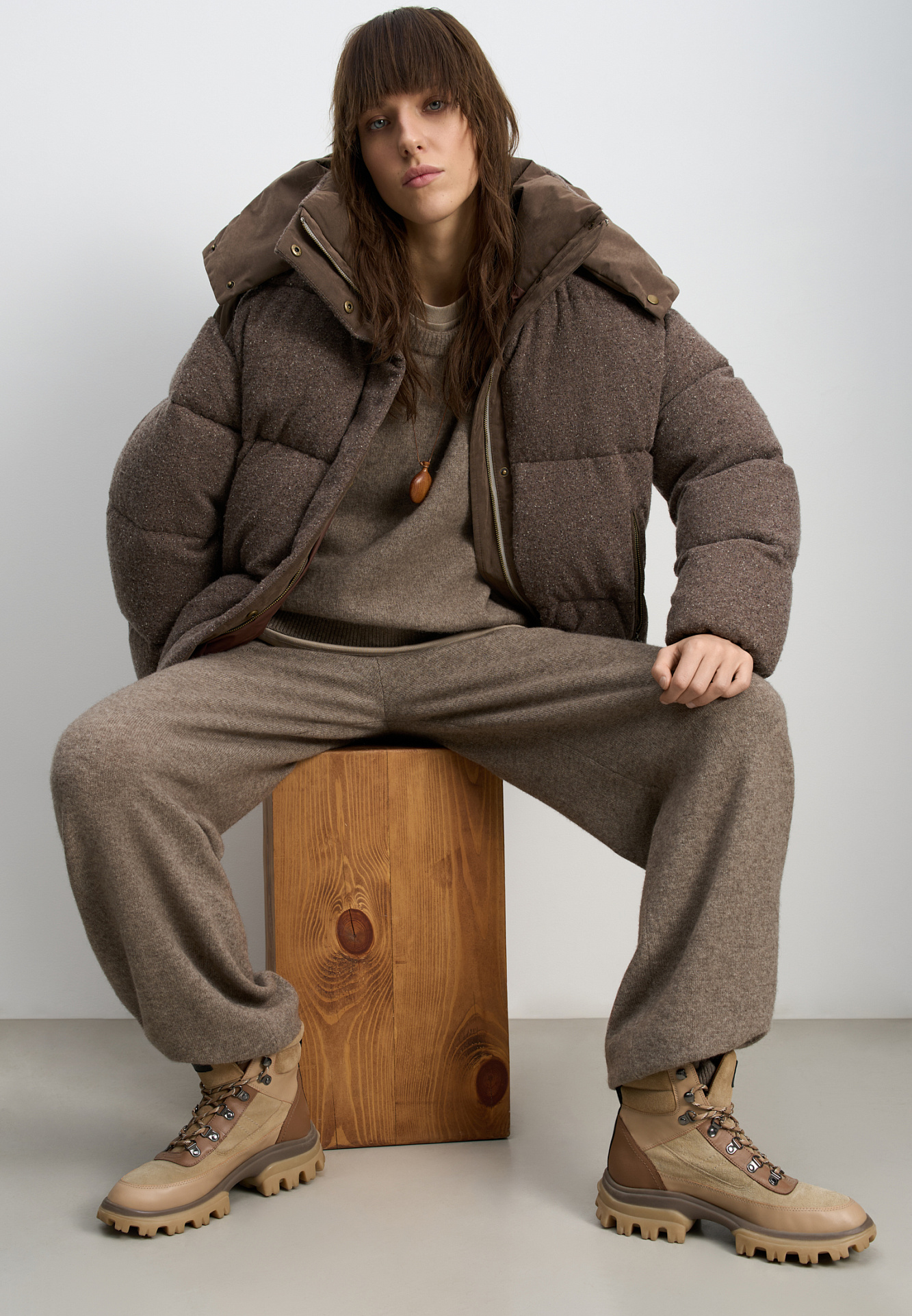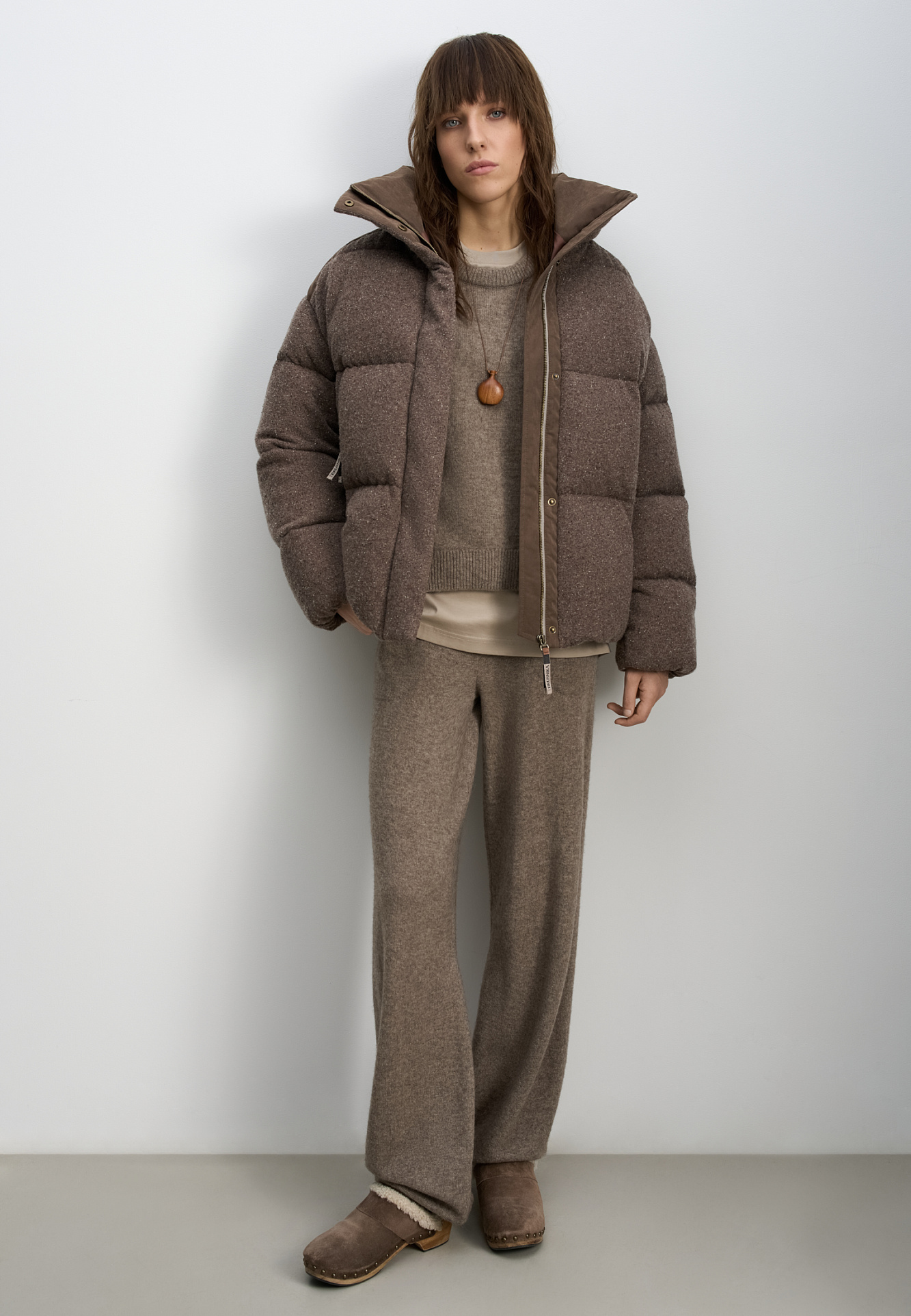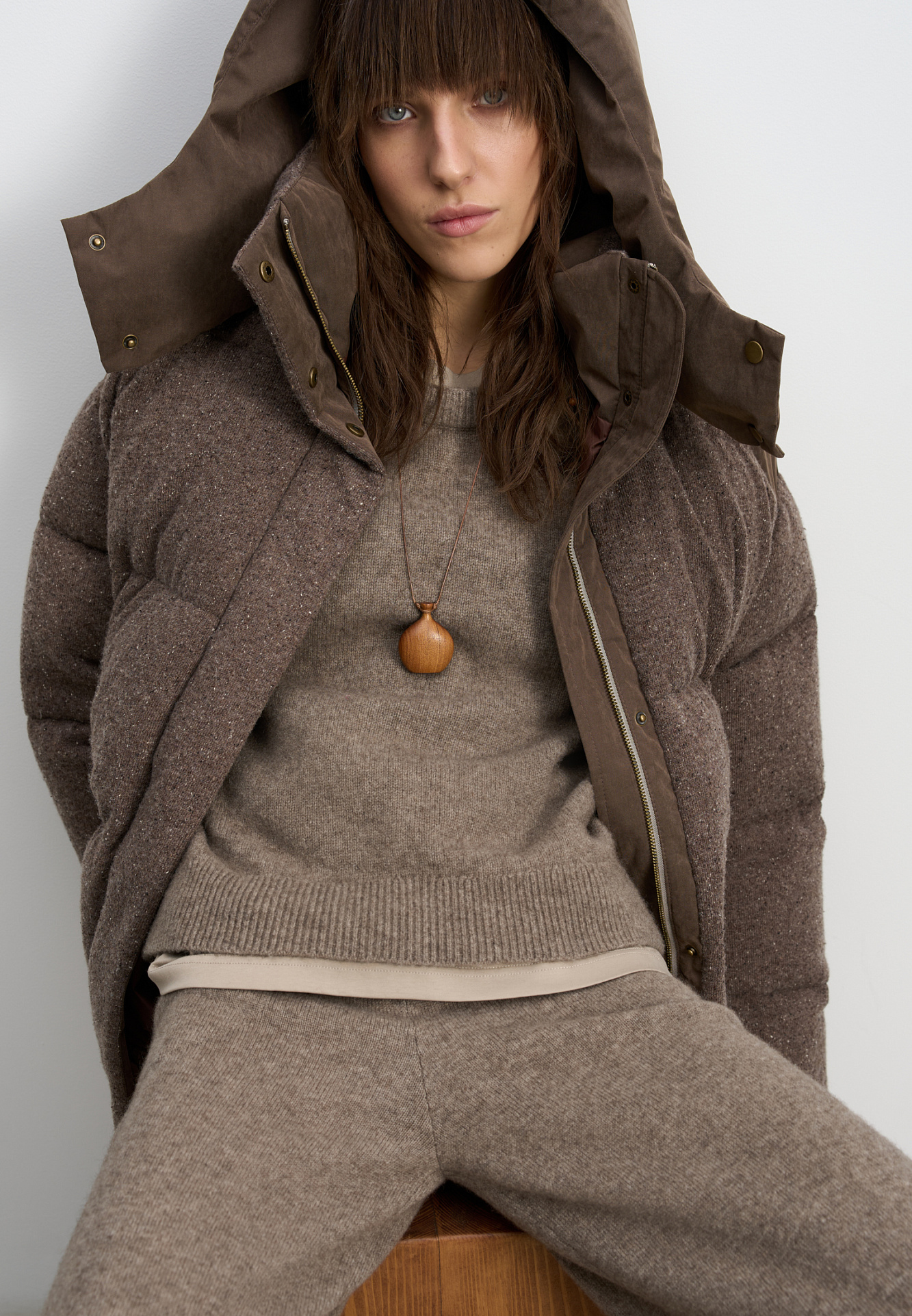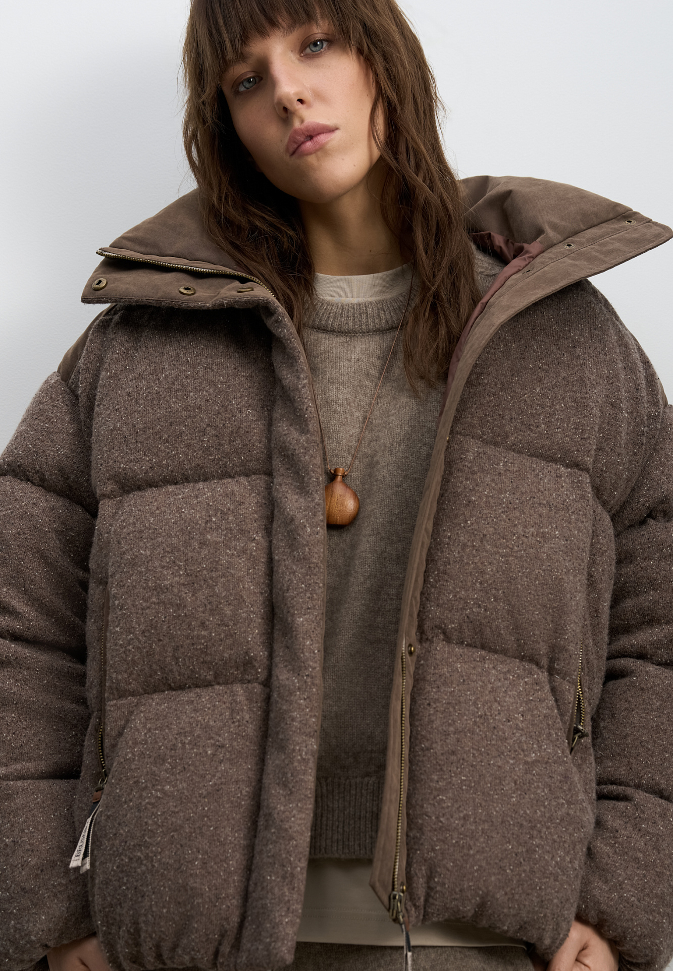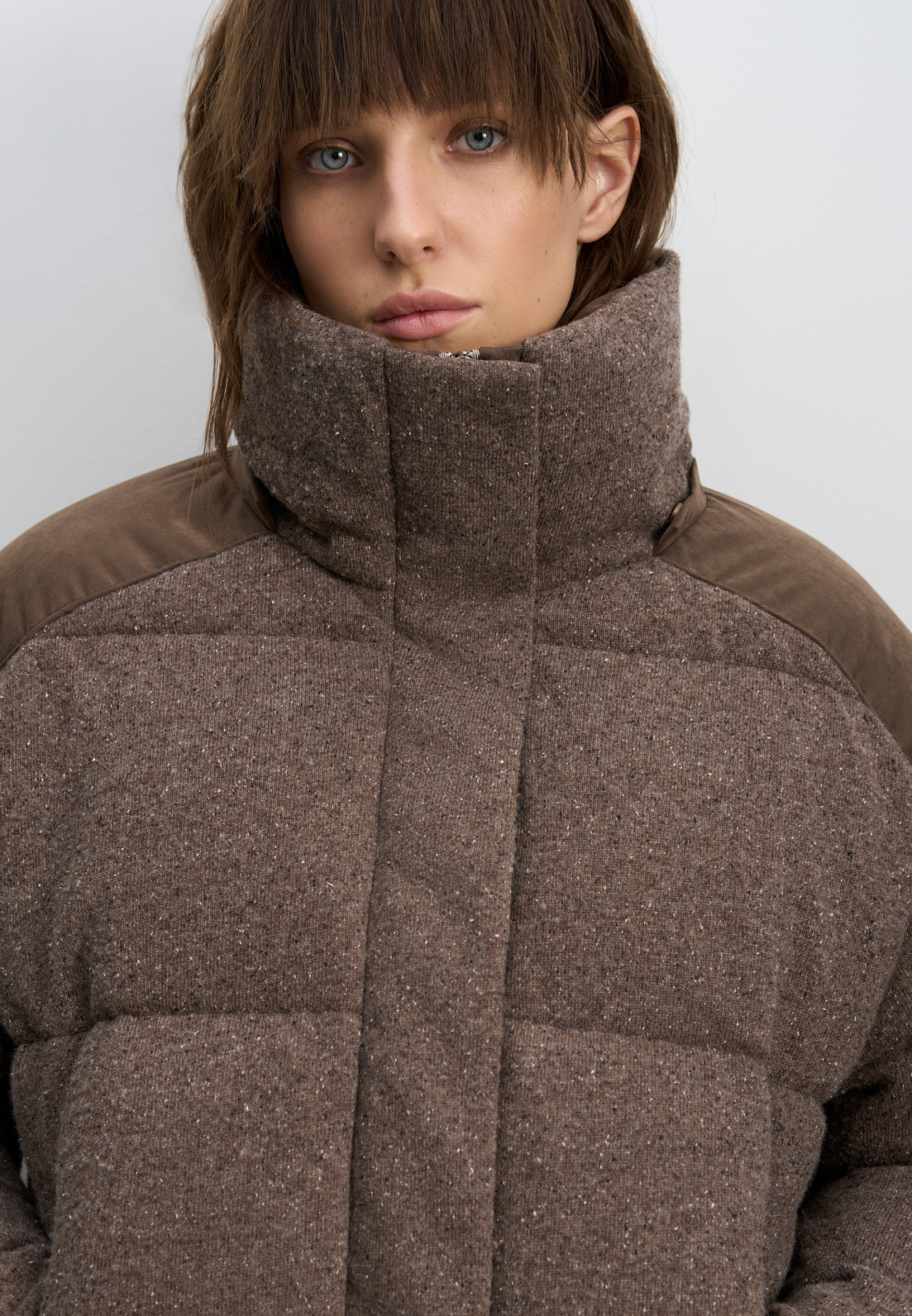 Трикотажный пуховик из шерсти с добавлением вискозы и шелка. Модель свободного силуэта с воротником-стойкой, капюшоном и карманами на молниях. Застежка на молнию под планкой с кнопками.