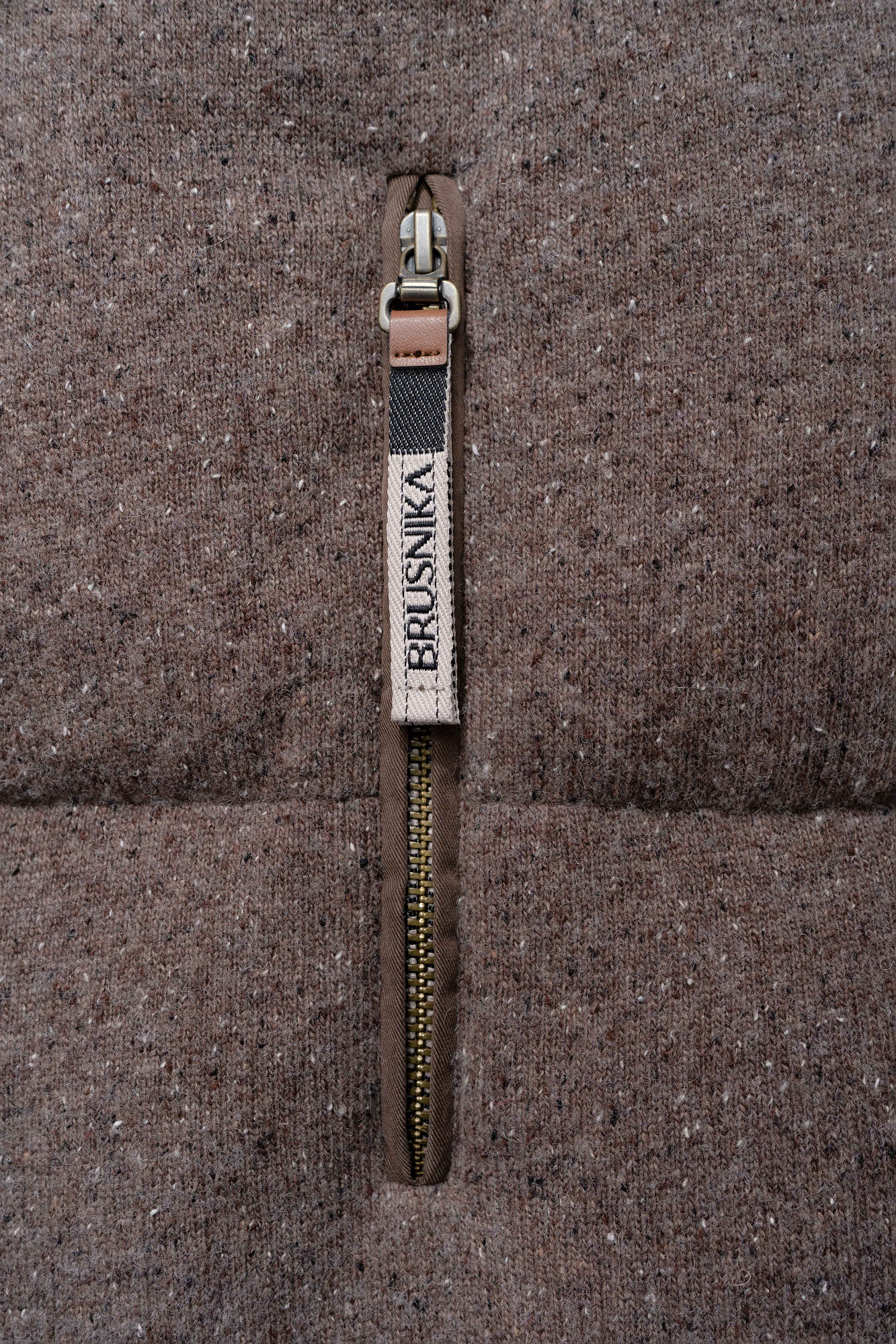 Трикотажный пуховик из шерсти с добавлением вискозы и шелка на пуху. Модель свободного силуэта, с воротником-стойкой, капюшоном и карманами на молниях. Застежка на молнию под планкой с кнопками.