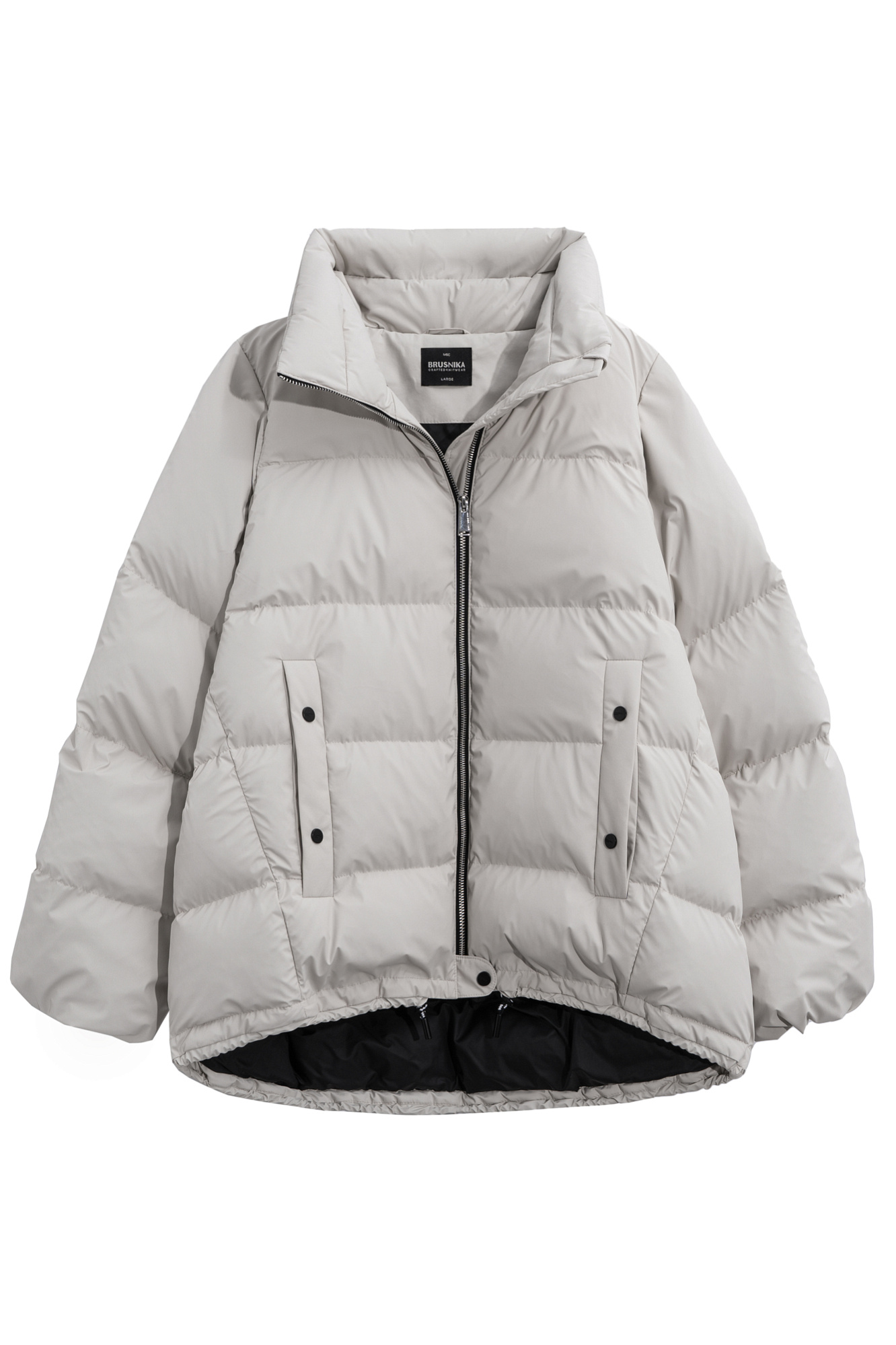 Объемный стеганый пуховик. Модель свободного силуэта с боковыми карманами на кнопках, воротником-стойкой и капюшоном. Низ изделия выполнен на регулируемой кулиске. Застежка на молнию и кнопку.