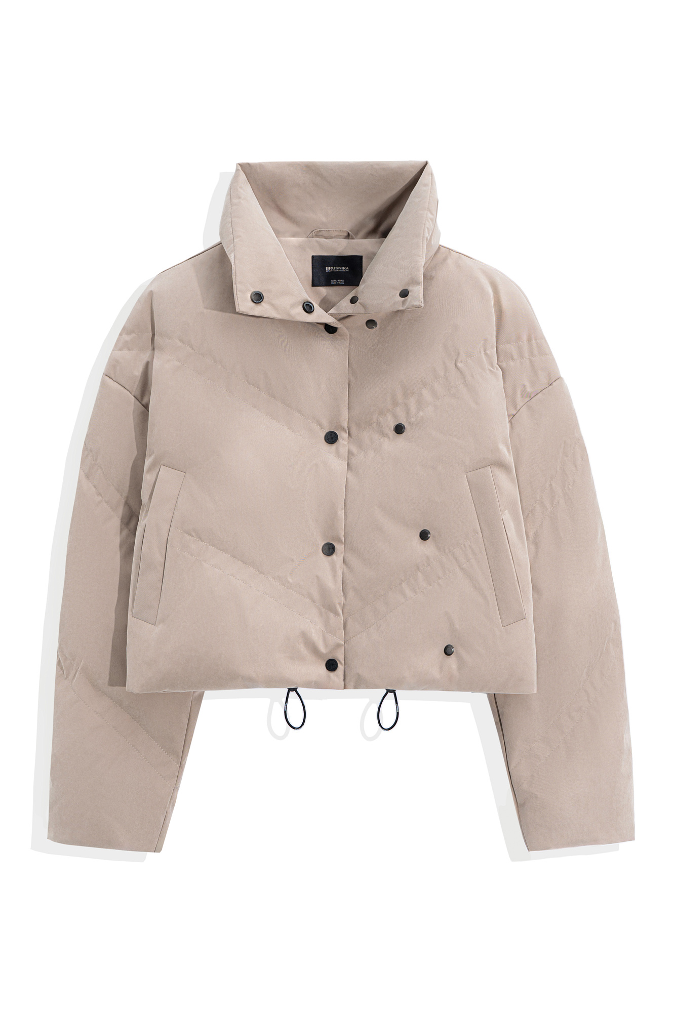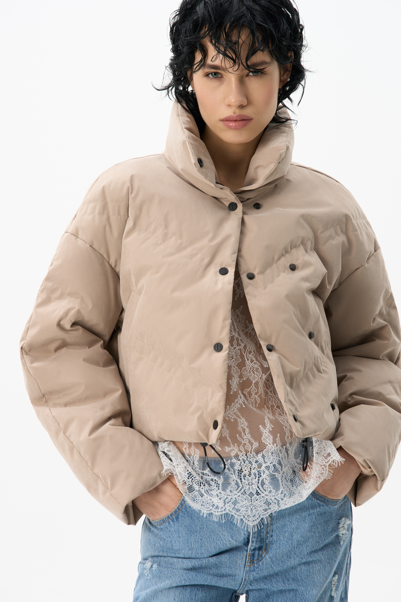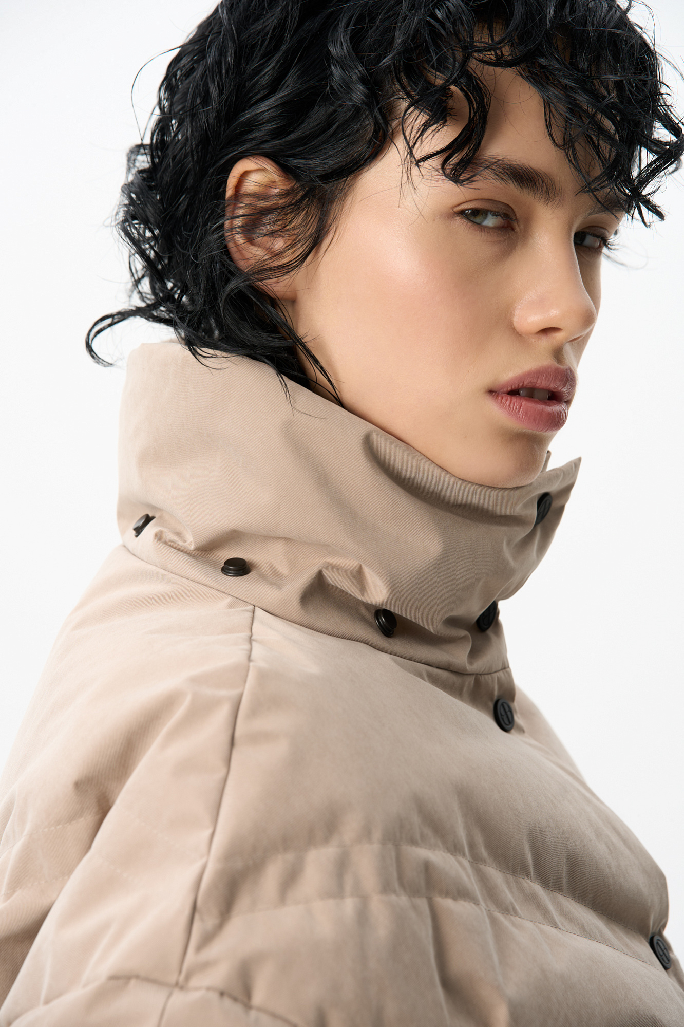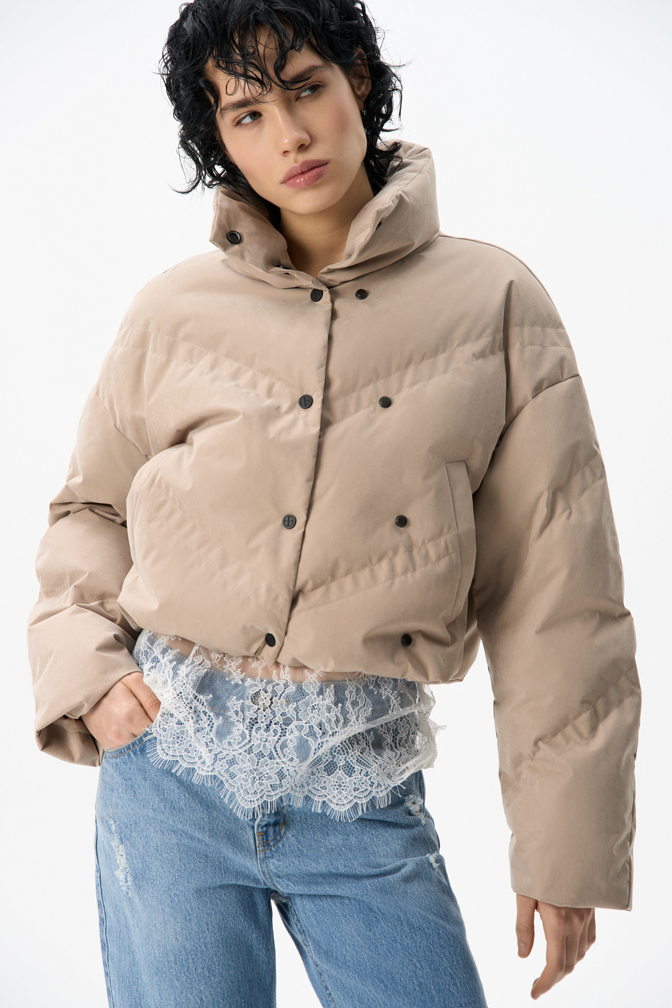 Пуховик с воротником-стойкой, съемным капюшоном и графичной стежкой с двойной отстрочкой. Модель имеет два варианта застежки на металлические кнопки. Низ изделия выполнен на кулиске.