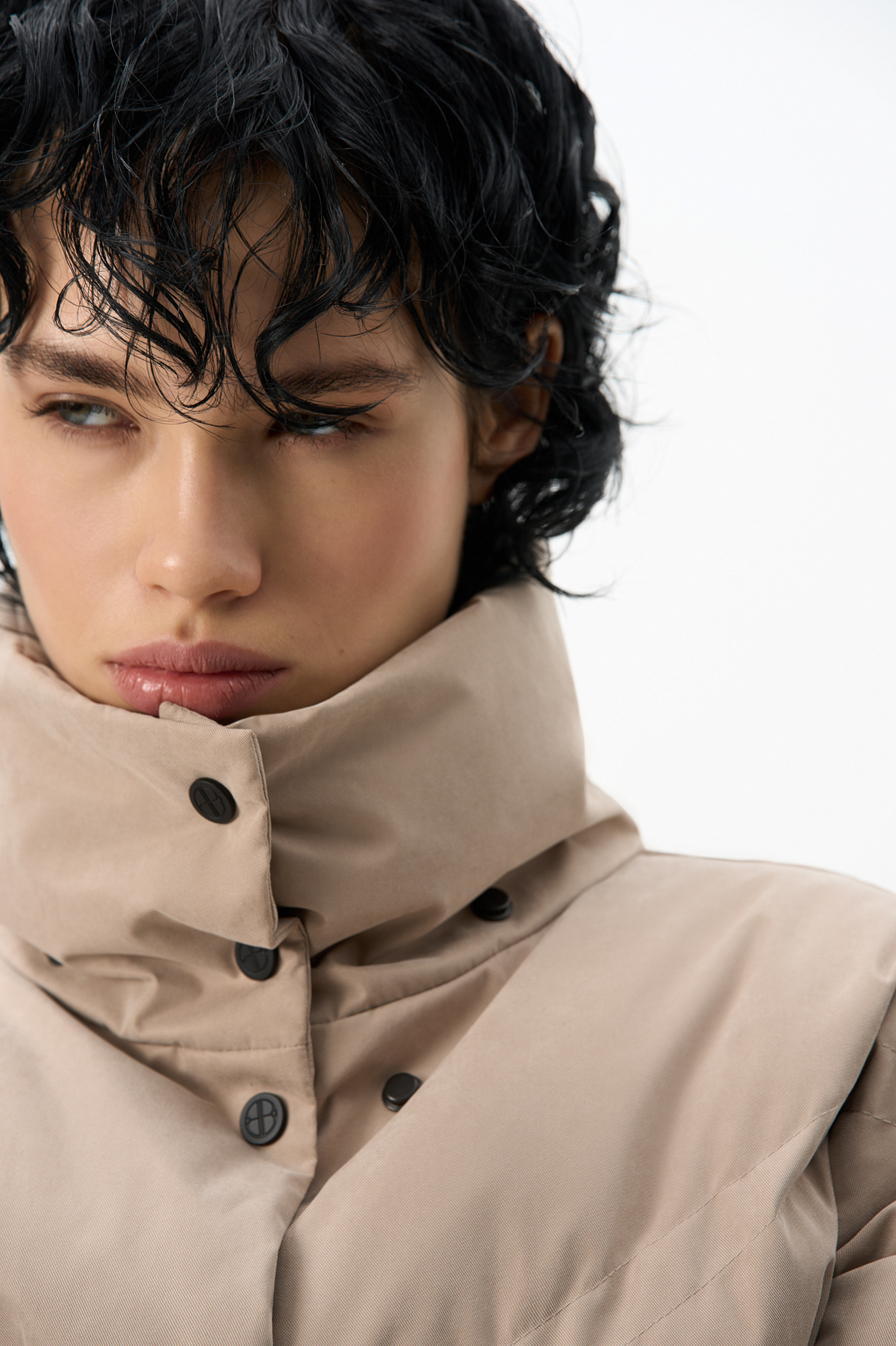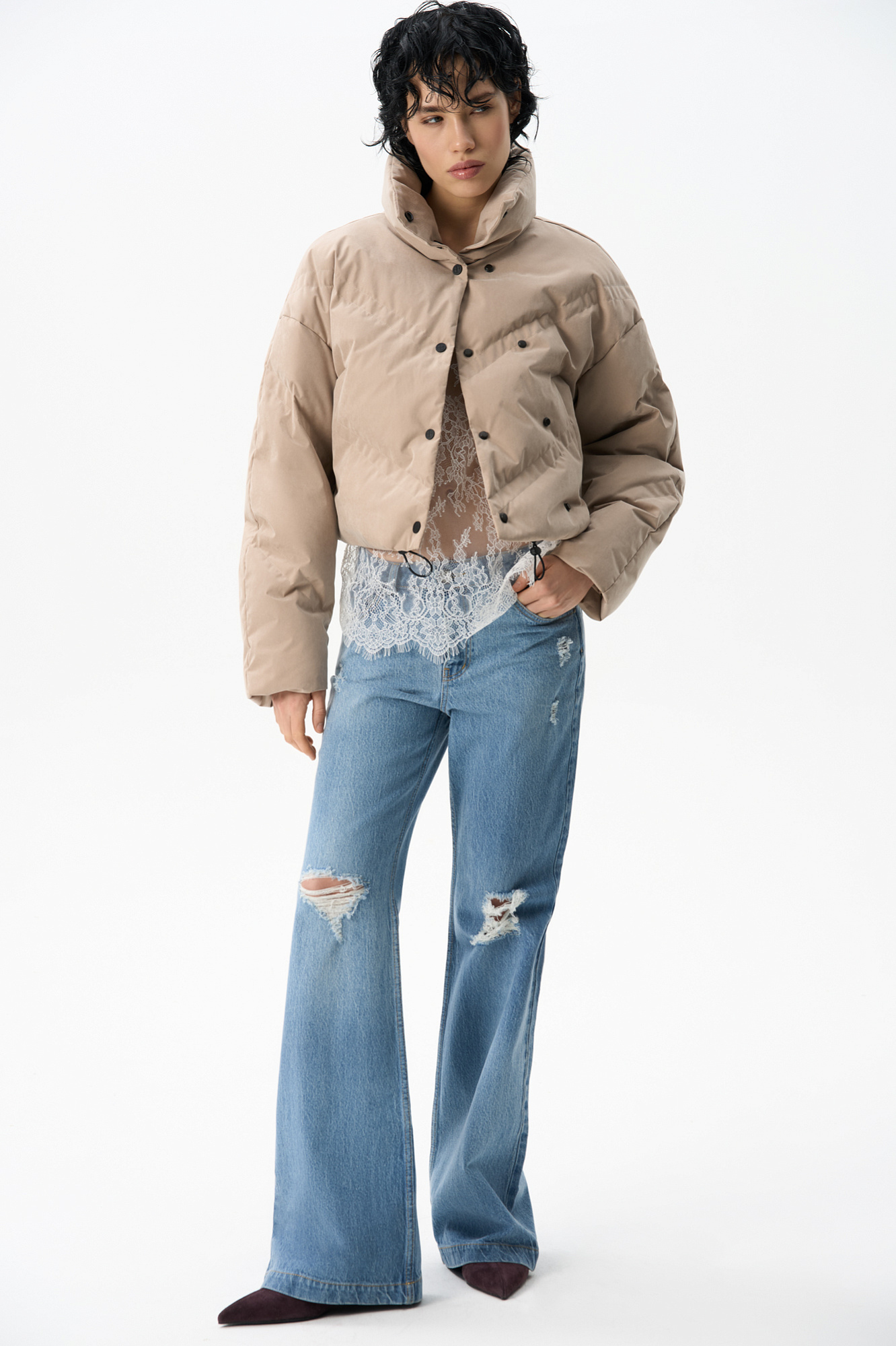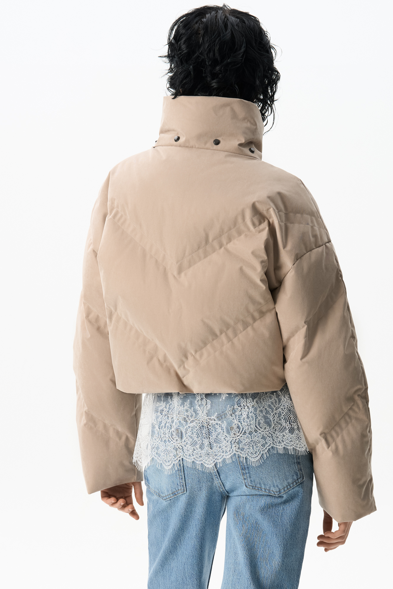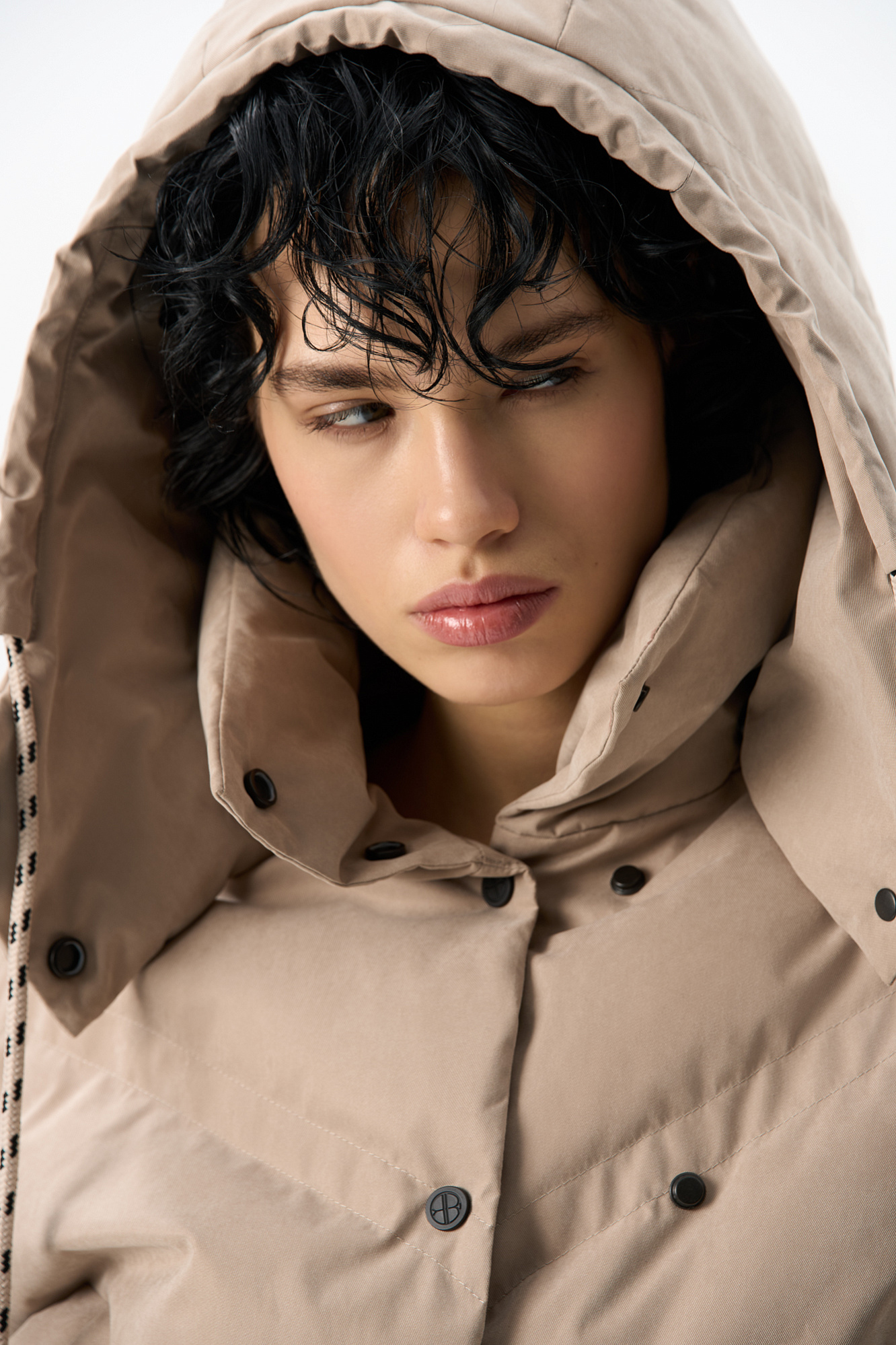 Пуховик с воротником-стойкой, съемным капюшоном и графичной стежкой с двойной отстрочкой. Модель имеет два варианта застежки на металлические кнопки. Низ изделия выполнен на кулиске.