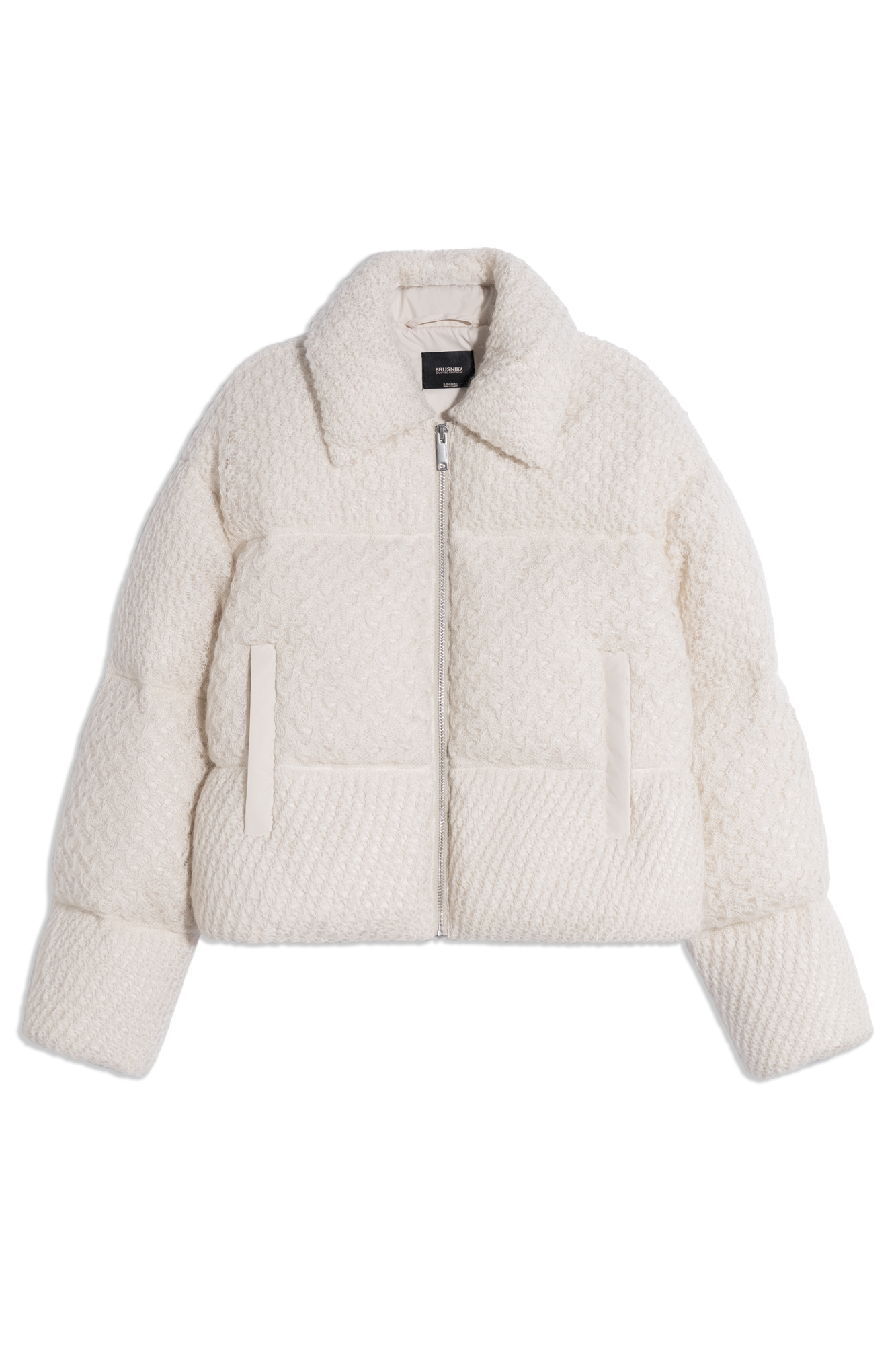 Укороченный стеганый пуховик, декорированный комбинированной ажурной вязкой. Модель прямого силуэта с отложным воротником, боковыми карманами и застежкой на молнию. Изделие на подкладке.