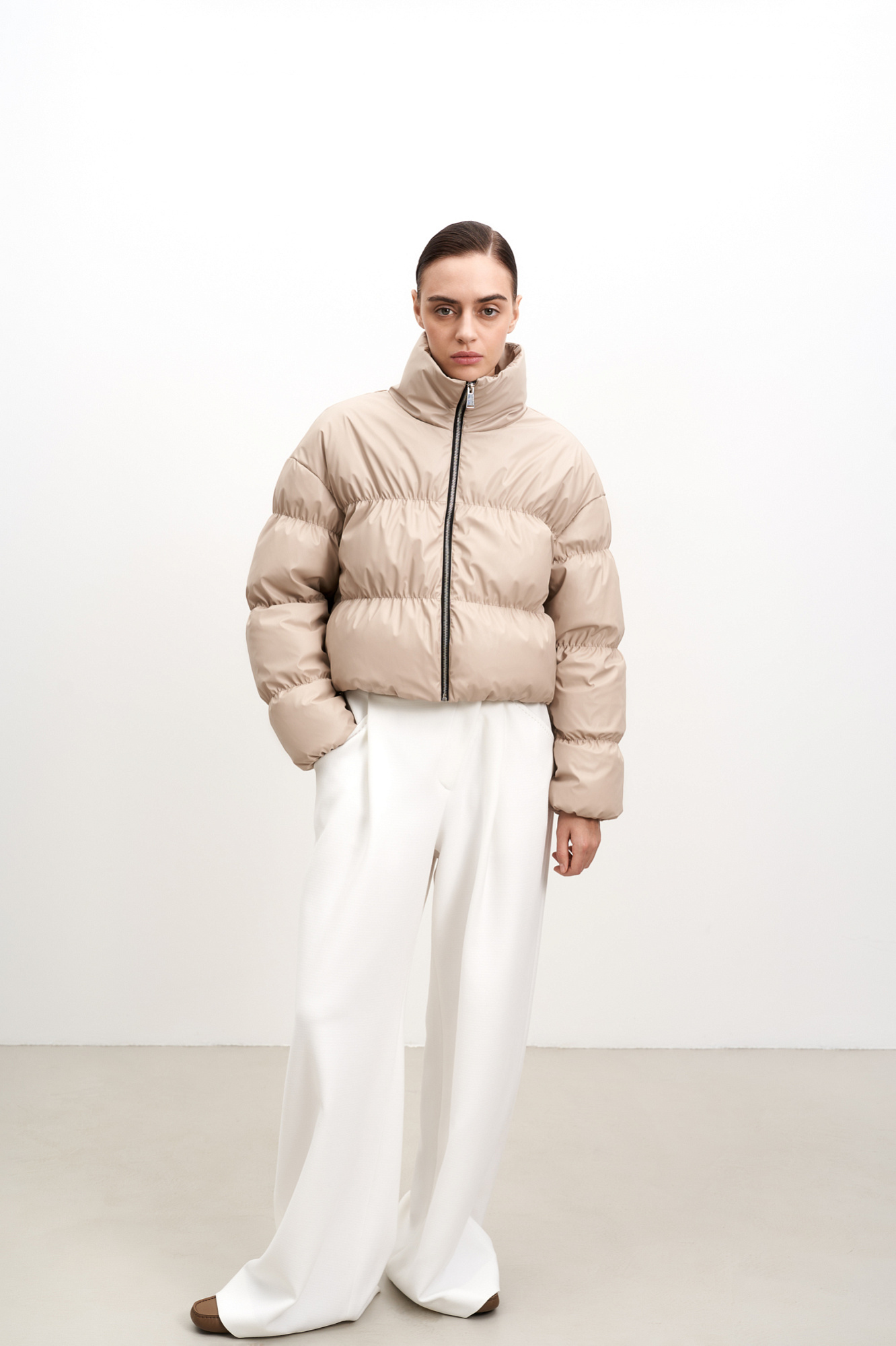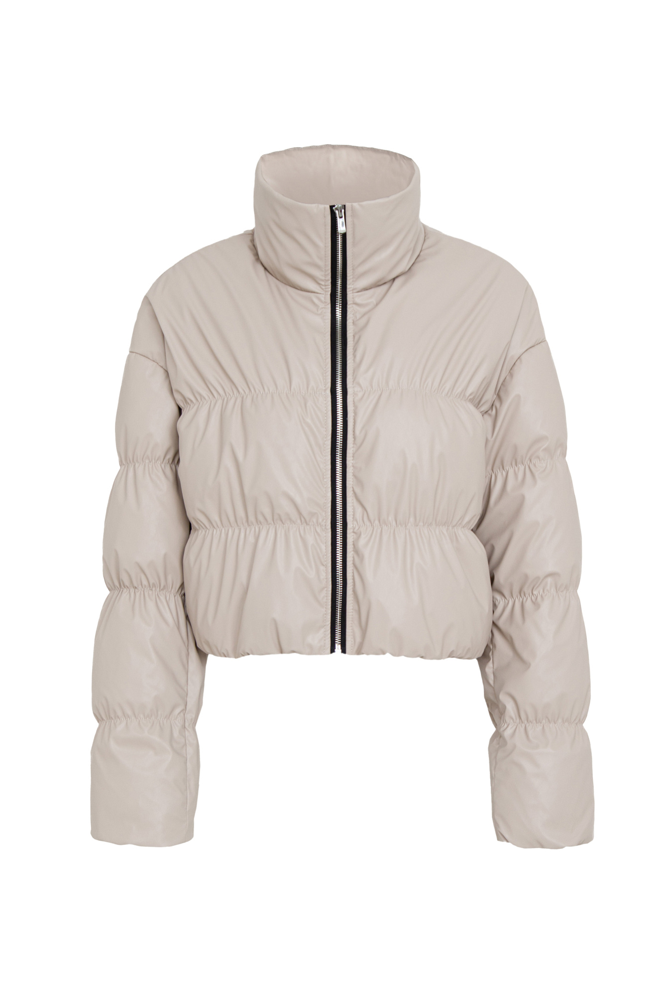 Укороченная куртка из экокожи с декоративной горизонтальной строчкой. Модель с воротником-стойкой. Застежка на молнии.
