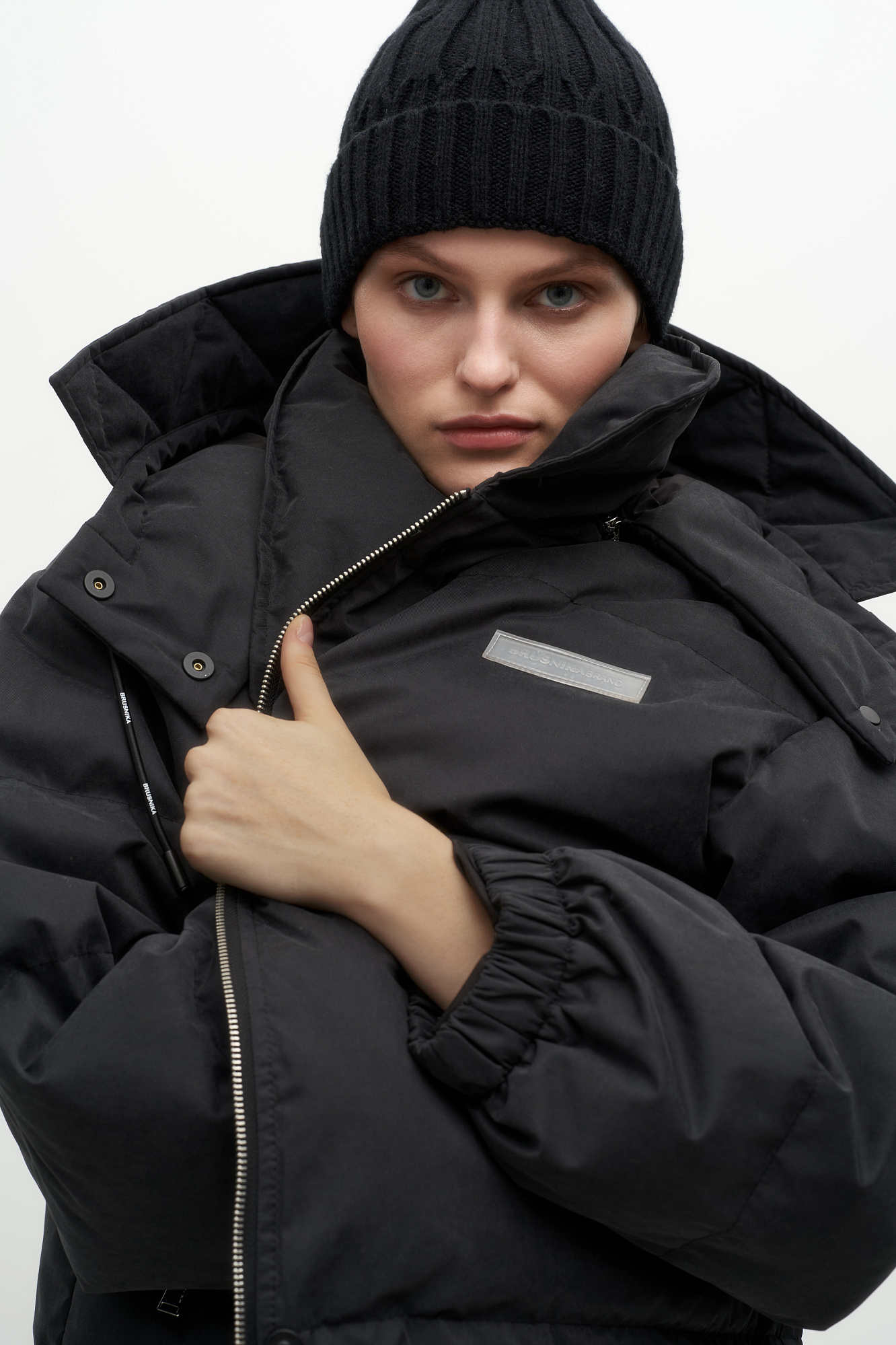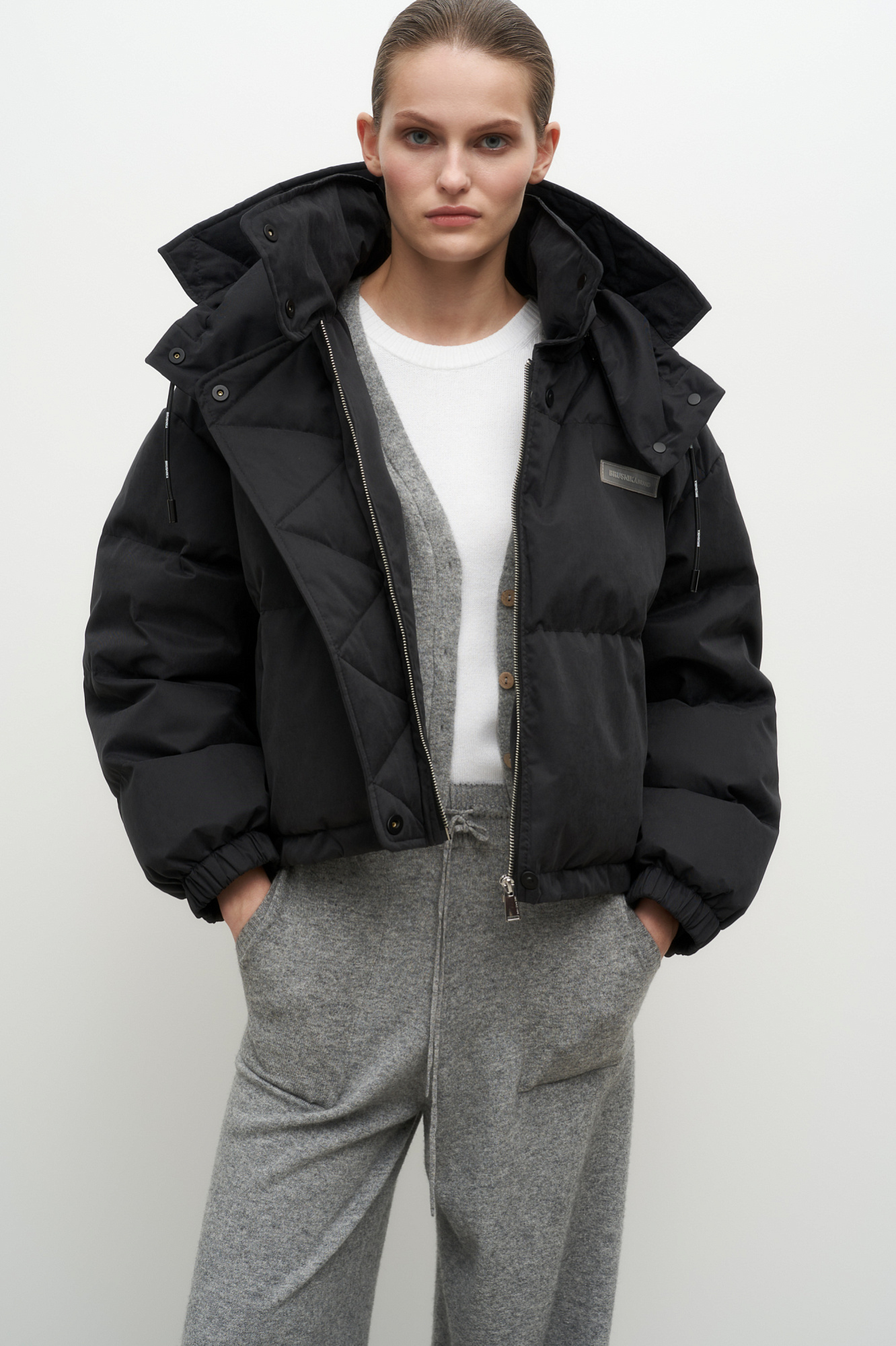 Утепленный пуховик с воротником-стойкой и капюшоном на молнии. Модель свободного силуэта с боковыми карманами, спущенным плечом и брендированным ярлыком на груди. Застежка на потайную молнию и кнопки. Наполнитель натуральный пух 90% перо 10%.