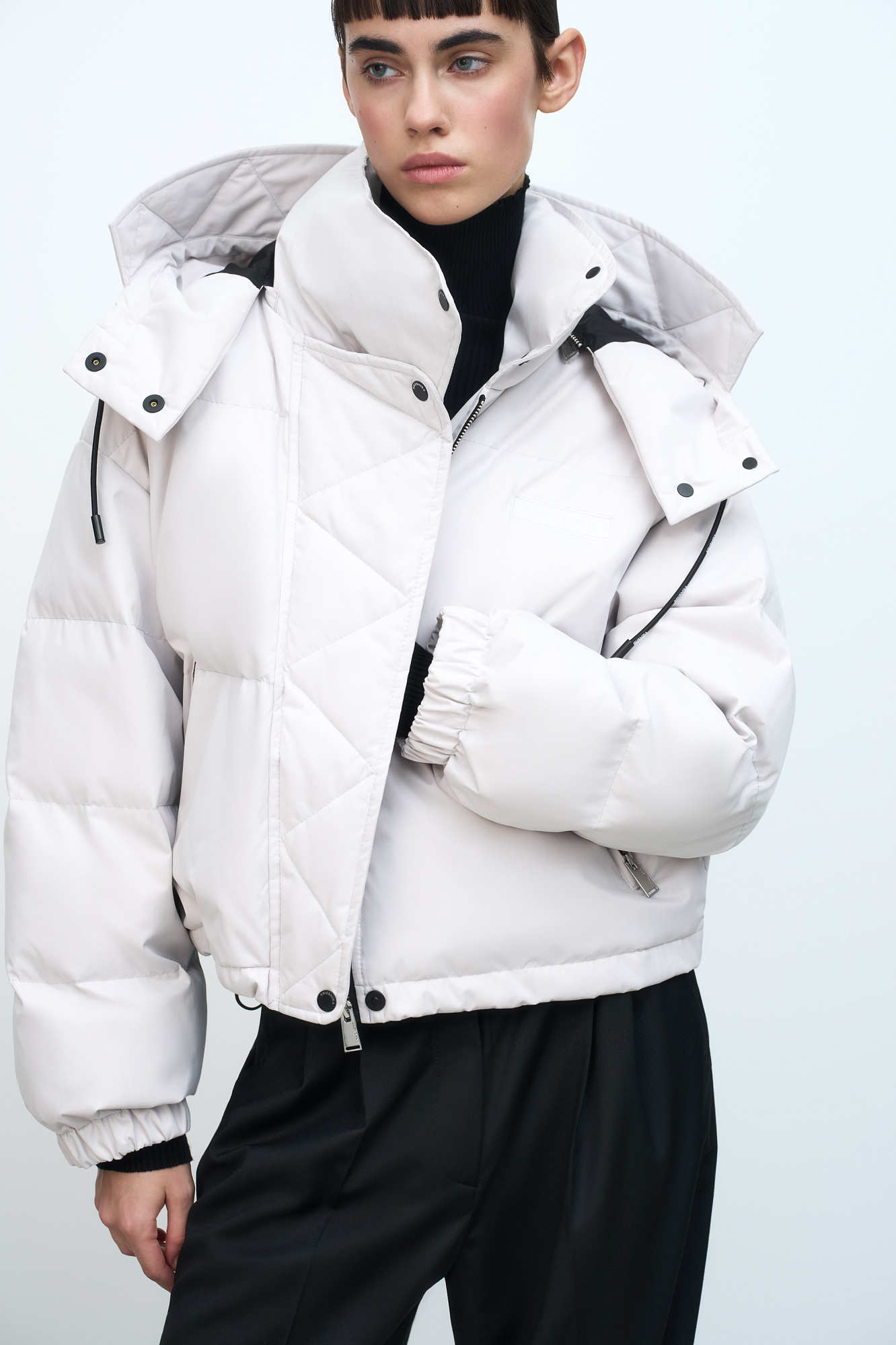 Утепленный пуховик с воротником-стойкой и капюшоном на молнии. Модель свободного силуэта с боковыми карманами, спущенным плечом и брендированным ярлыком на груди. Застежка на потайную молнию и кнопки. Наполнитель натуральный пух 90% перо 10%.