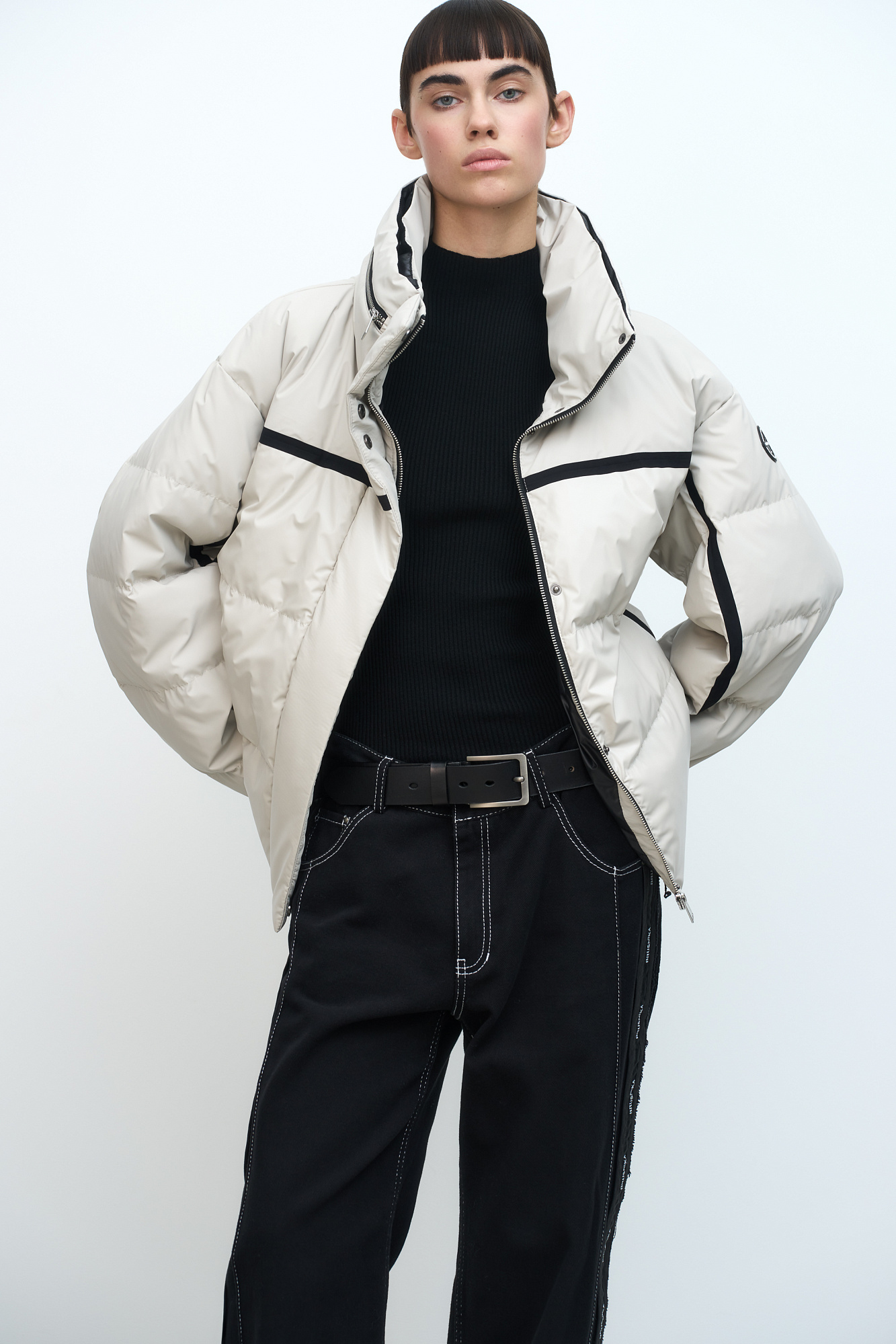 Тонкий пуховик в стиле oversize. Воротник-стойка, потайной капюшон на молнии. Наполнитель натуральный пух-перо. Потайная застежка на кнопках и молнии. Низкий показатель водонепроницаемости, можно носить в сухую погоду или моросящий дождик.