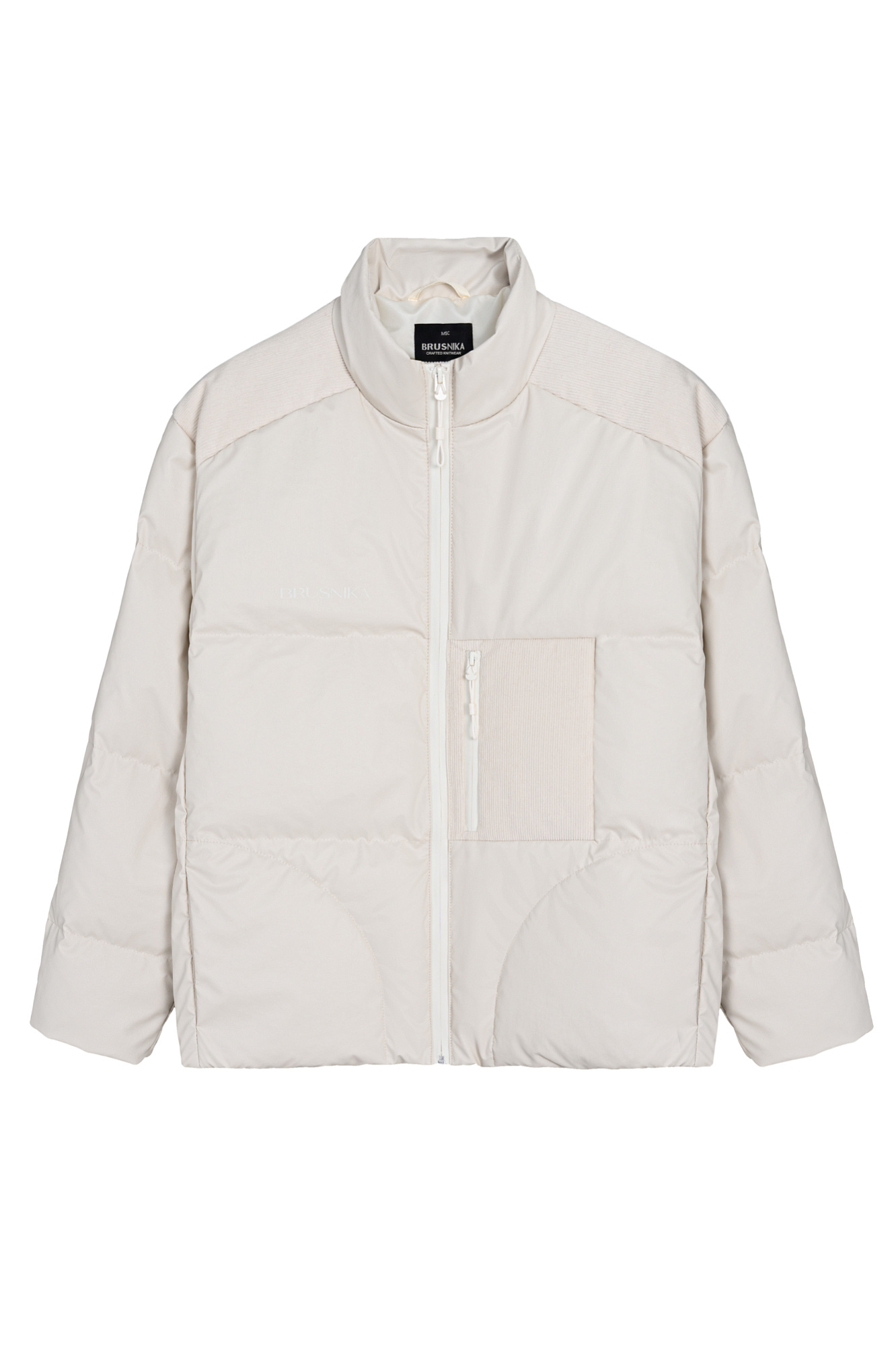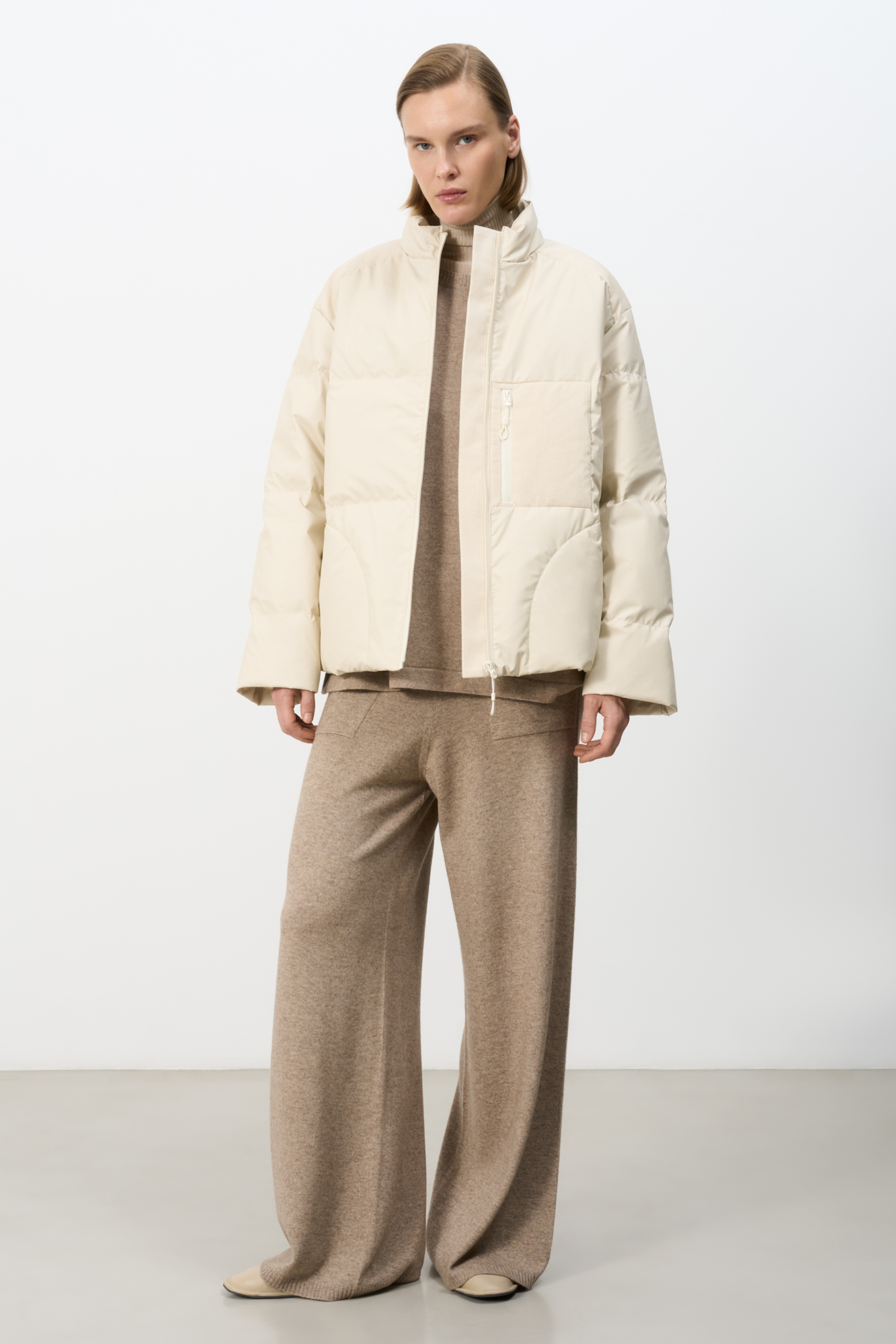Пуховик свободного силуэта со спущенной линией плеча, карманом на молнии и декоративными элементами из вельвета. Застежка на молнию. На подкладке.