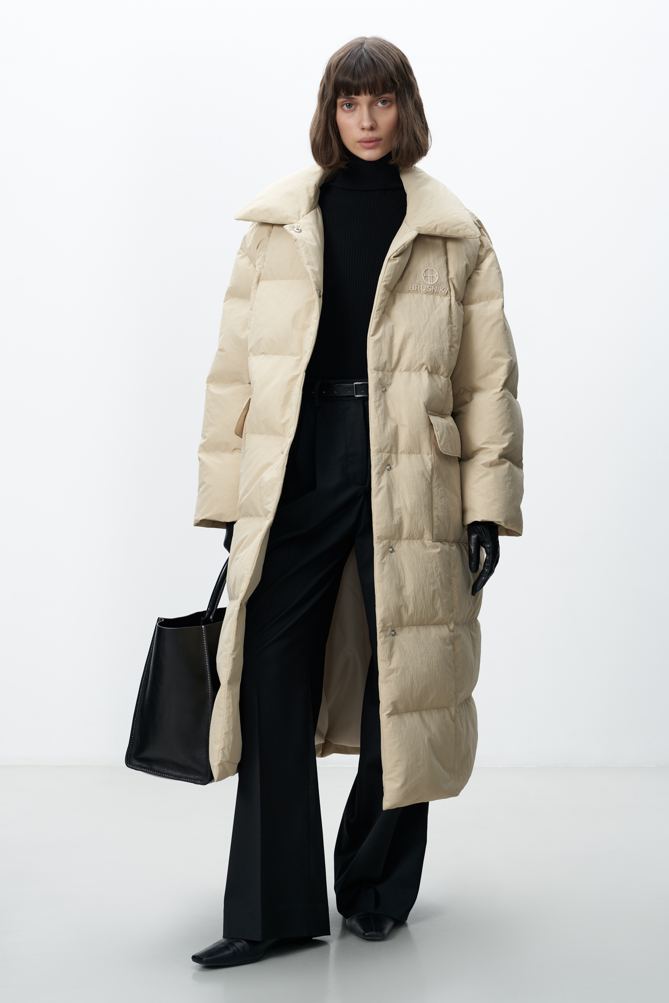 Длинный стеганый пуховик из текстурного нейлона. Модель с отложным воротником и боковыми карманами. Застежка на кнопки. Брендированный ярлык на груди.