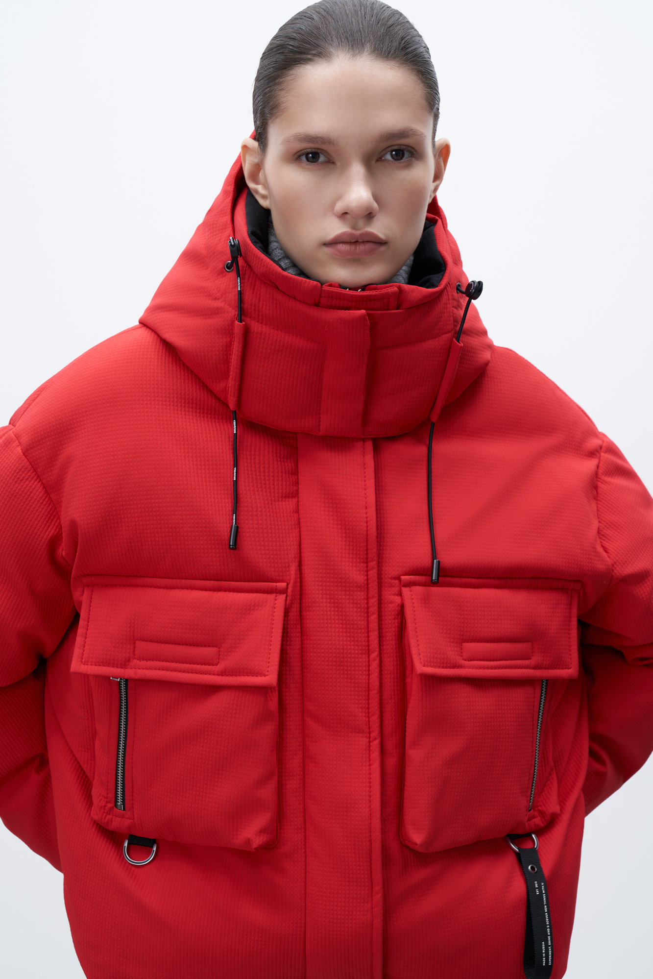 Пуховик с двумя нагрудными накладными карманами, воротником-стойкой и капюшоном. Застежка на молнию под планкой. Манжеты рукавов фиксируются липучкой. Низ изделия выполнен на регулируемой кулиске.