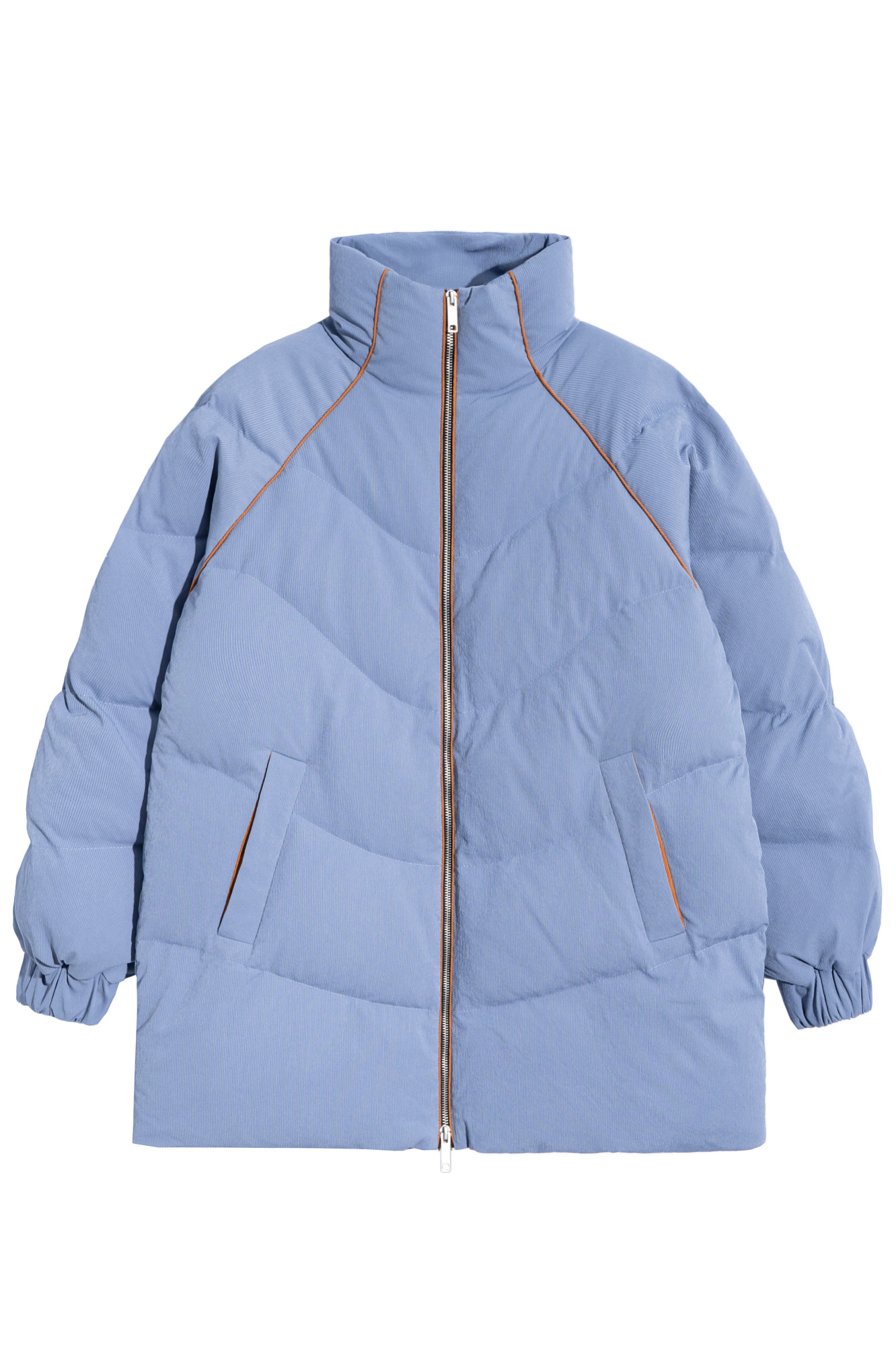 Удлиненный стеганый пуховик из текстурного нейлона. Модель с воротником-стойкой и прорезными карманами. Застежка на молнию. Брендированный ярлык на спине и рукаве изделия.