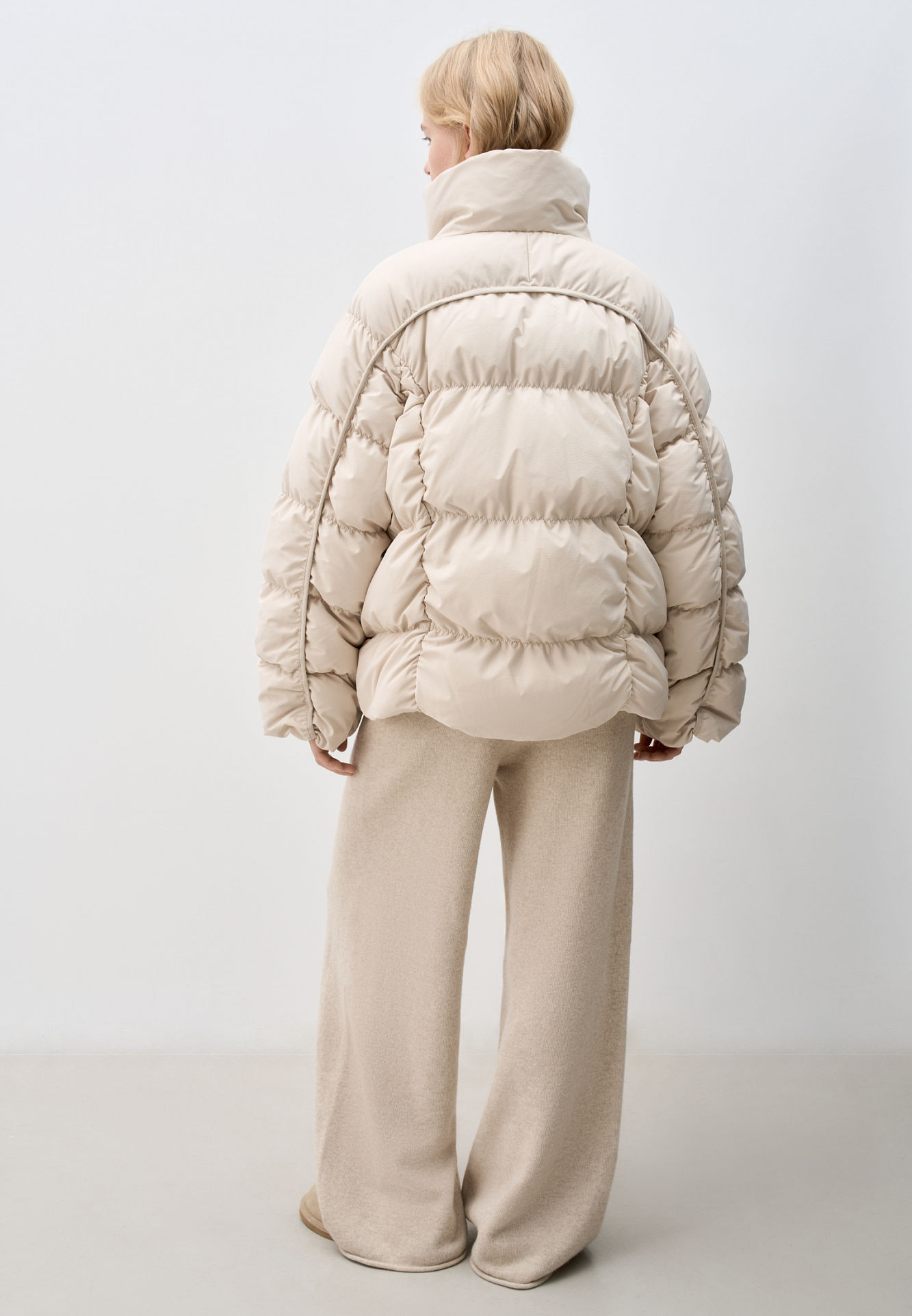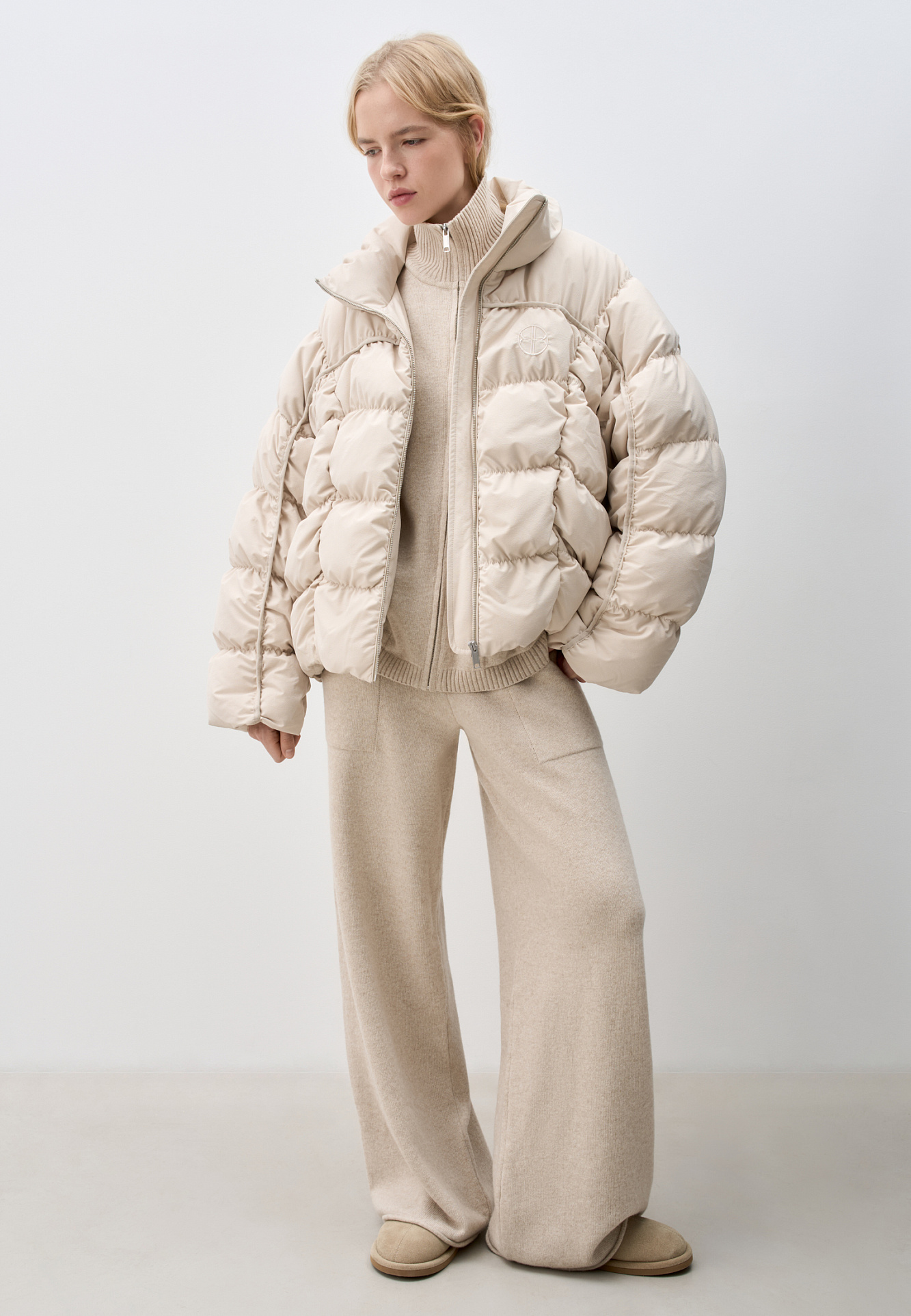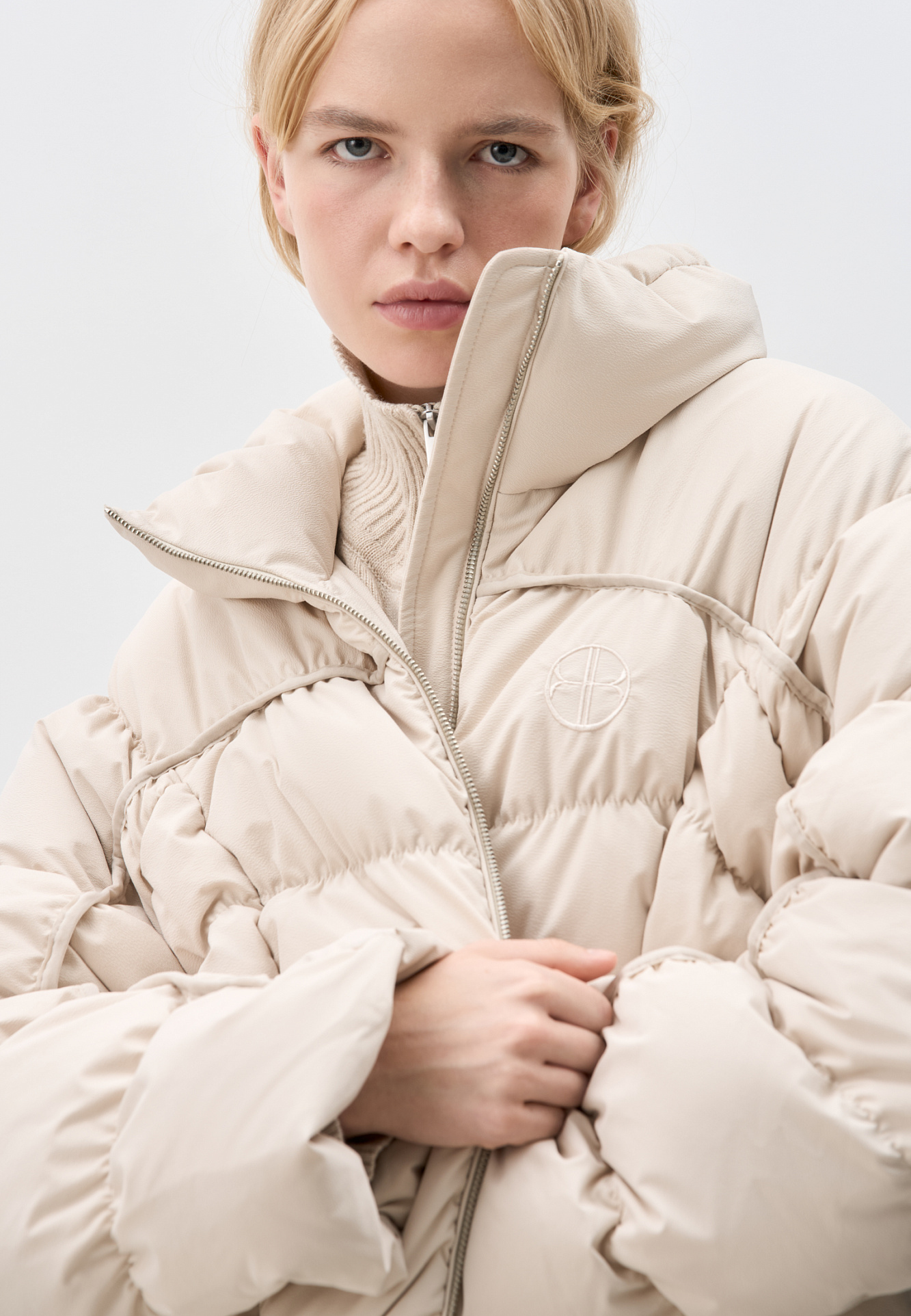 Стеганый пуховик с воротником-стойкой. Застежка на молнию. Низ изделия выполнен на регулируемой кулиске. Вышитый логотип на груди. На подкладке.