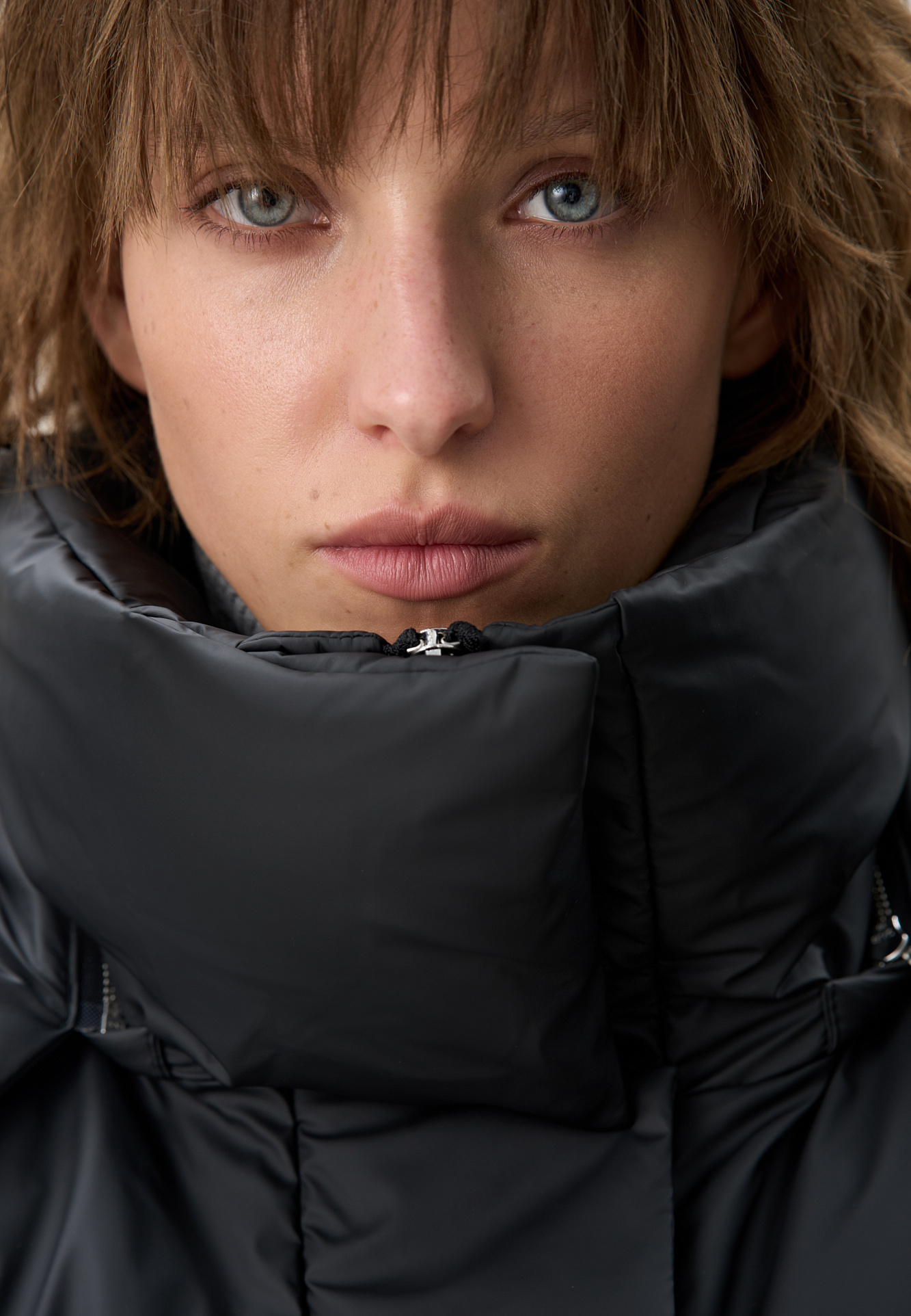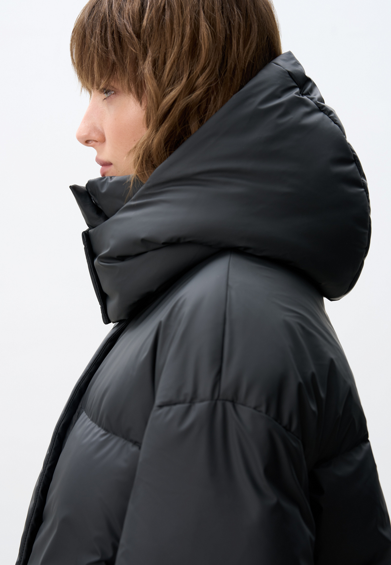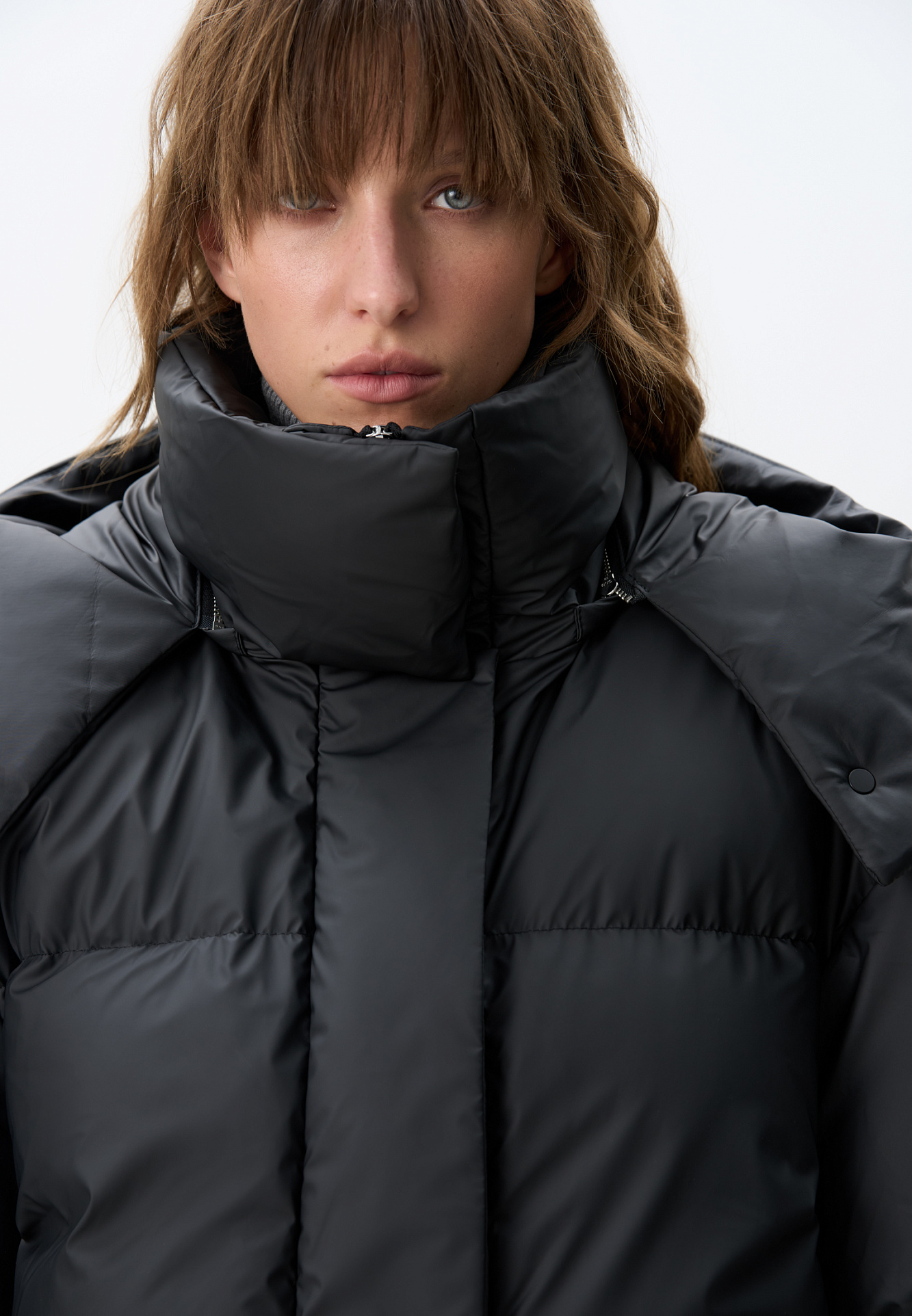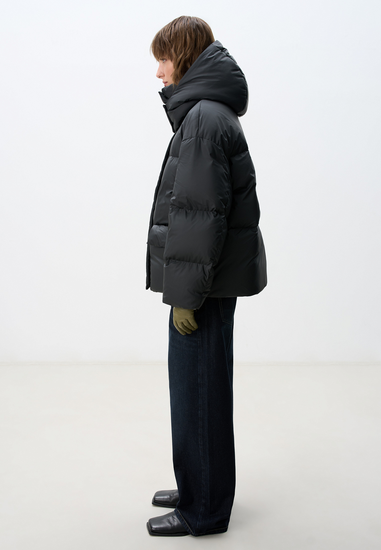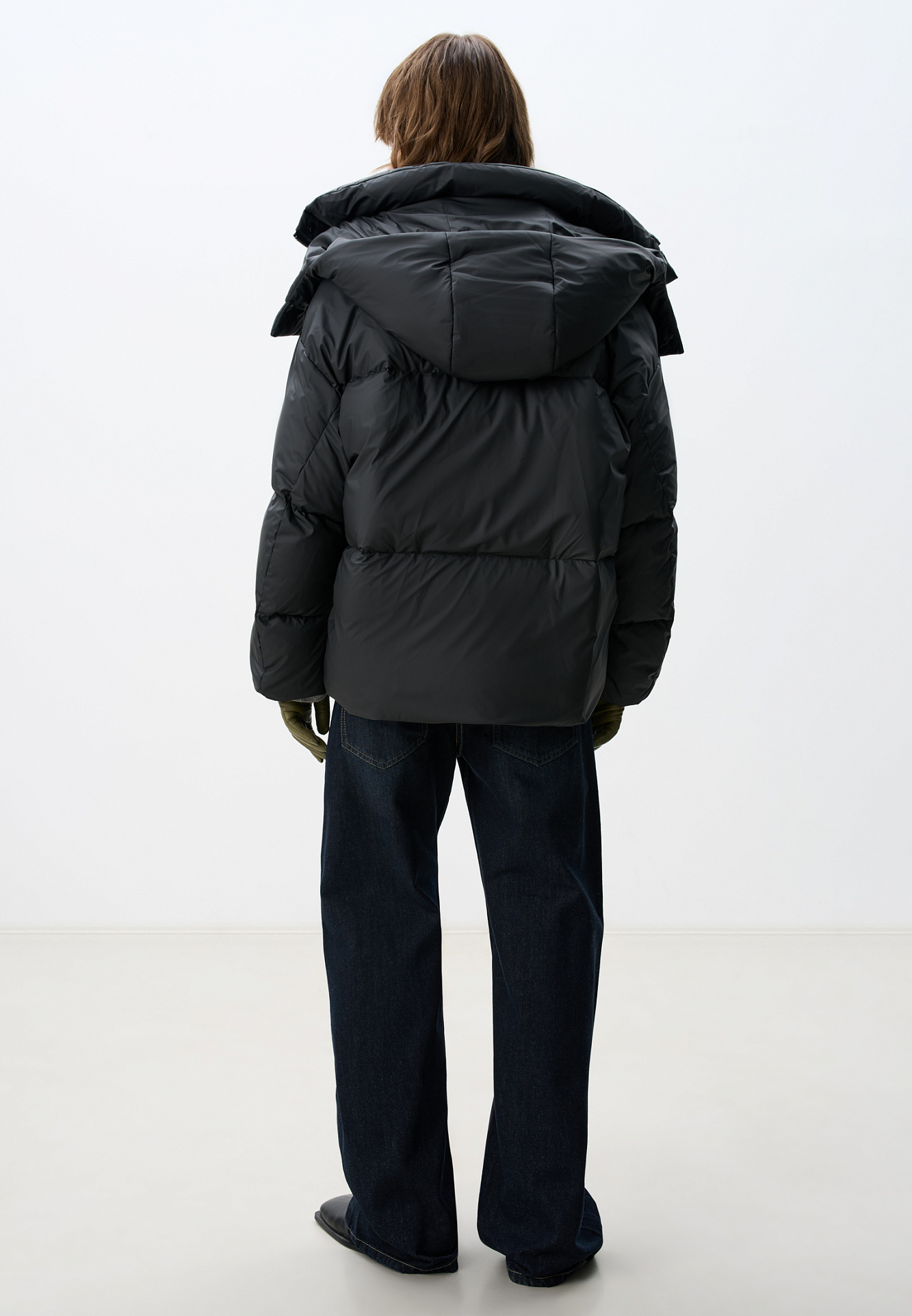 Пуховик с двумя накладными карманами, воротником-стойкой и капюшоном. Застежка на молнию под планкой. Низ изделия выполнен на регулируемой кулиске. На подкладке.