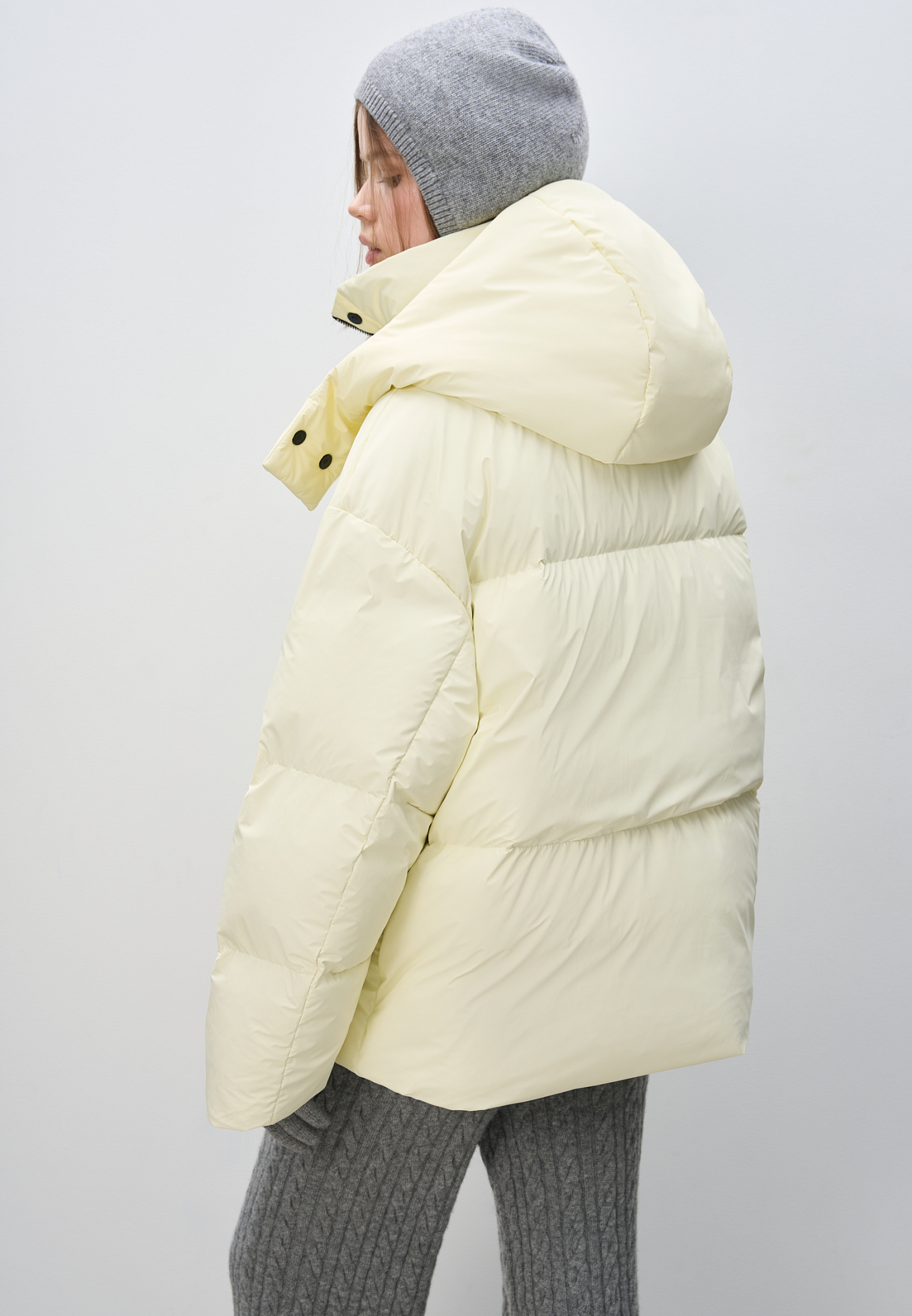 Пуховик с двумя накладными карманами, воротником-стойкой и капюшоном. Застежка на молнию под планкой. Низ изделия выполнен на регулируемой кулиске. На подкладке.
