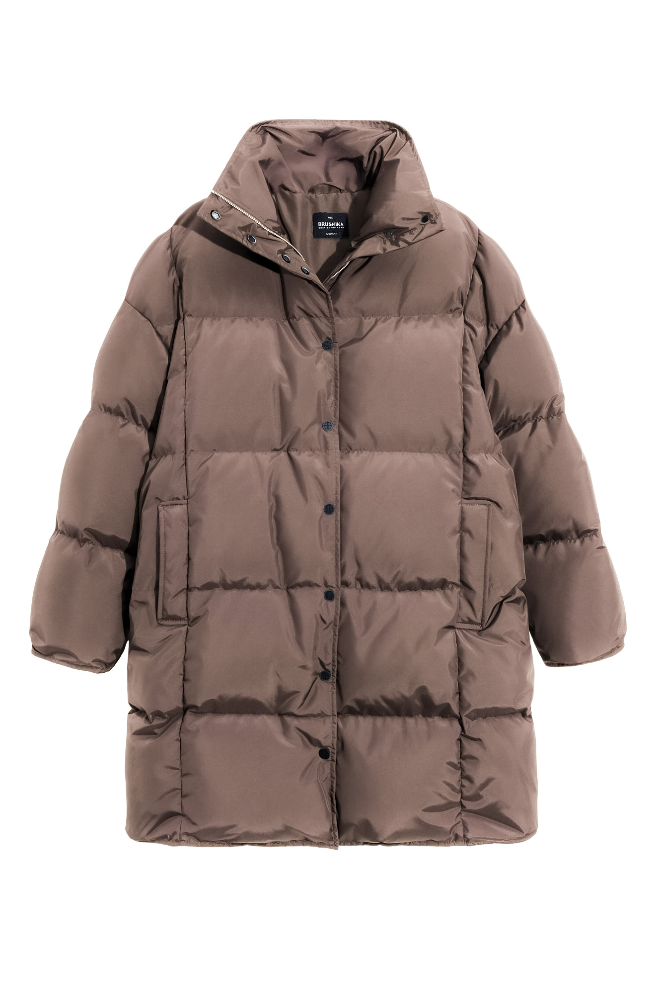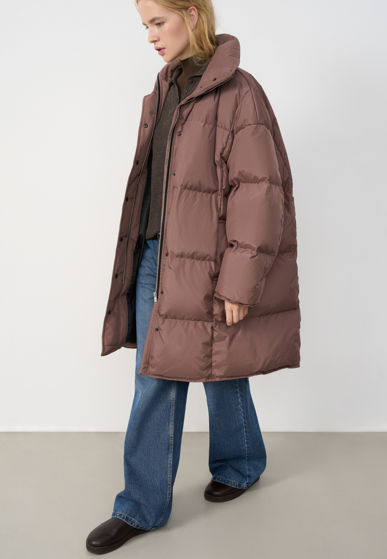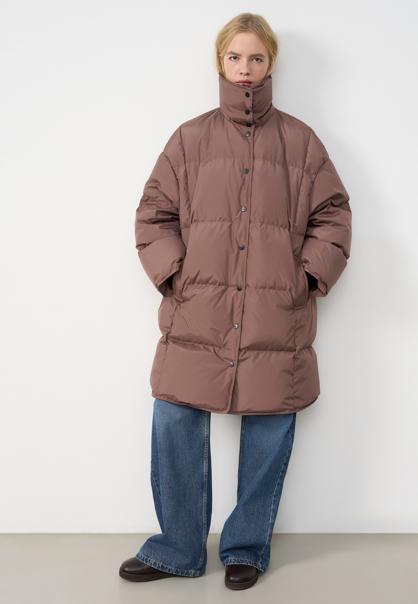 Длинный стеганый пуховик с капюшоном на кулиске. Модель свободного силуэта с воротником-стойкой, трикотажными манжетами и боковыми карманами. Застежка на молнию под планкой с брендированными пуговицами.