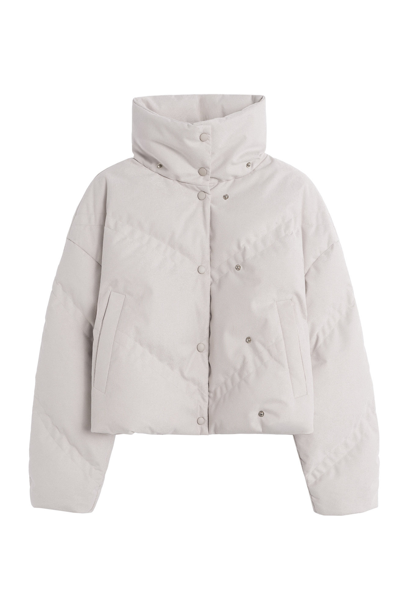 Пуховик с воротником-стойкой, съемным капюшоном и графичной стежкой с двойной отстрочкой. Модель имеет два варианта застежки на металлические кнопки. Низ изделия выполнен на кулиске.