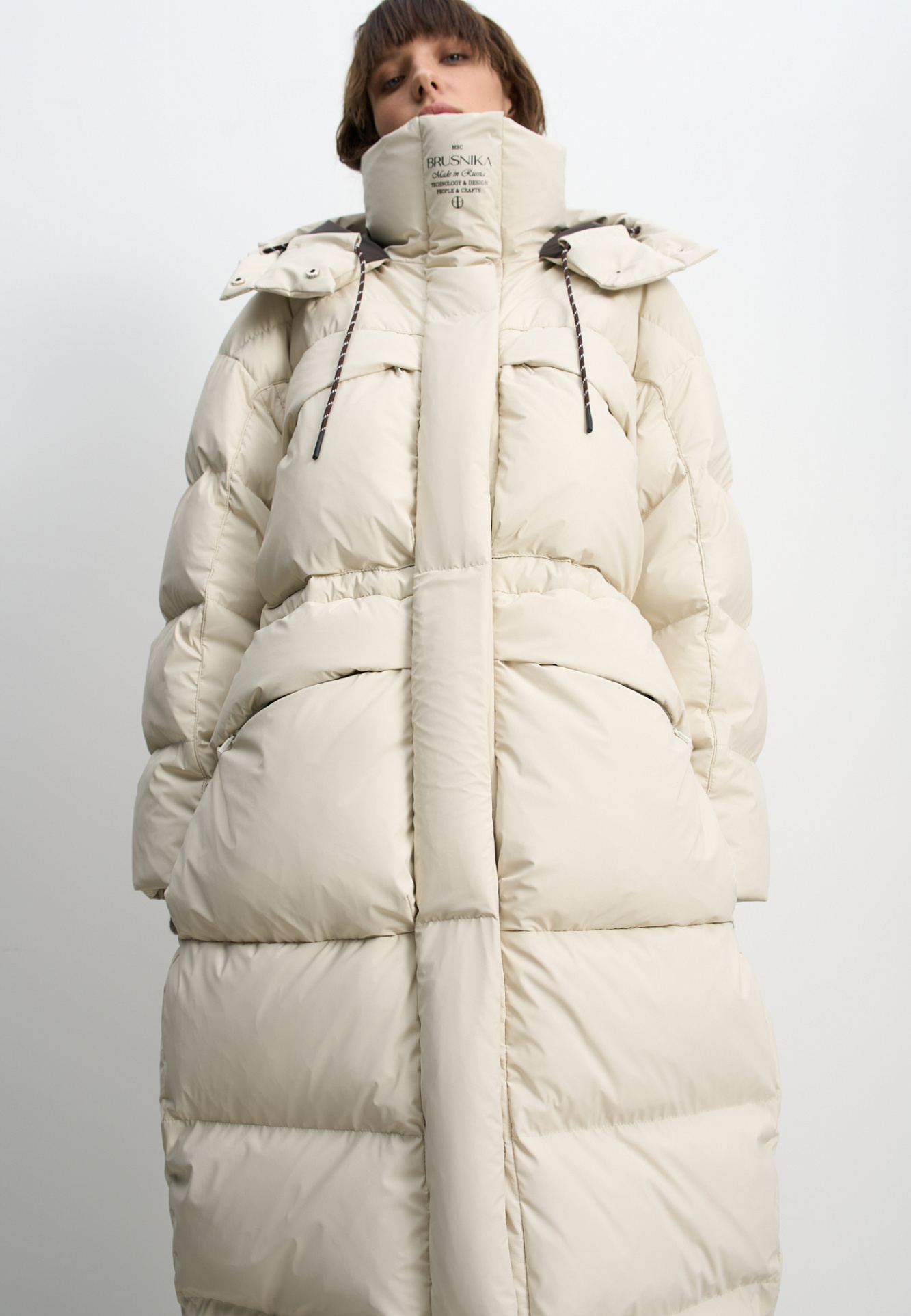 Объемный длинный пуховик. Модель с воротником-стойкой, капюшоном на кулиске и кнопках, большими нагрудными и боковыми карманами на молнии с клапанами и трикотажными манжетами в широкий рубчик. Застежка на молнию по всей длине под планкой на кнопках. Ворот изделия декорирован логотипом бренда.