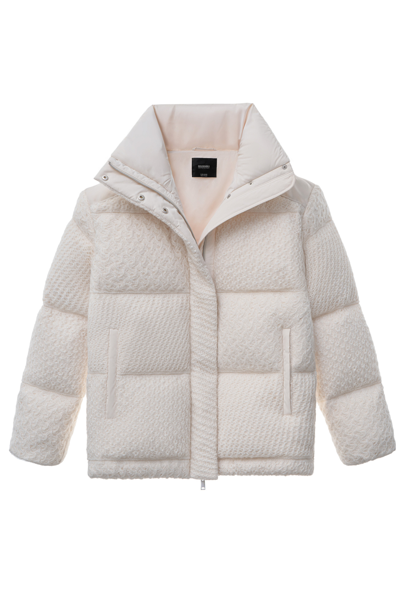 Объемный стеганый пуховик, декорированный комбинированной ажурной вязкой. Модель с воротником-стойкой, боковыми карманами и застежкой на молнию под планкой с кнопками.