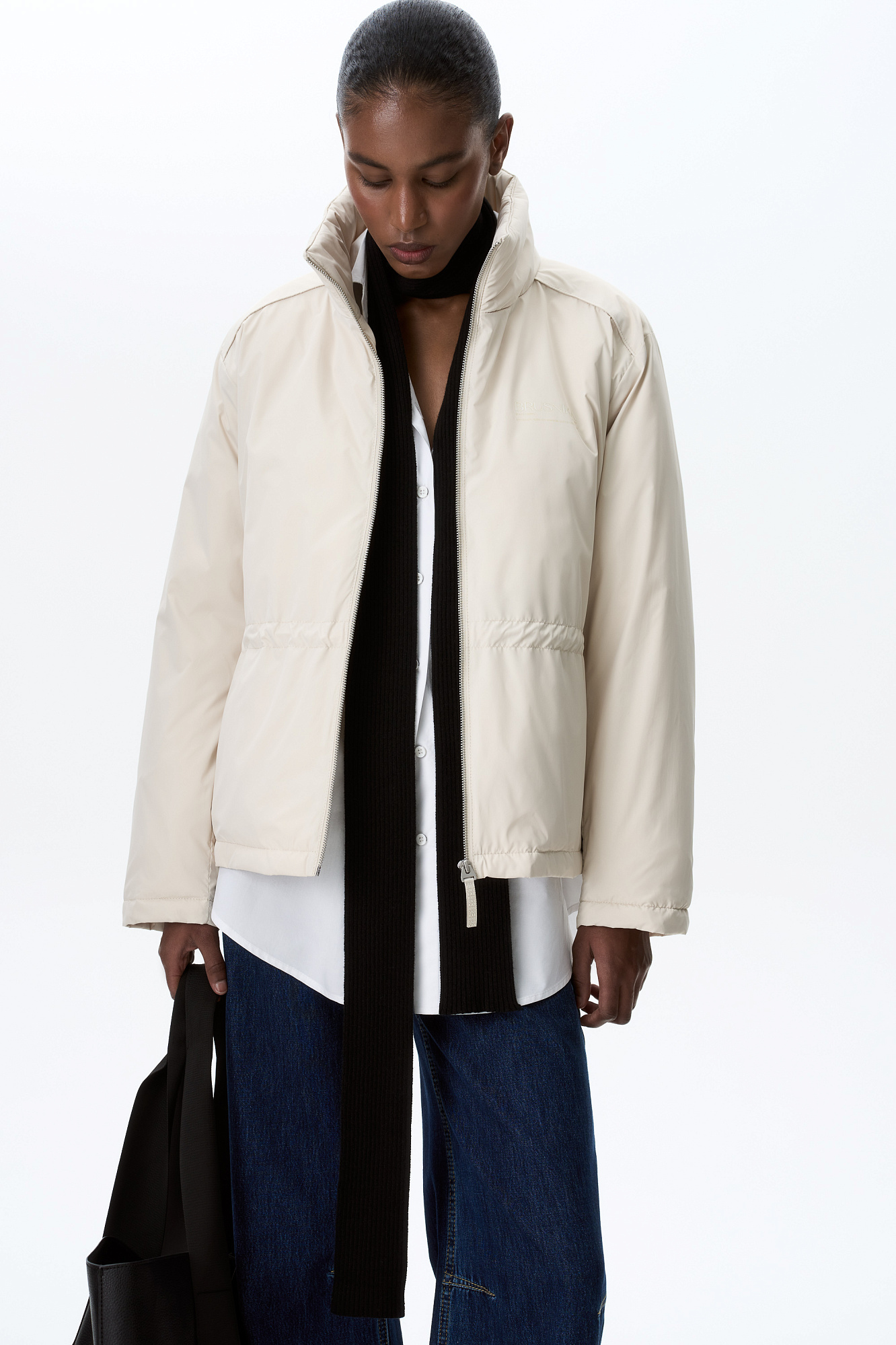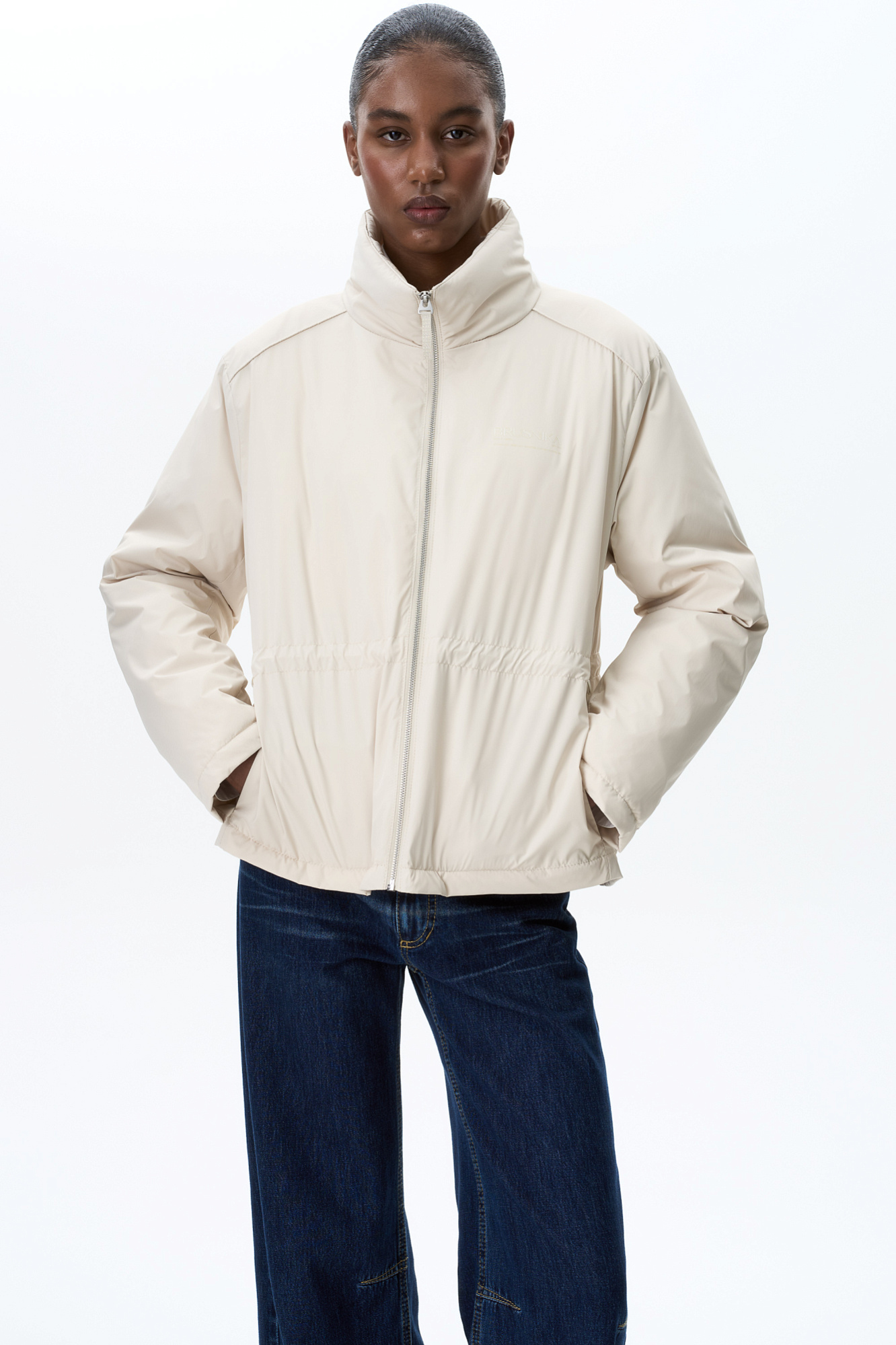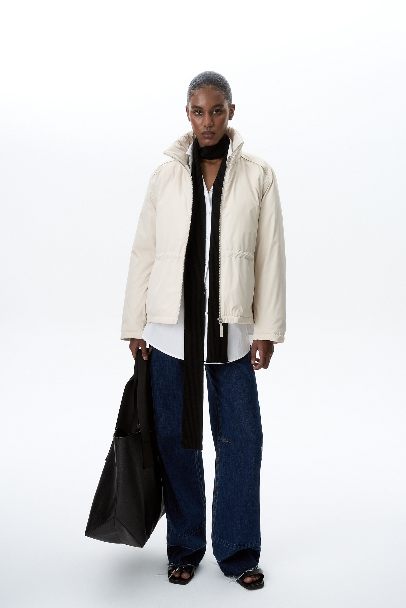 Пуховик с регулируемой кулиской. Модель свободного силуэта со спущенной линией плеча и боковыми карманами. Застежка на молнию.