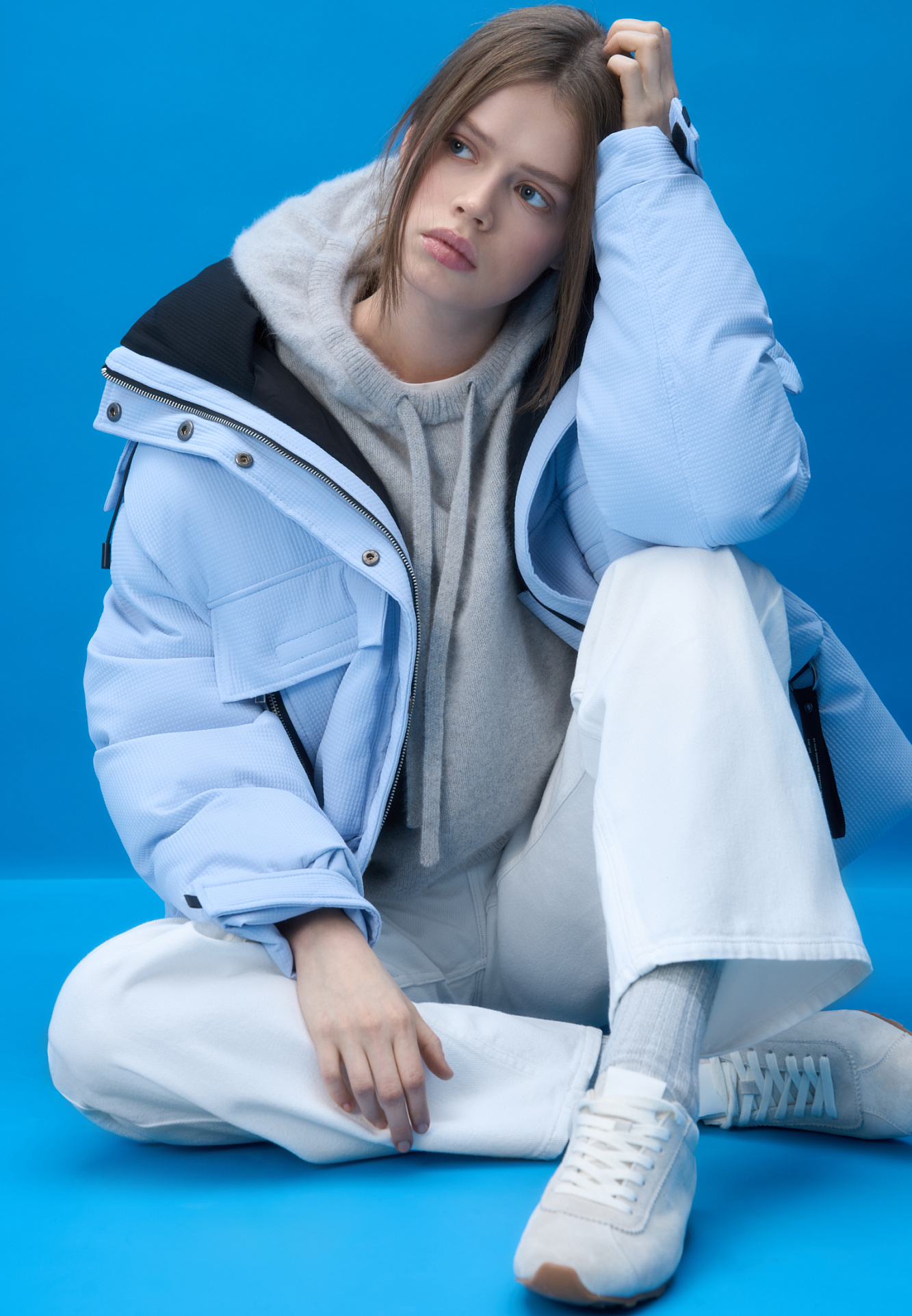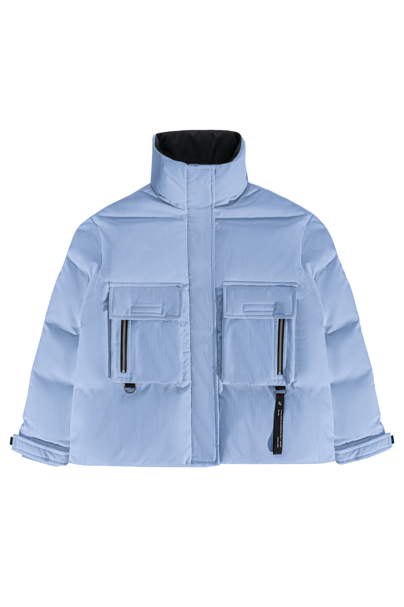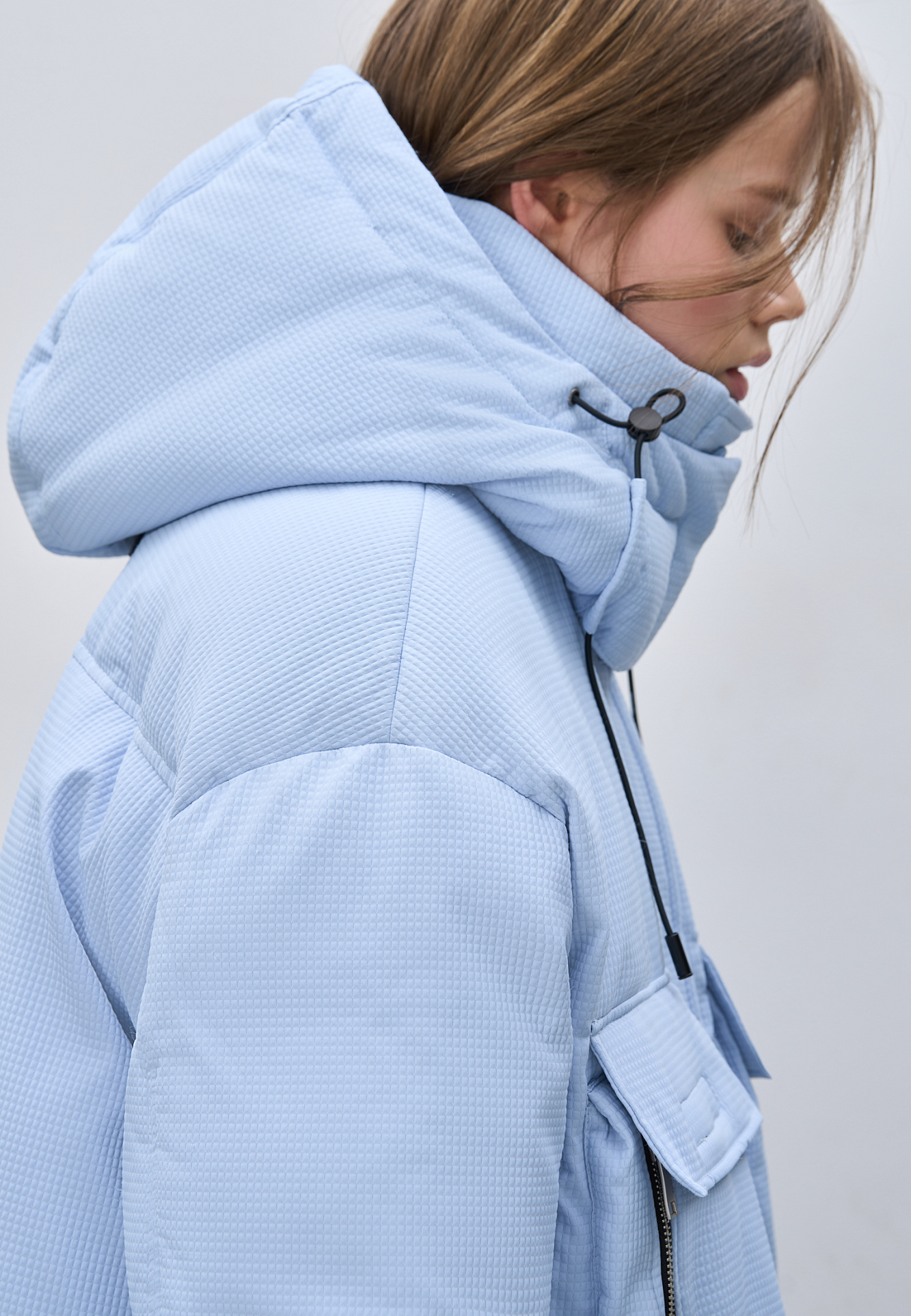 Пуховик с двумя нагрудными накладными карманами, воротником-стойкой и капюшоном. Застежка на молнию под планкой. Манжеты рукавов фиксируются липучкой. Низ изделия выполнен на регулируемой кулиске.