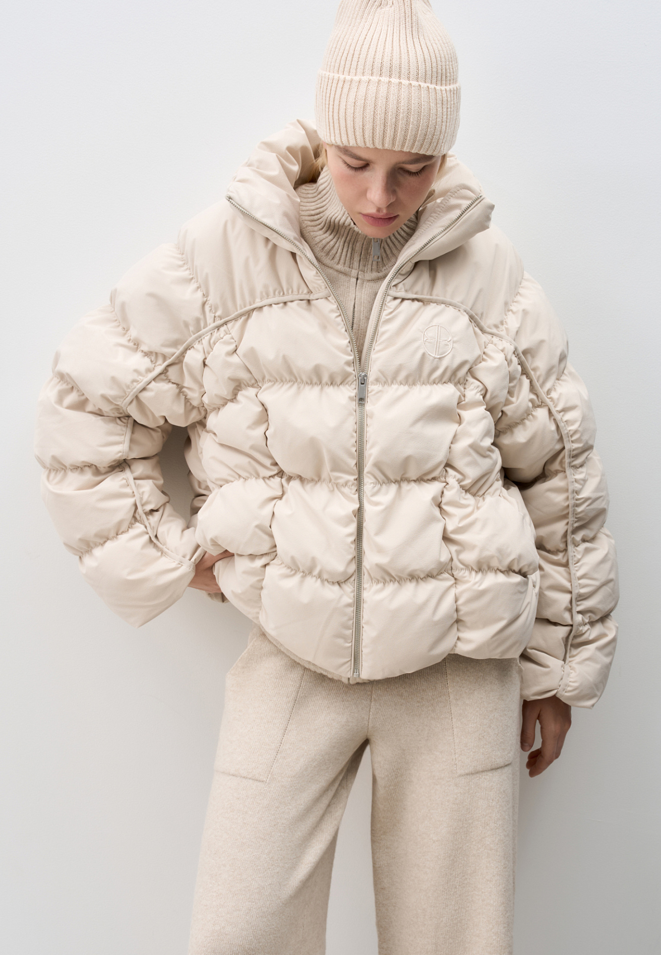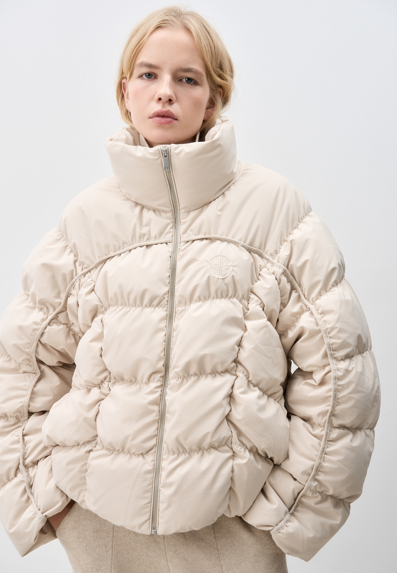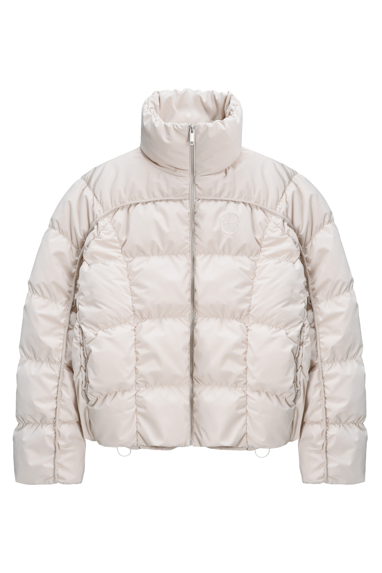 Стеганый пуховик с воротником-стойкой. Застежка на молнию. Низ изделия выполнен на регулируемой кулиске. Вышитый логотип на груди. На подкладке.