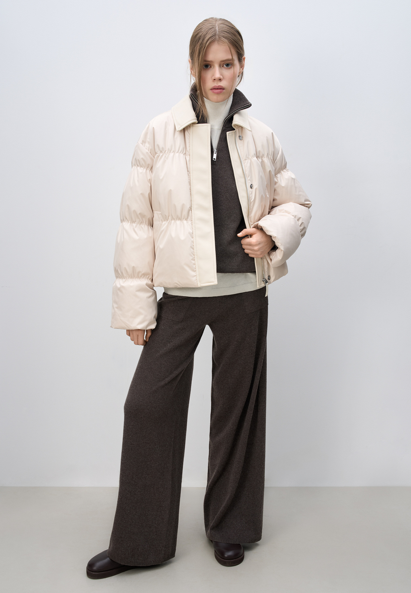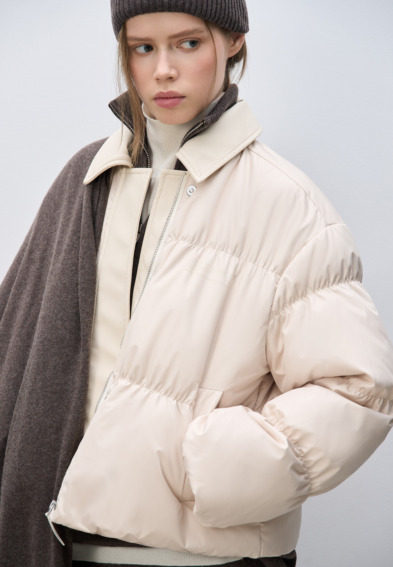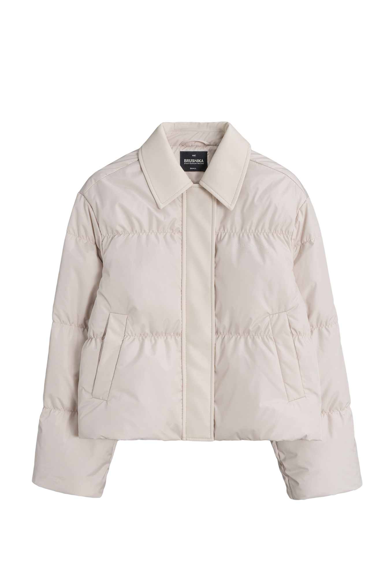 Стеганый пуховик с отложным воротником из экокожи. Модель свободного силуэта со спущенной линией плеч и боковыми карманами. Застежка на молнию и магнитные кнопки под вертикальной планкой из экокожи. Логотип на груди. Изделие выполнено на подкладке.