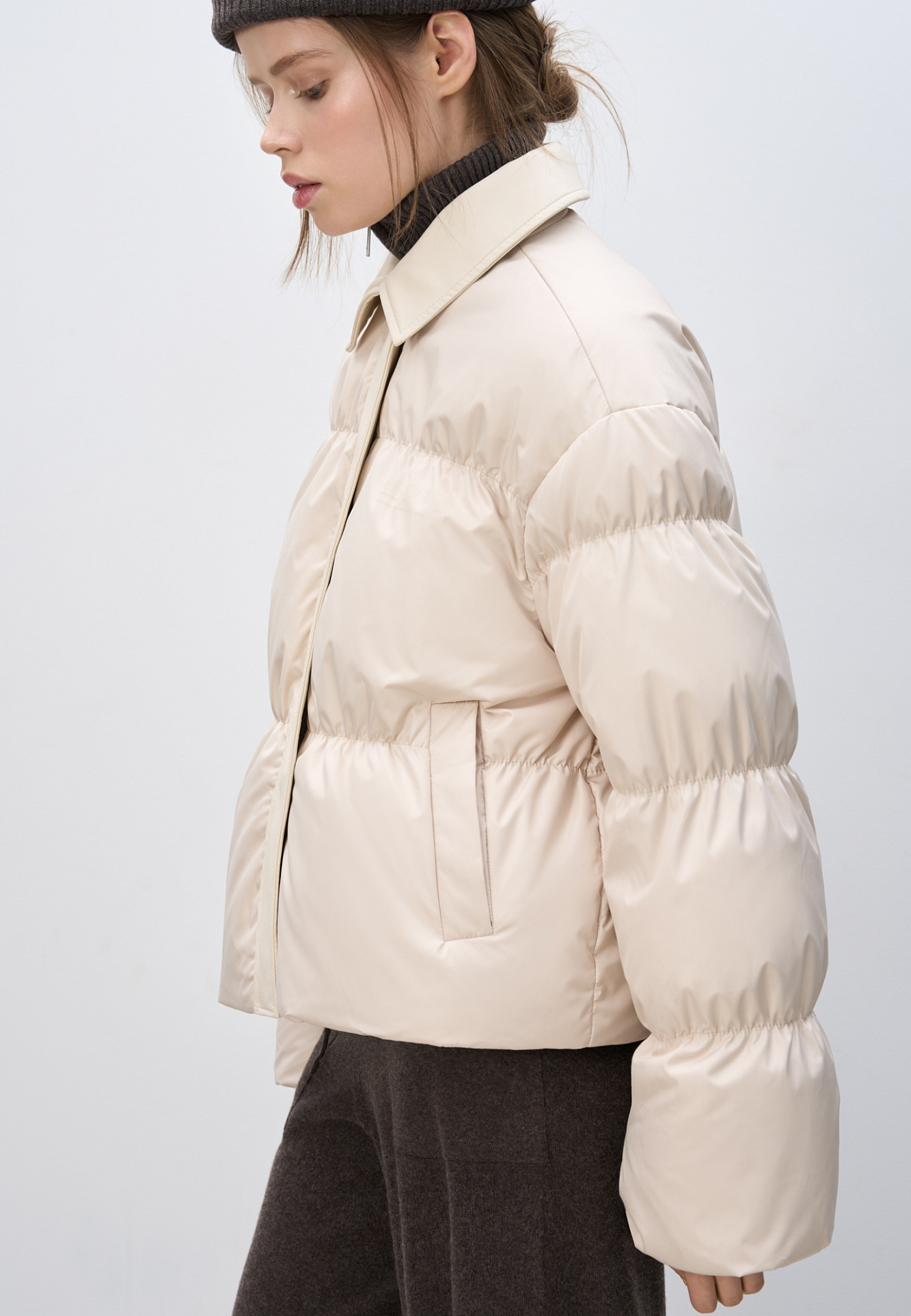 Пуховик с отложным воротником из экокожи