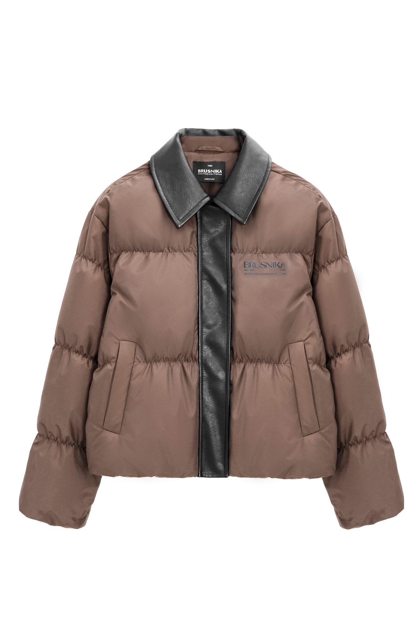 Стеганый пуховик с отложным воротником из экокожи. Модель свободного силуэта со спущенной линией плеч и боковыми карманами. Застежка на молнию и магнитные кнопки под вертикальной планкой из экокожи. Логотип на груди. Изделие выполнено на подкладке.