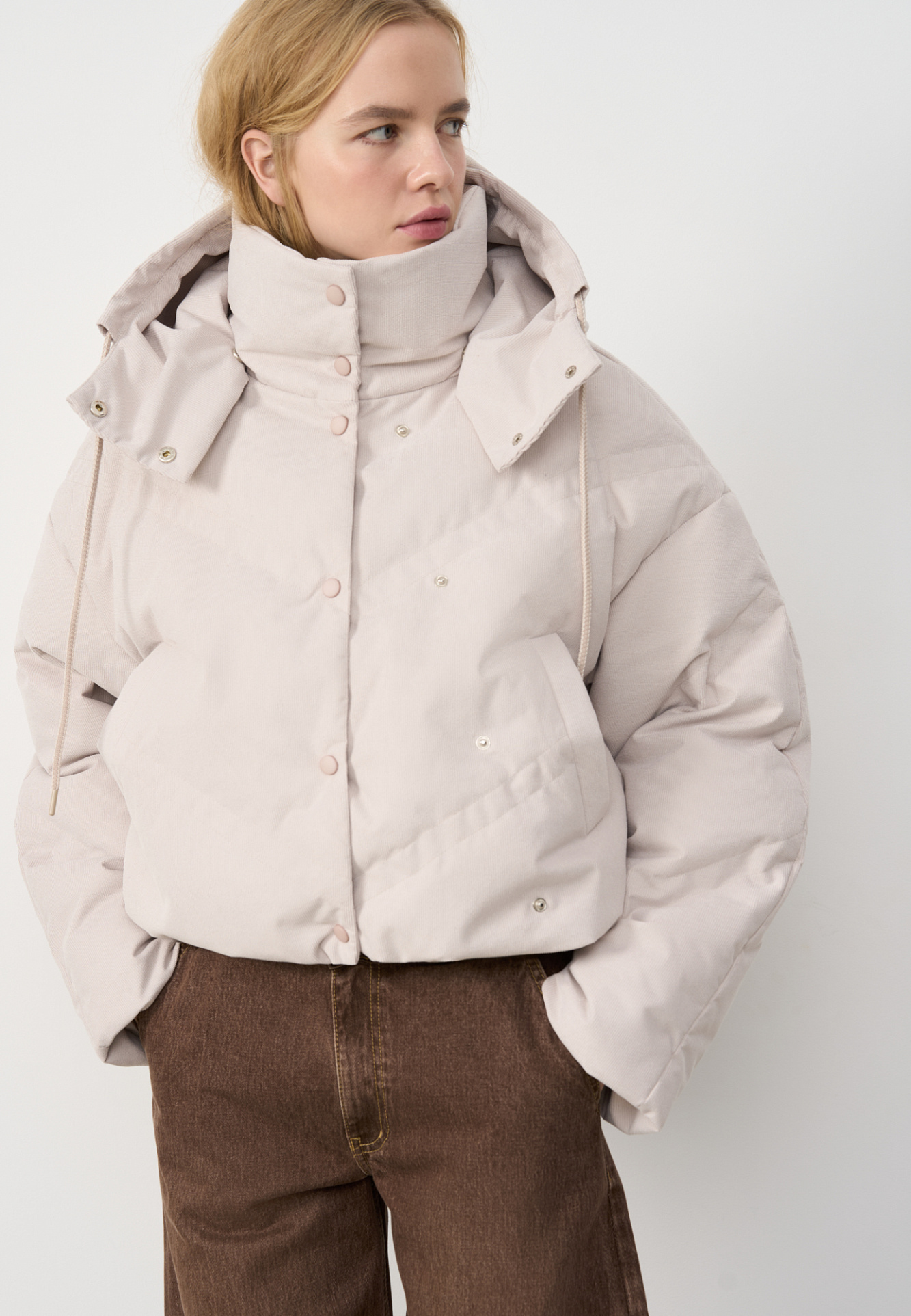 Пуховик с воротником-стойкой, съемным капюшоном и графичной стежкой с двойной отстрочкой. Модель имеет два варианта застежки на металлические кнопки. Низ изделия выполнен на кулиске.