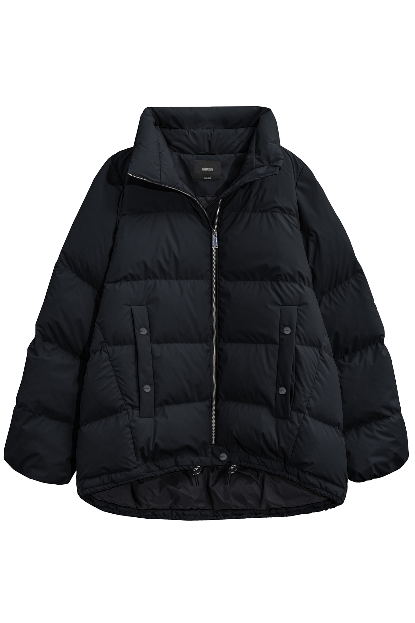 Объемный стеганый пуховик. Модель свободного силуэта с боковыми карманами на кнопках, воротником-стойкой и капюшоном. Низ изделия выполнен на регулируемой кулиске. Застежка на молнию и кнопку.