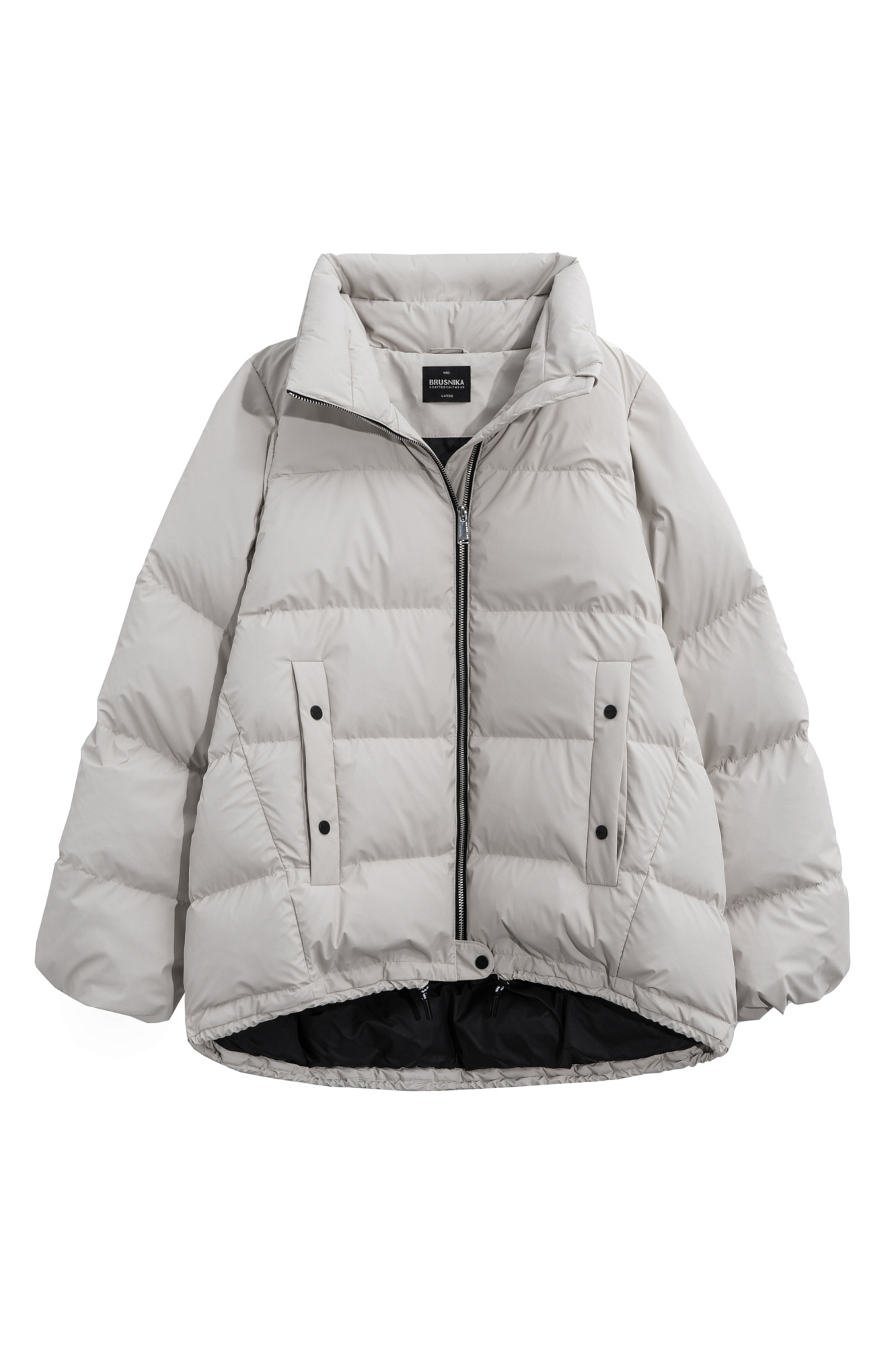 Объемный стеганый пуховик. Модель свободного силуэта с боковыми карманами на кнопках, воротником-стойкой и капюшоном. Низ изделия выполнен на регулируемой кулиске. Застежка на молнию и кнопку.