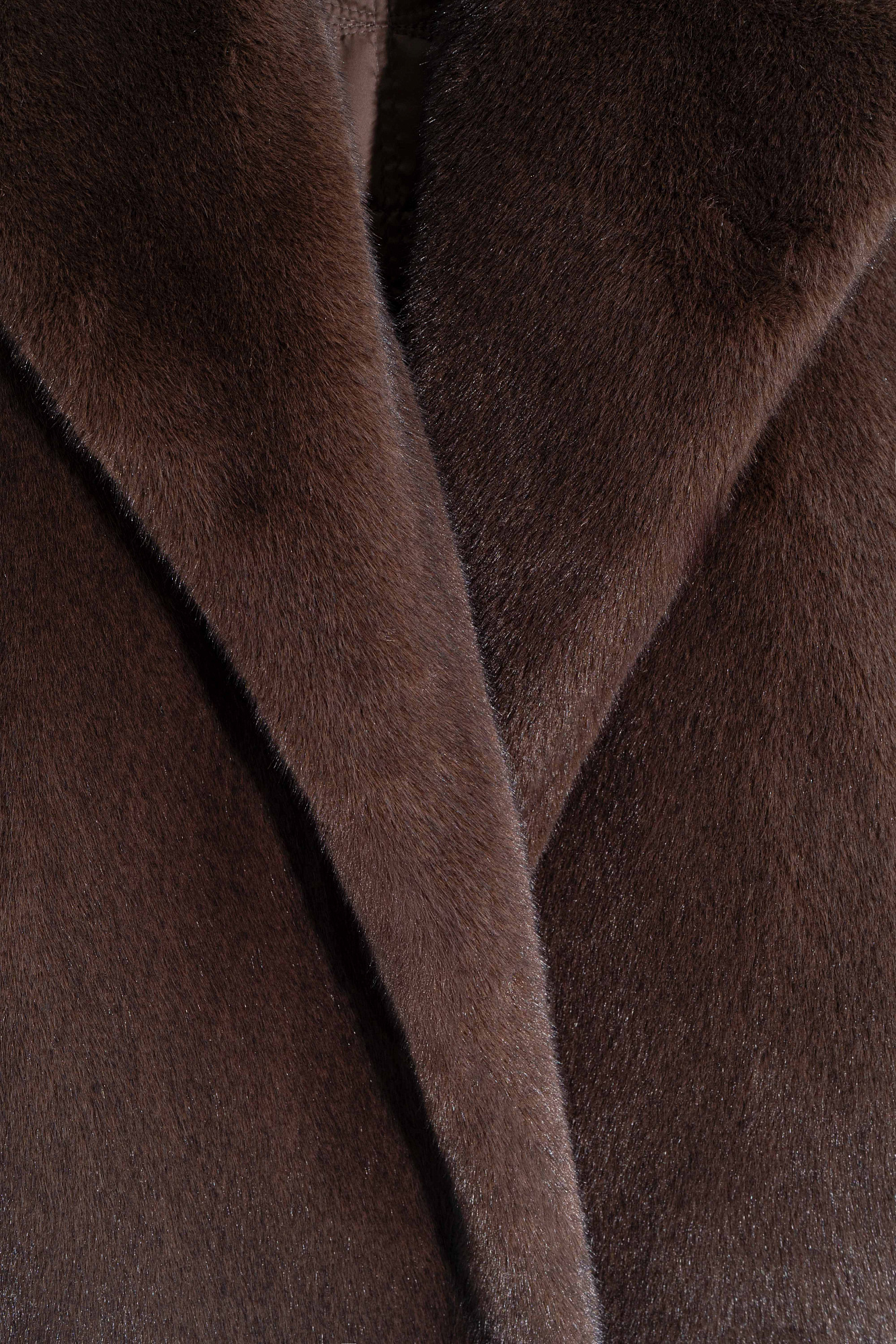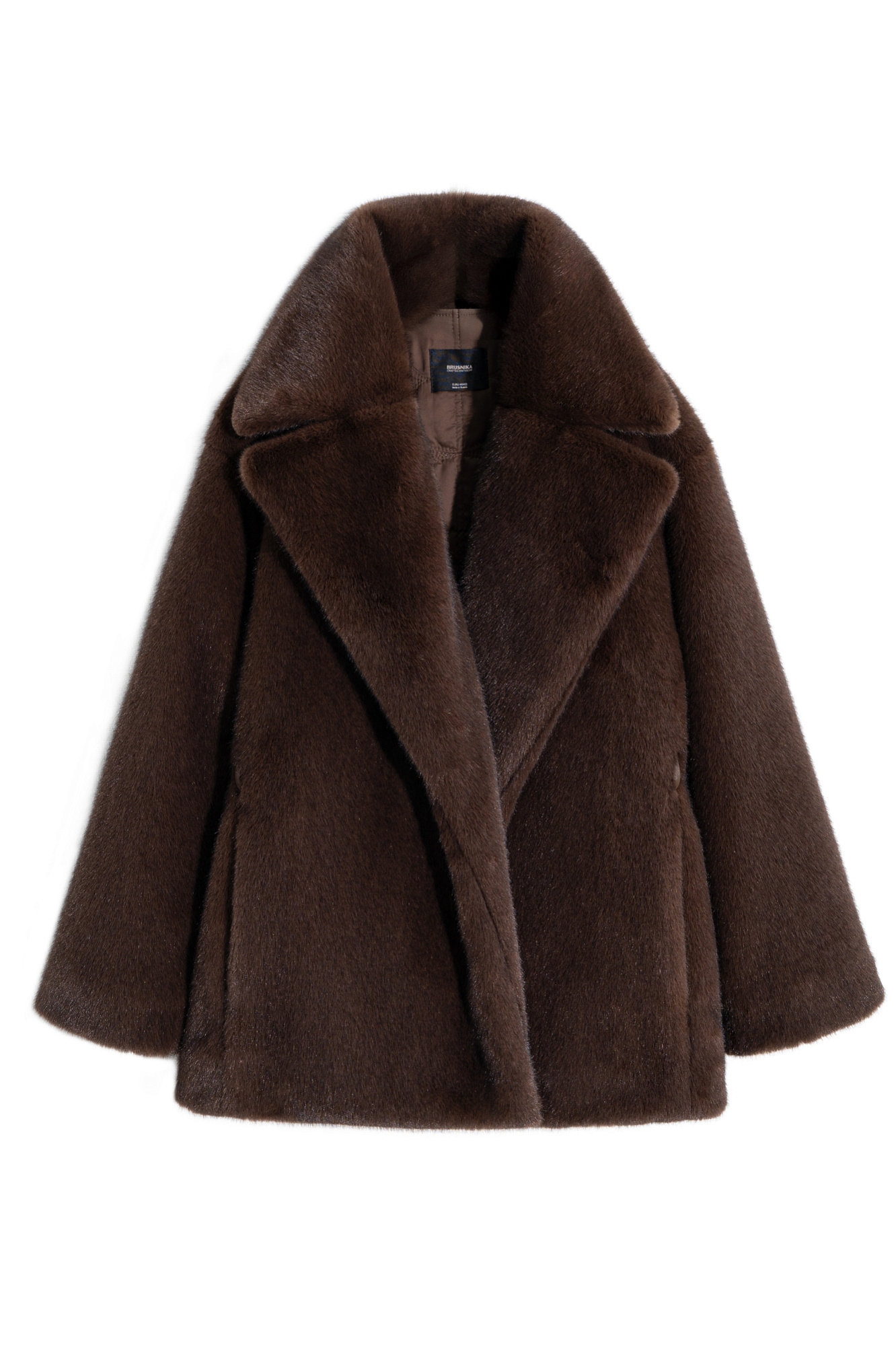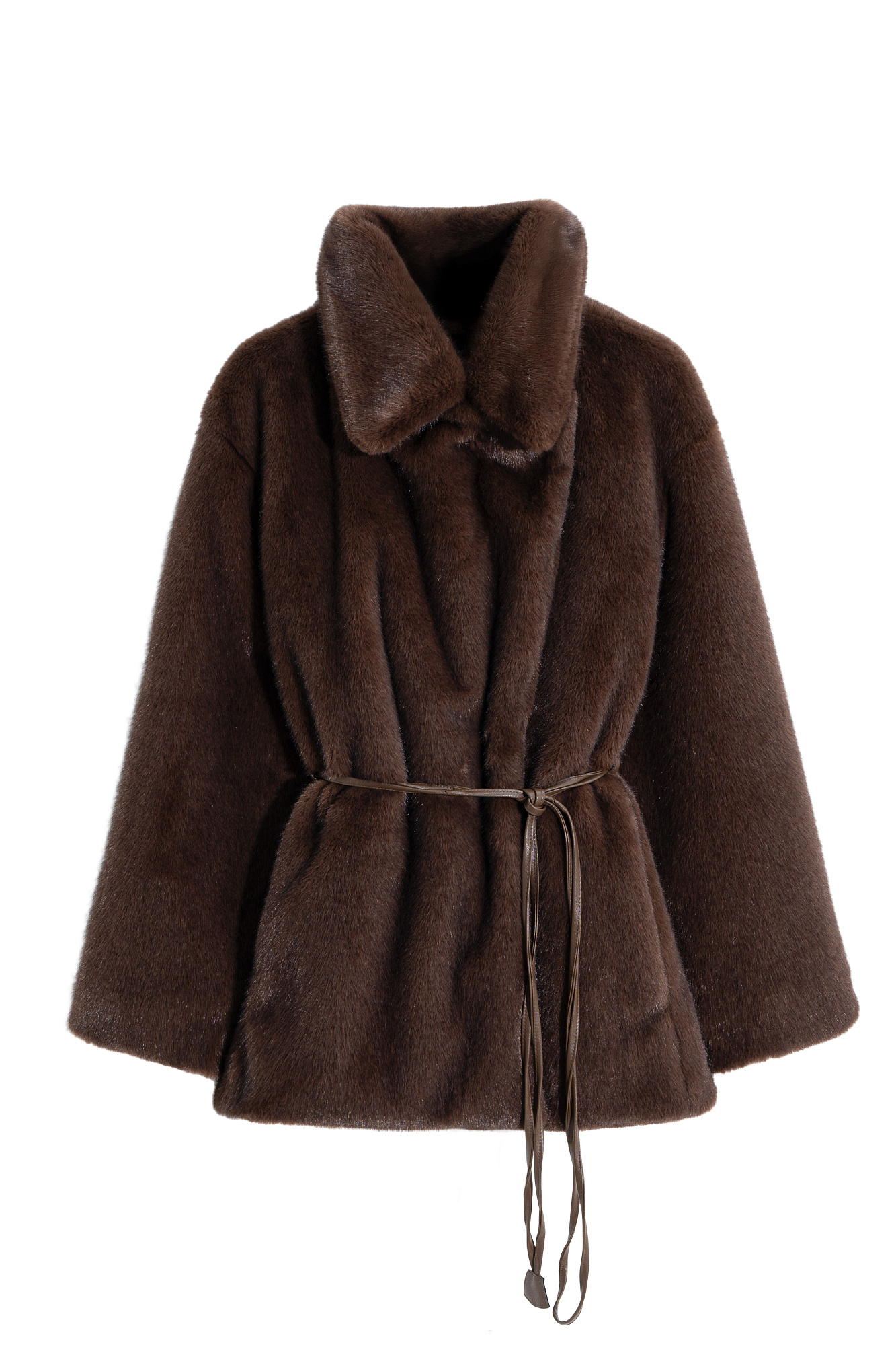Шуба из экомеха на запах. Модель с широким отложным воротником, шлевками для пояса из экокожи и врезными карманами. Изделие выполнено на подкладке.