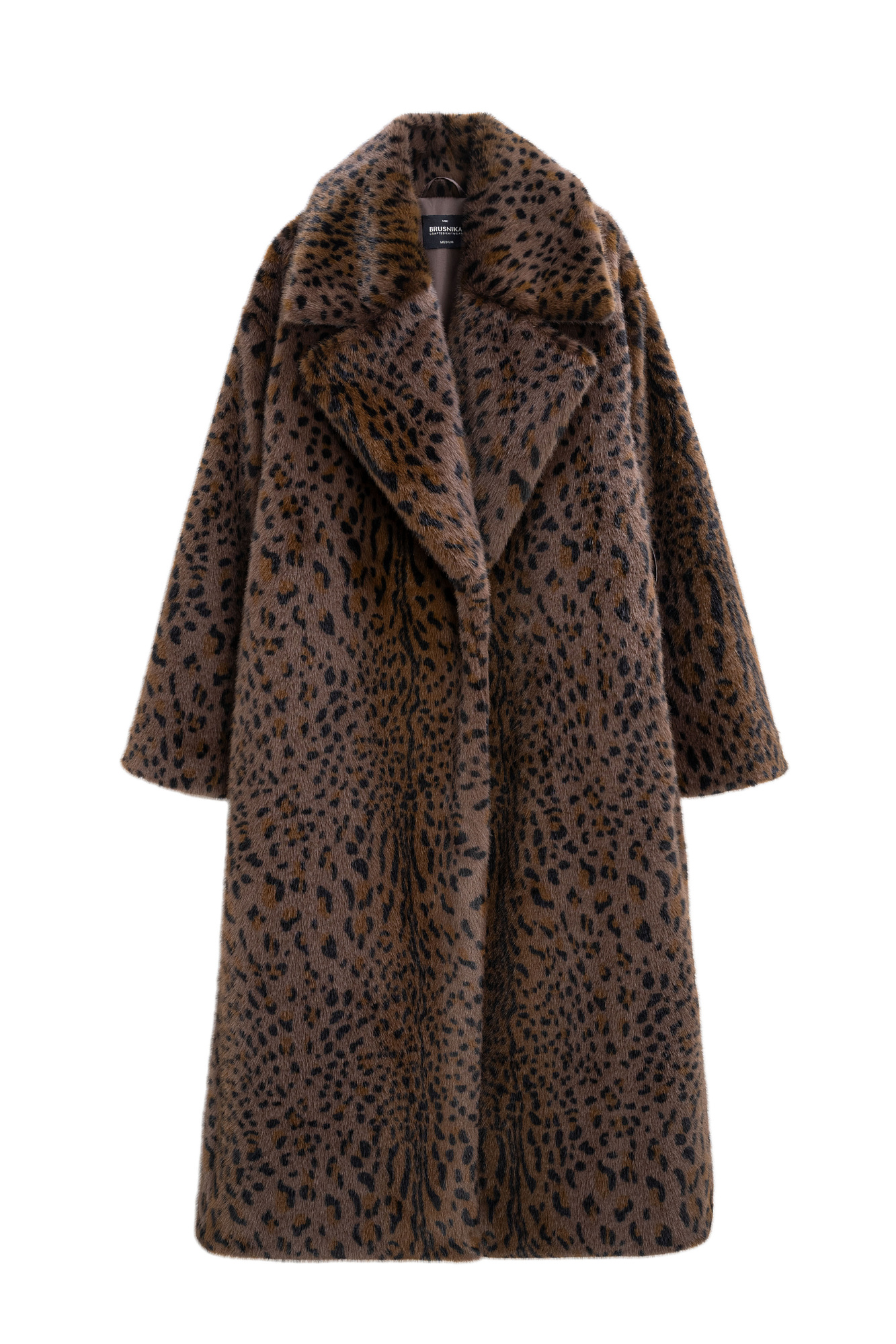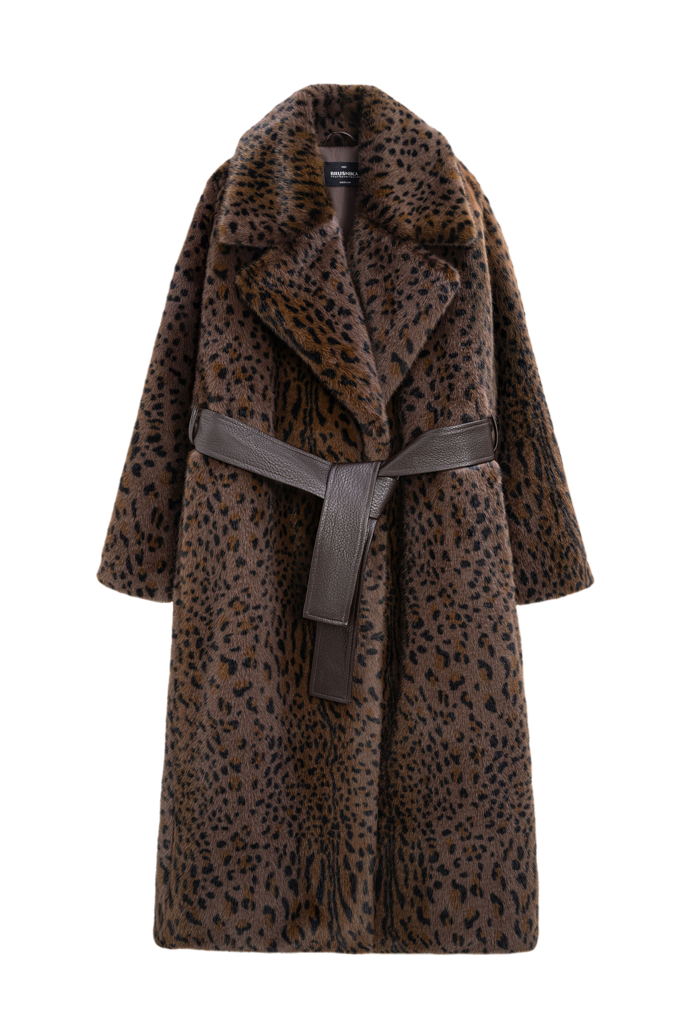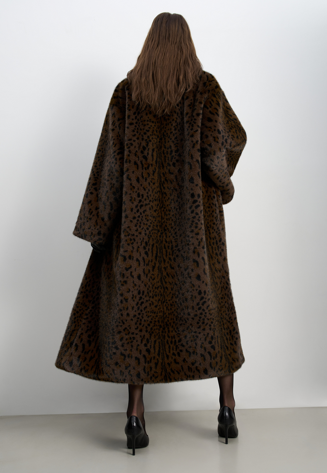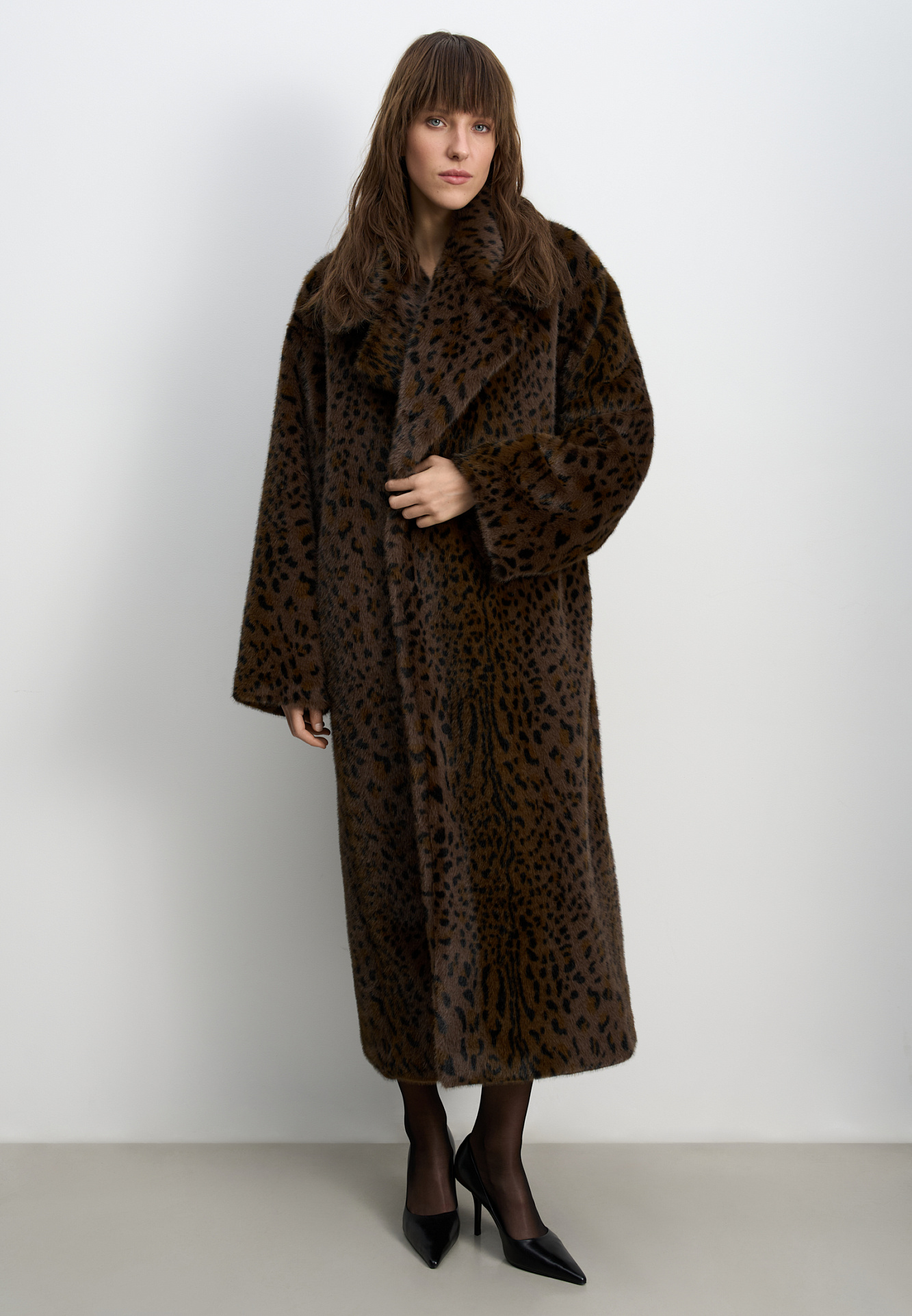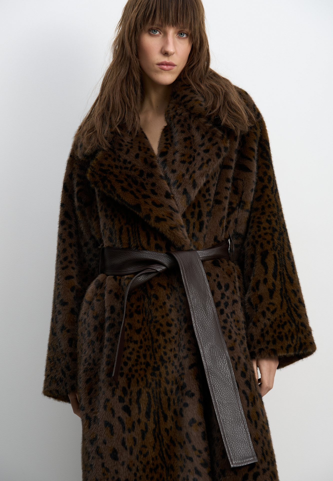 Длинная шуба из экомеха с анималистичным принтом, имитирующим окрас леопарда. Модель прямого кроя с широким отложным воротником и шлевками на поясе. Широкий пояс из экокожи в комплекте.