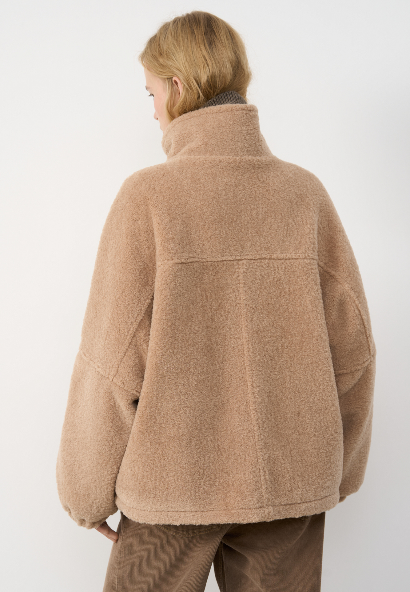 Шуба из экомеха с воротником-стойкой. Модель свободного силуэта с боковыми карманами, объемными швами и манжетами на резинке. Застежка на молнию под планкой с кнопками, декорированной экокожей.
