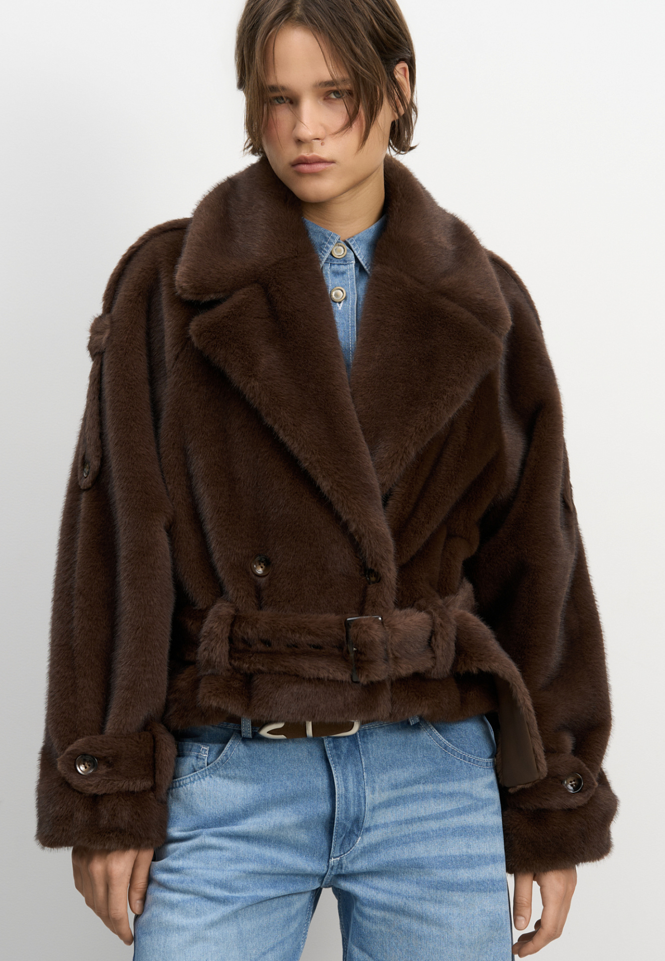 Короткая двубортная шуба из экомеха. Модель прямого кроя с широким отложным воротником. Изделие декорировано эполетами на плечах, широким поясом с пряжкой на талии и манжетах рукавов. Застежка на пуговицы. Изделие на подкладке.