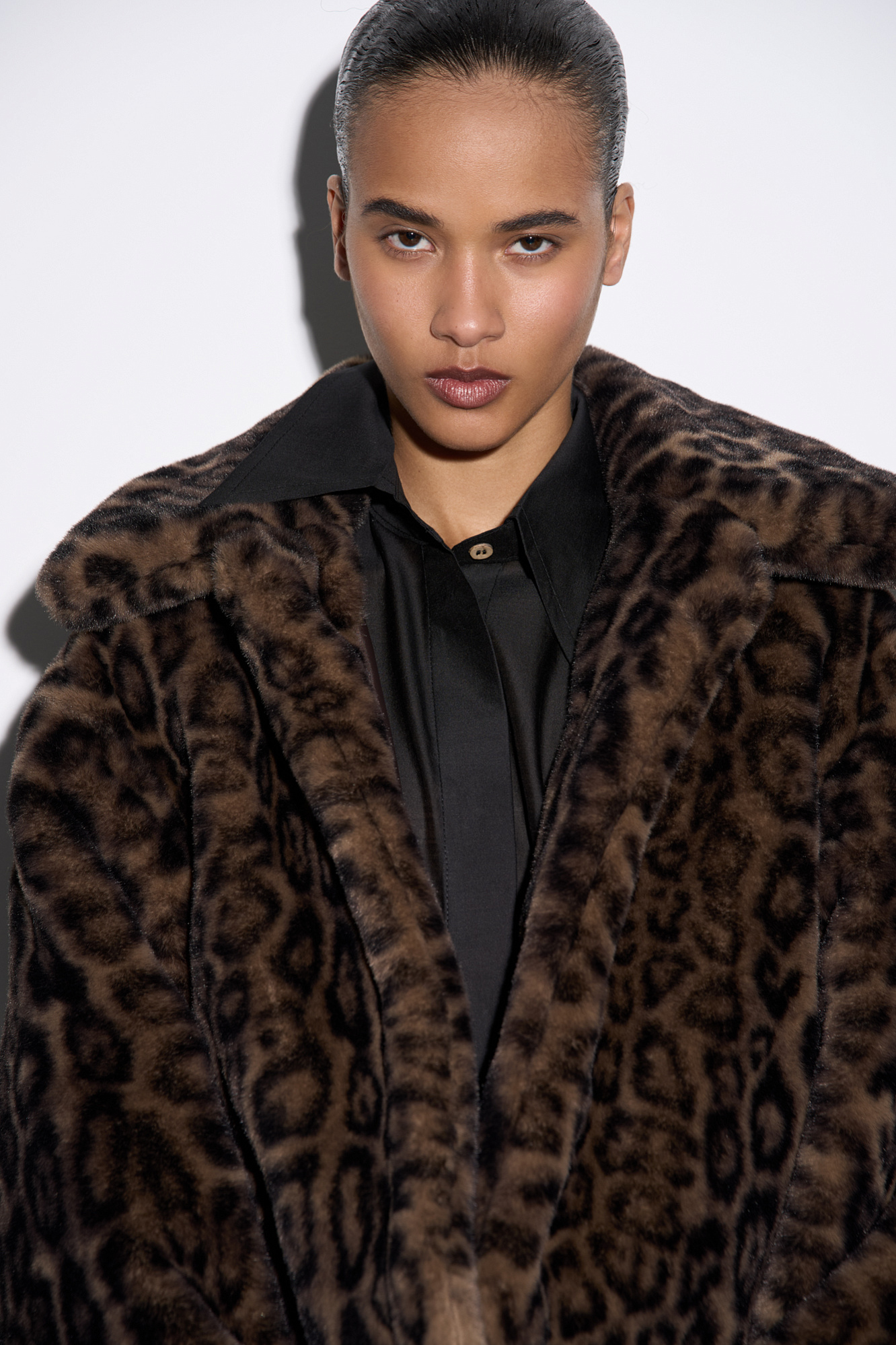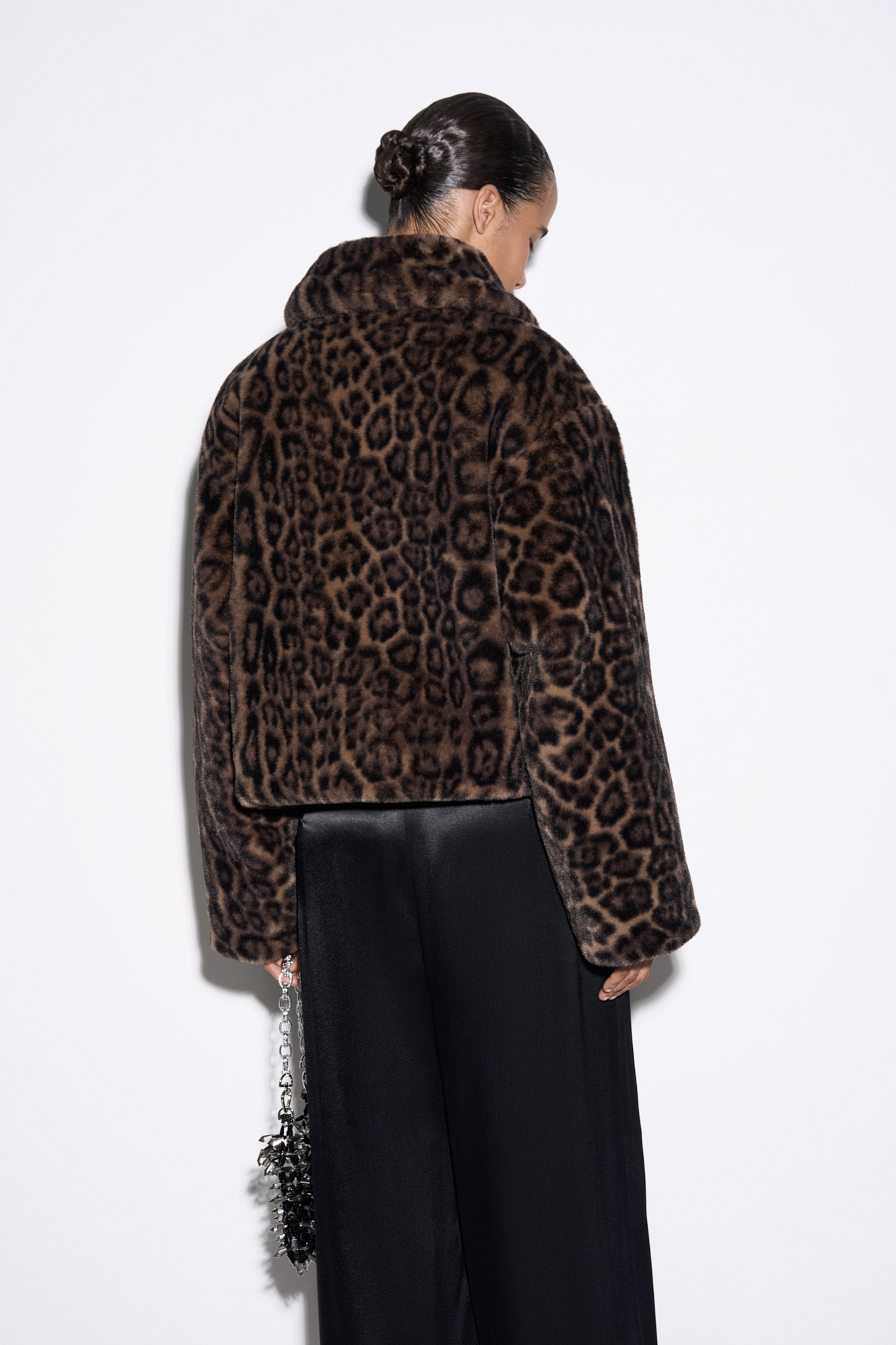 Короткая шуба из экомеха с анималистичным принтом, имитирующим окрас леопарда. Модель прямого кроя с отложным воротником и карманами. Застежка на потайные кнопки под планкой. Низ изделия выполнен на кулиске.