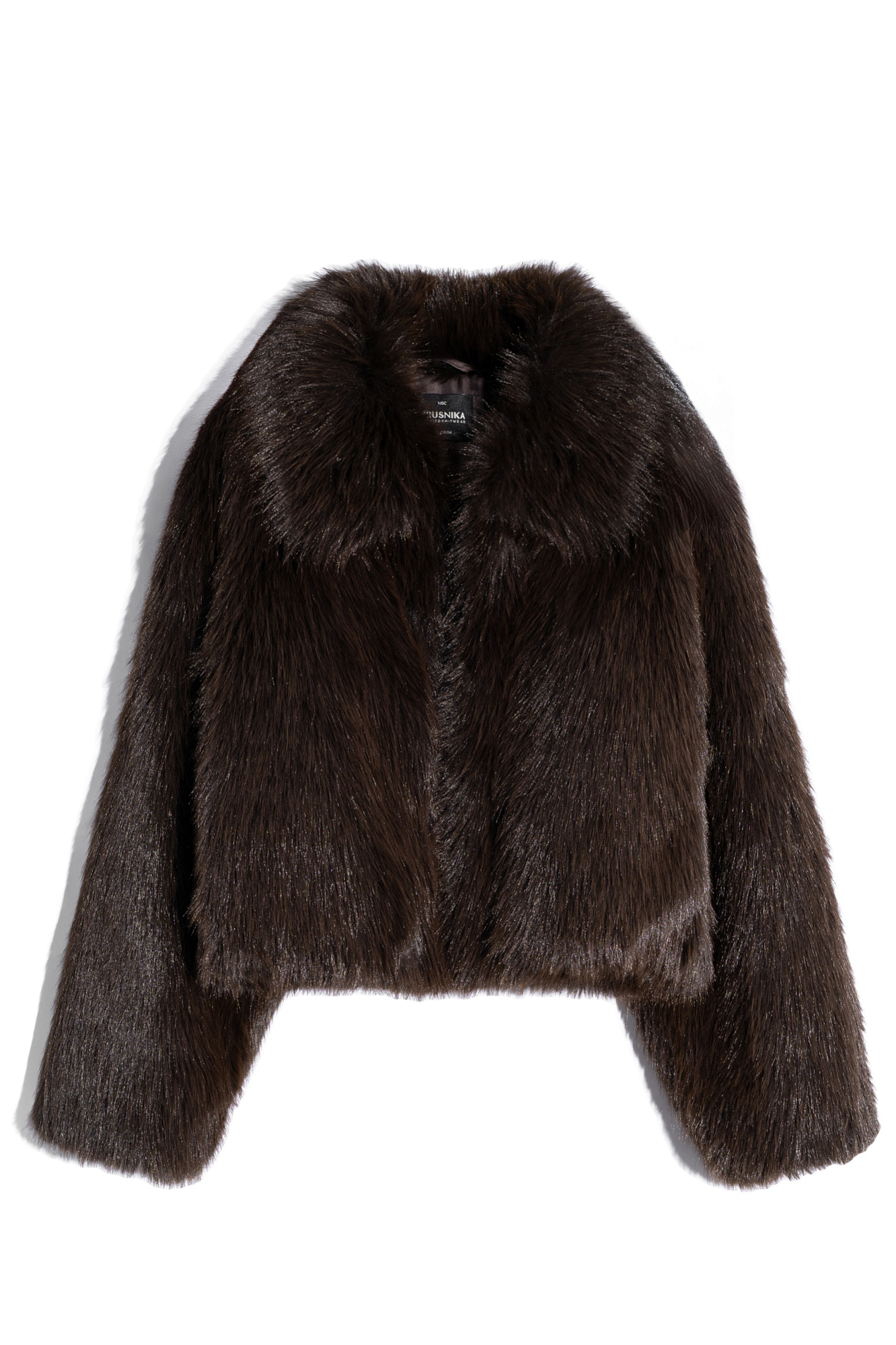 Короткая шуба из экомеха. Модель прямого кроя с отложным воротником и врезными карманами. Застежка на четыре скрытых шубных крючка. Низ изделия выполнен на кулиске.