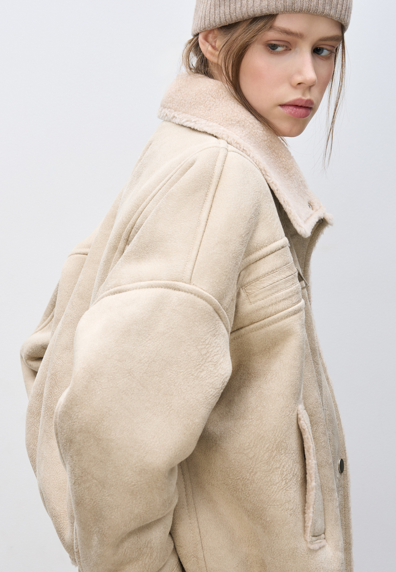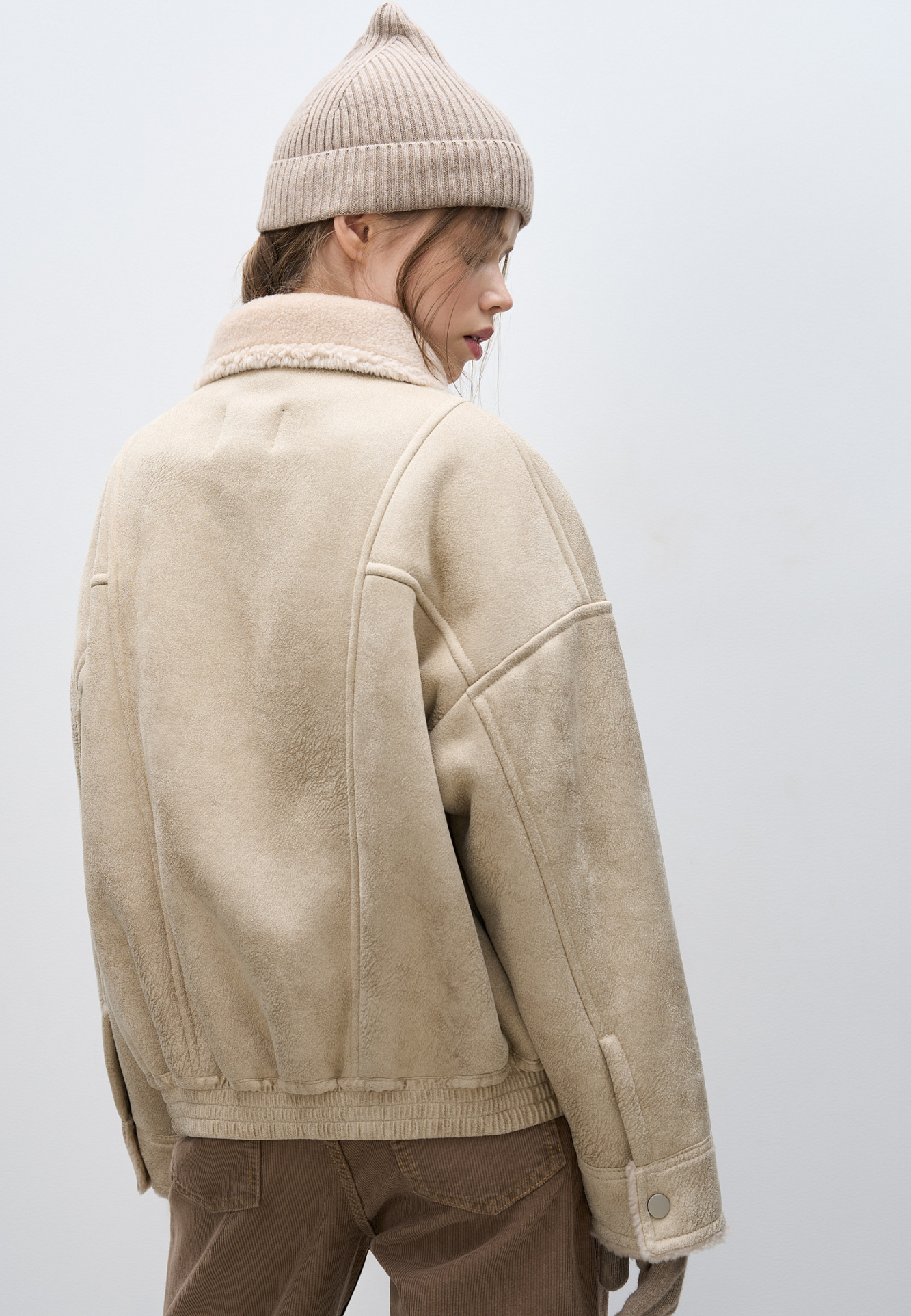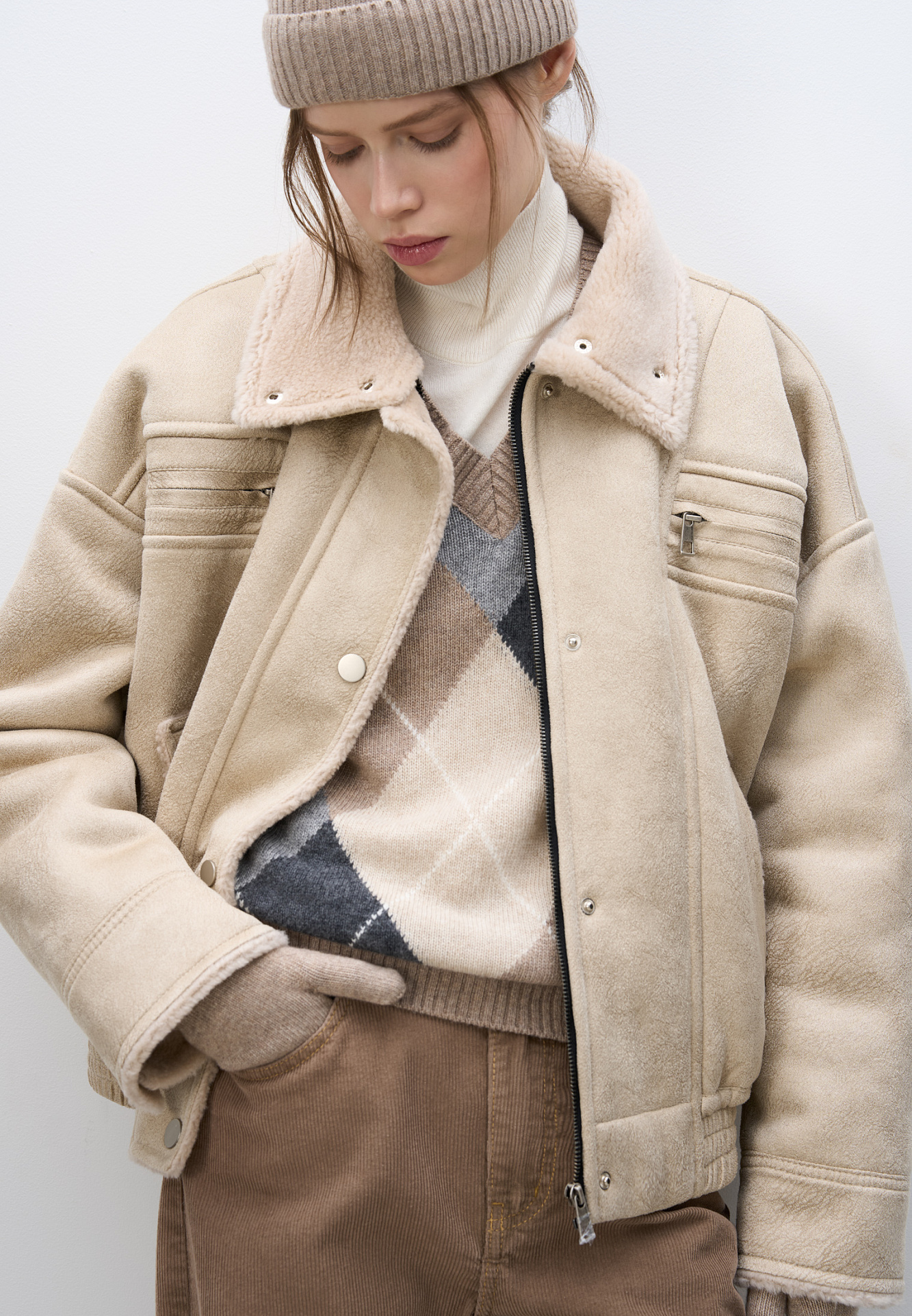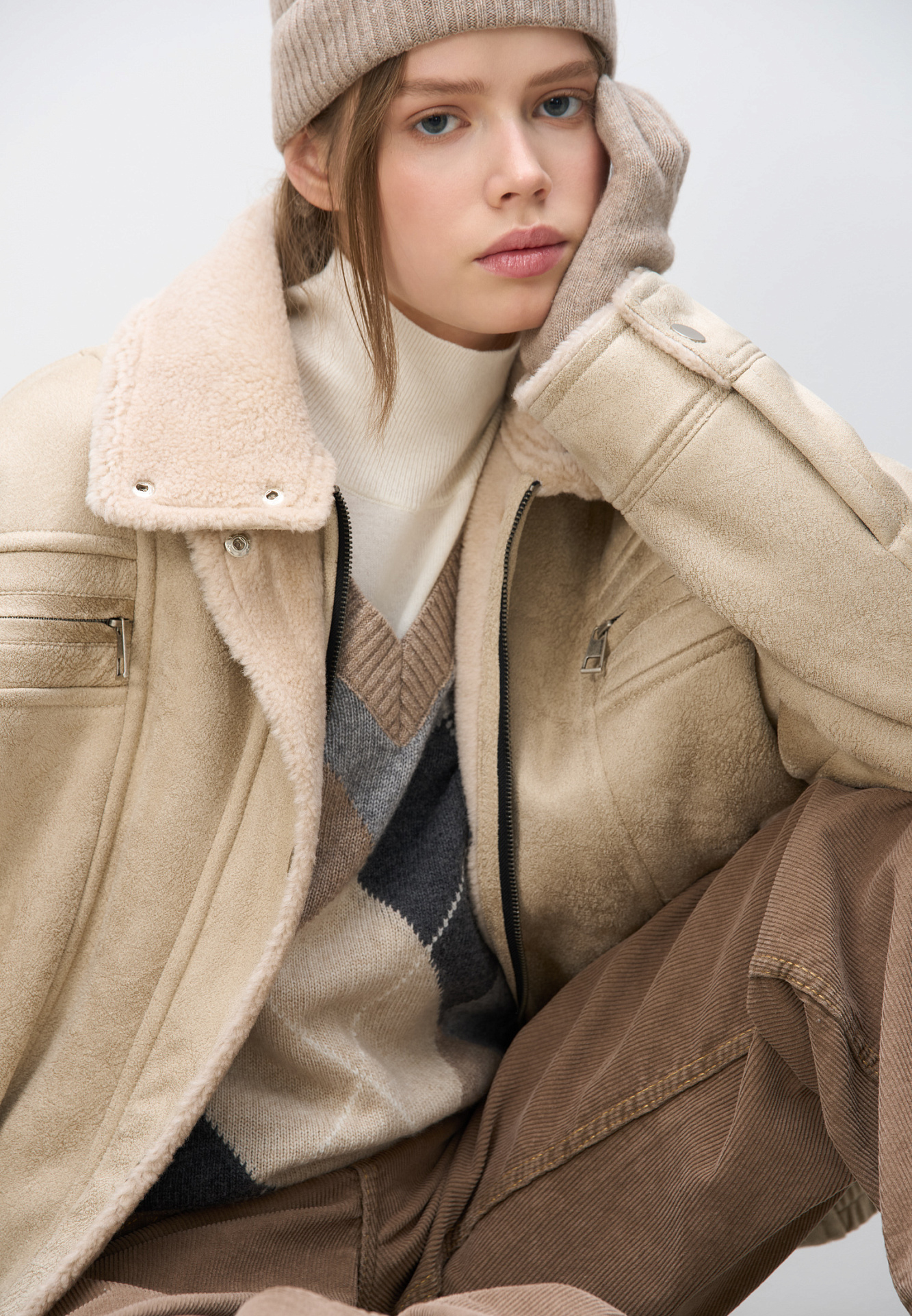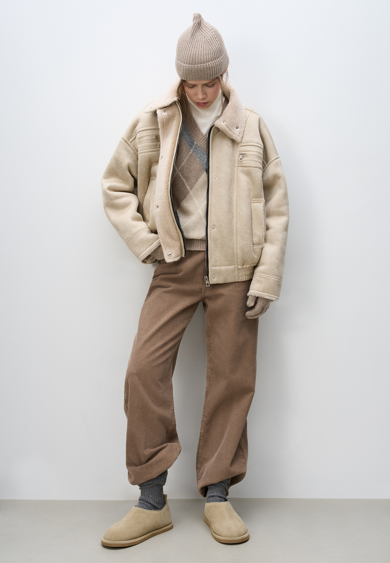 Шерстяной бомбер с воротником-стойкой. Модель свободного силуэта со спущенной линией плеча, манжетами на кнопках, нагрудными карманами на молниях и боковыми карманами. Низ изделия выполнен на резинке. Застежка на молнию под планкой с кнопками.