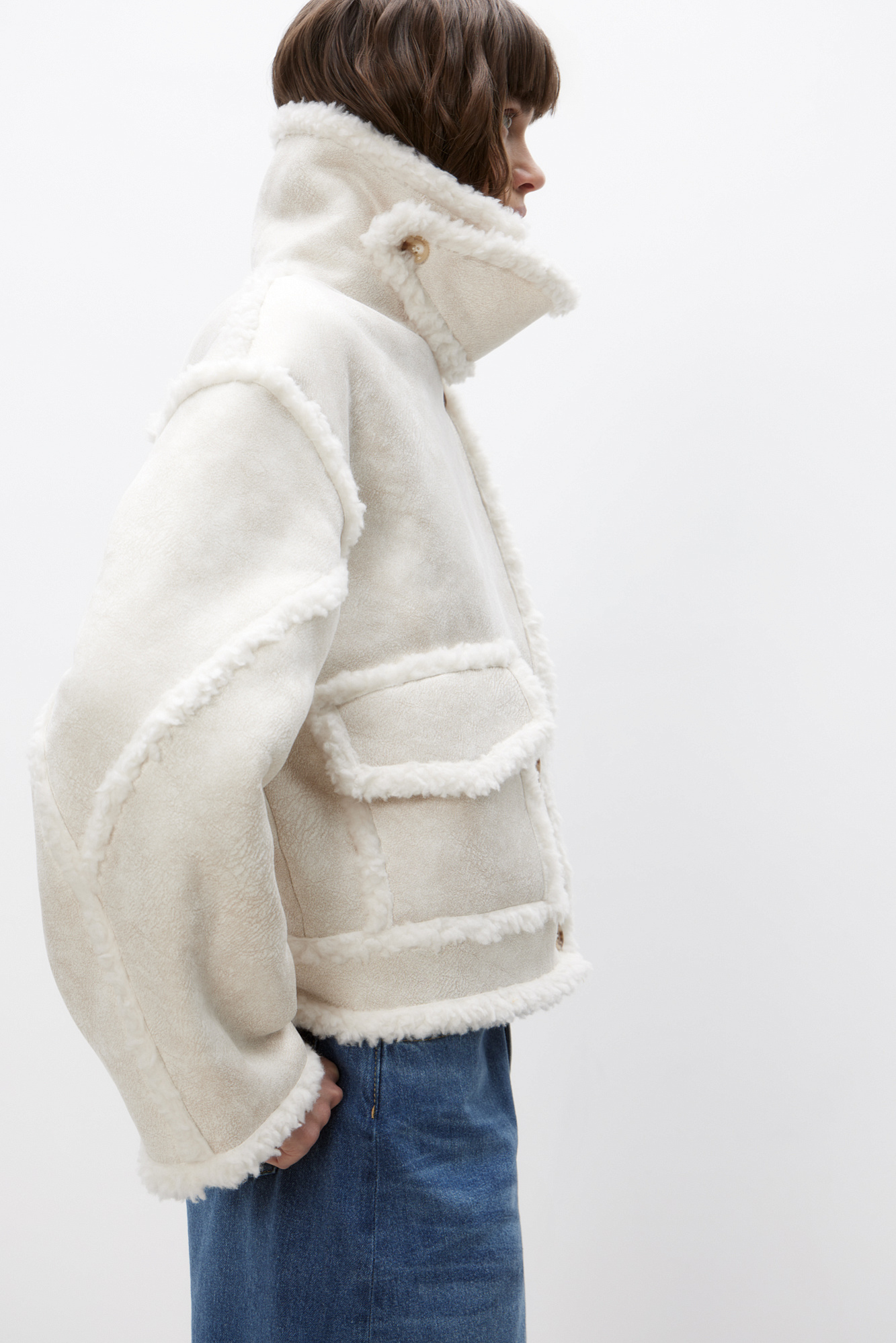 Укороченная дубленка из шерсти с накладными карманами. Модель приталенного силуэта со спущенной линией плеча, брендированным ярлыком на спине и отстегивающимся воротником. Застежка на пуговицы.