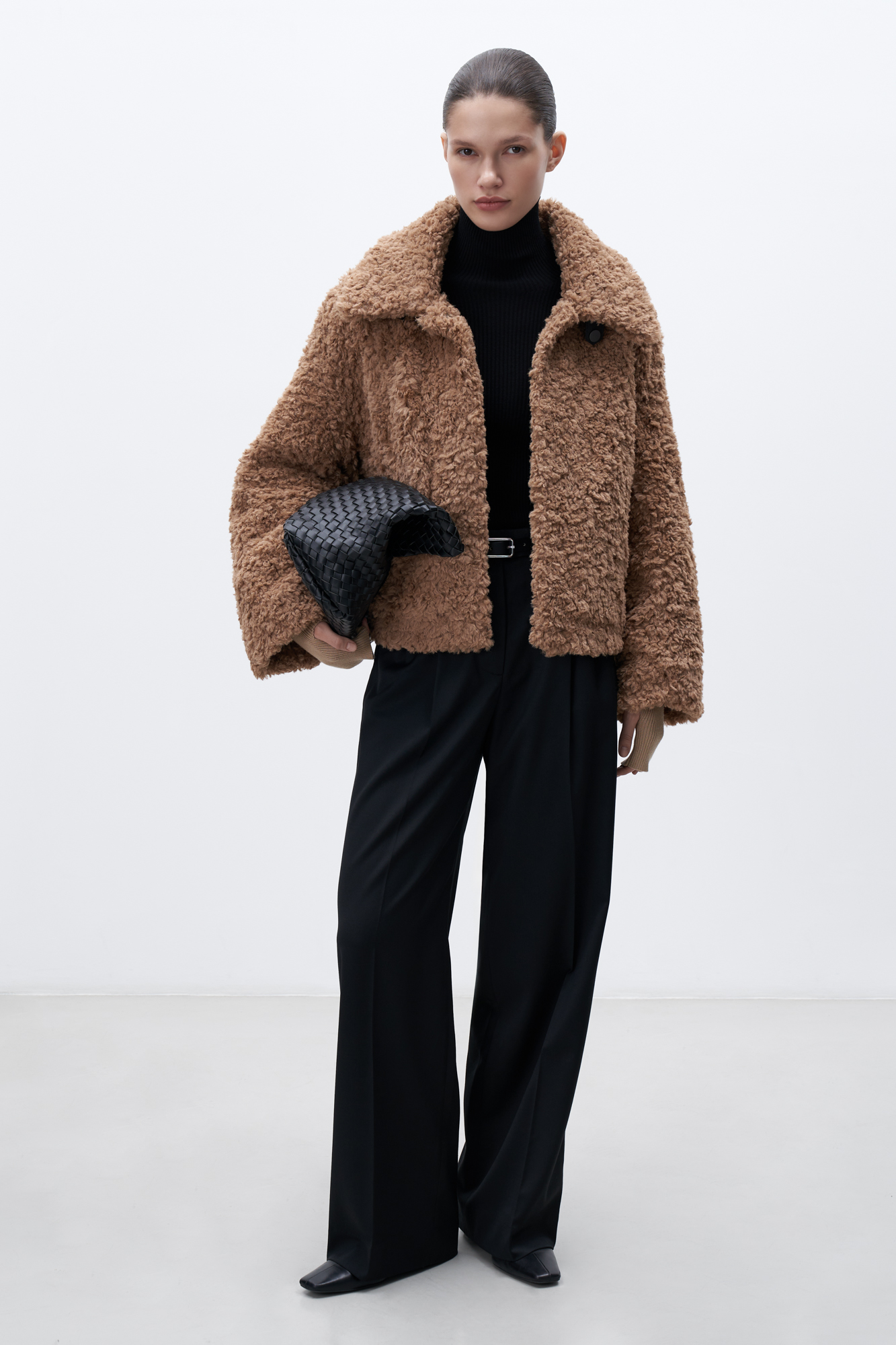 Короткая шуба из искусственного меха с отложным воротом. Застежка на кнопки под планкой. Длинные рукава с трикотажными митенками.